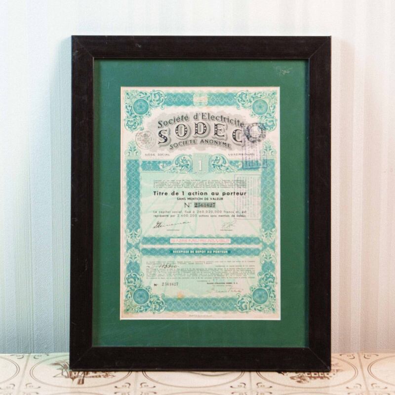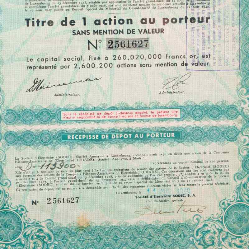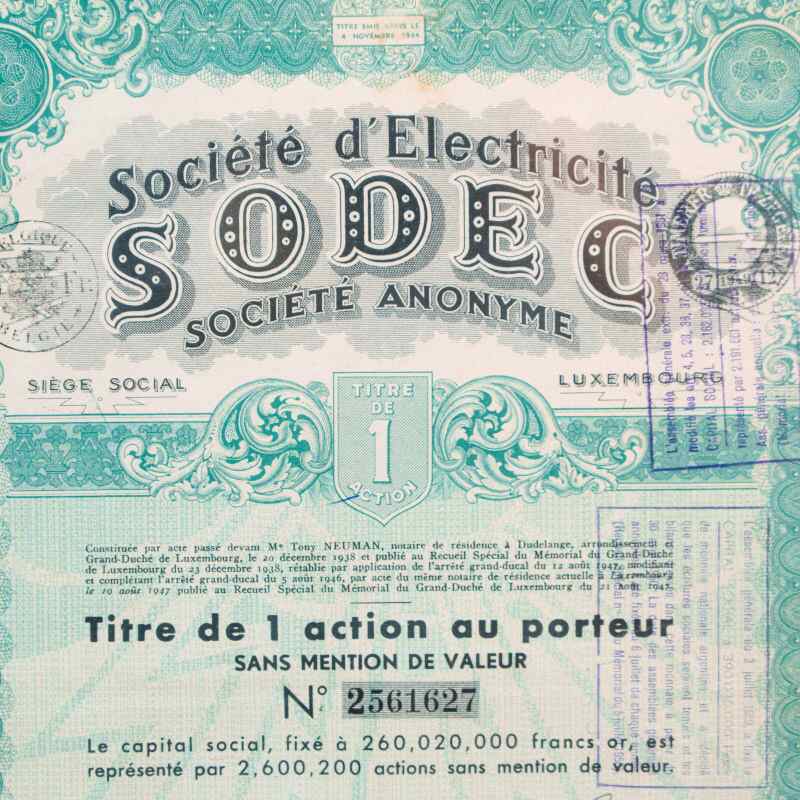 Элегантно оформленная старинная ценная бумага Societe d’Electricite SODEC представляет собой интересный образец европейской финансовой и промышленной истории. Компания Société d’Electricité (SODEC) была зарегистрирована в Люксембурге 20 декабря 1938 года. Согласно официальному люксембургскому акту 1939 года, в неё был внесён актив Compania Hispano-Americana de Electricidad, что связывает SODEC с электроэнергетическим сектором и международными корпоративными структурами того времени.