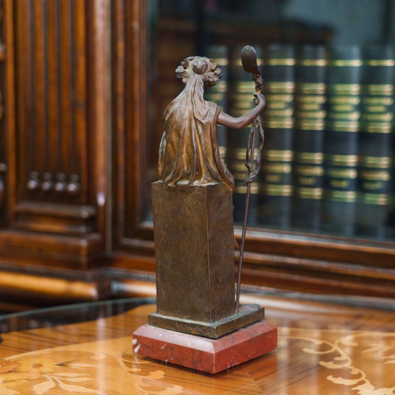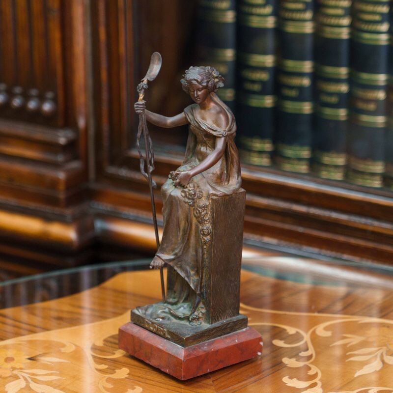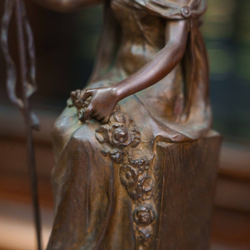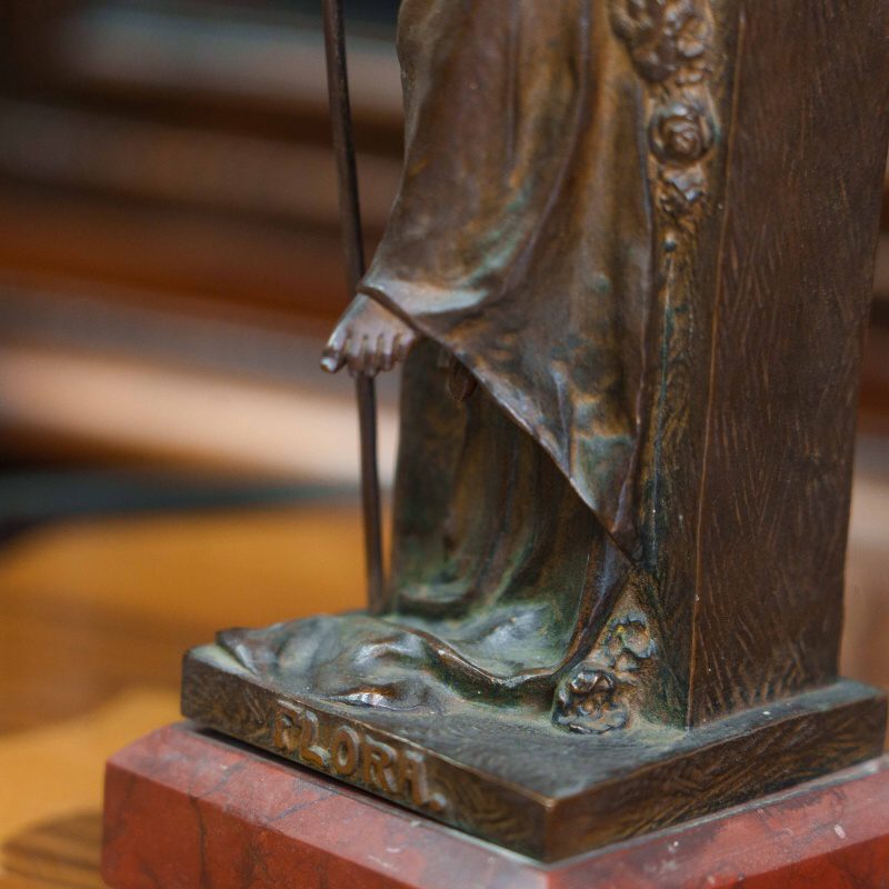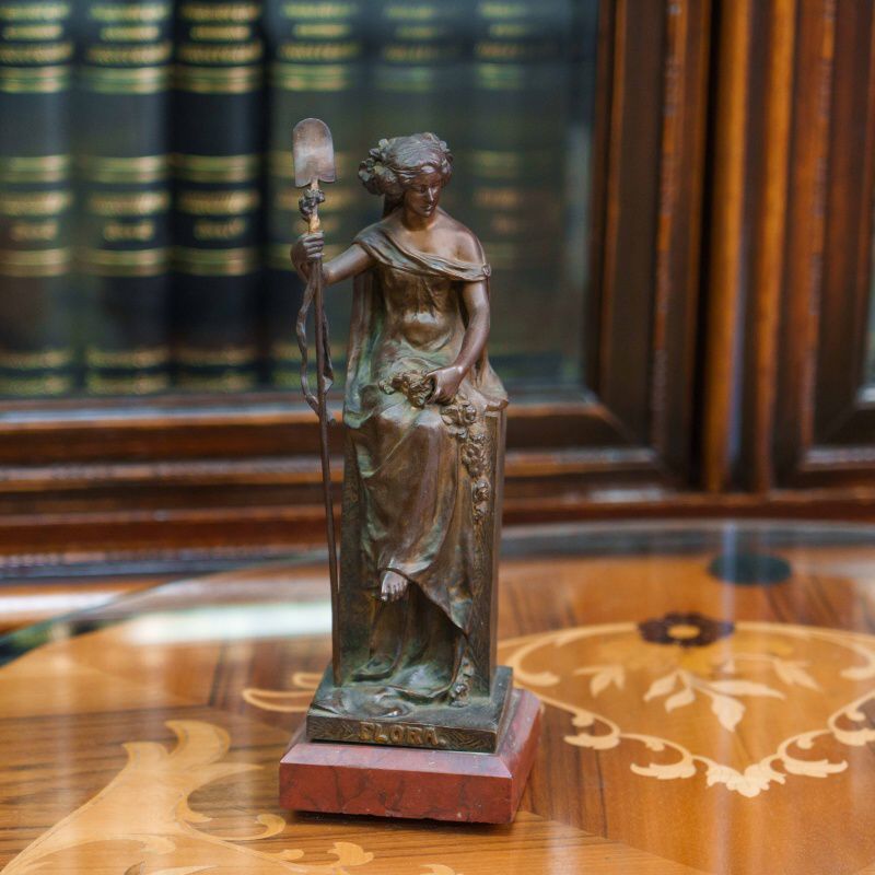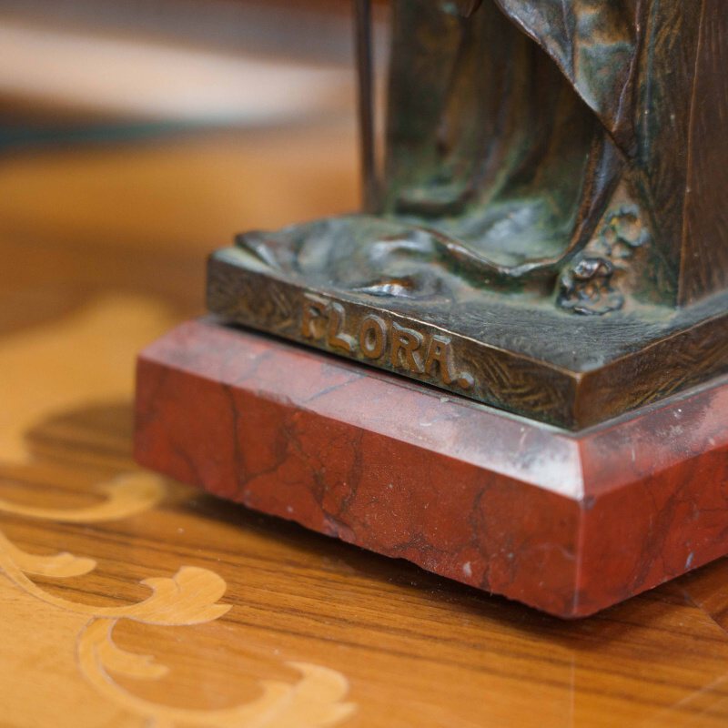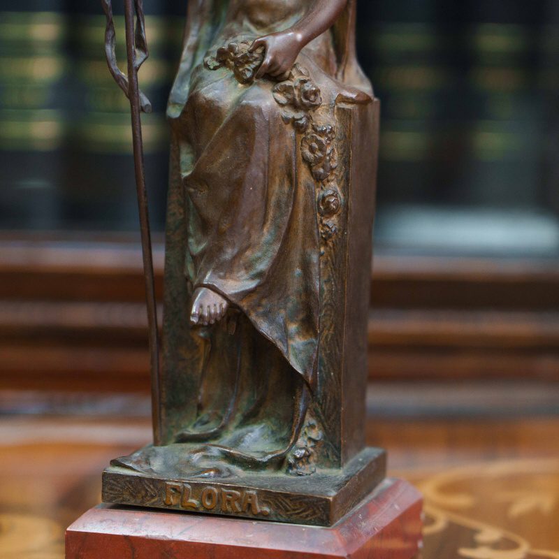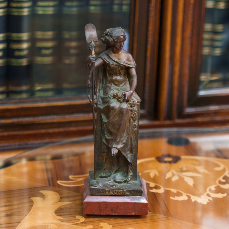 Бронзовая скульптура «Флора» изображает древнеримскую богиню цветов и весны — олицетворение обновления природы и жизненной силы. Флора изображена в виде молодой девушки, одетой в свободное ниспадающее платье и сидящей на высоком прямоугольном постаменте. В одной руке она держит цветочную гирлянду, в другой — изящный жезл, символизирующий заботу о земле и росте. Плавные линии силуэта и мягко ниспадающие складки одежды создают ощущение легкости и гармонии. Лицо отличается тонкой проработкой и передаёт задумчивое, умиротворённое выражение. Дополнительный декоративный акцент создают цветочные элементы — венок в волосах и гирлянды, украшающие фигуру и постамент.