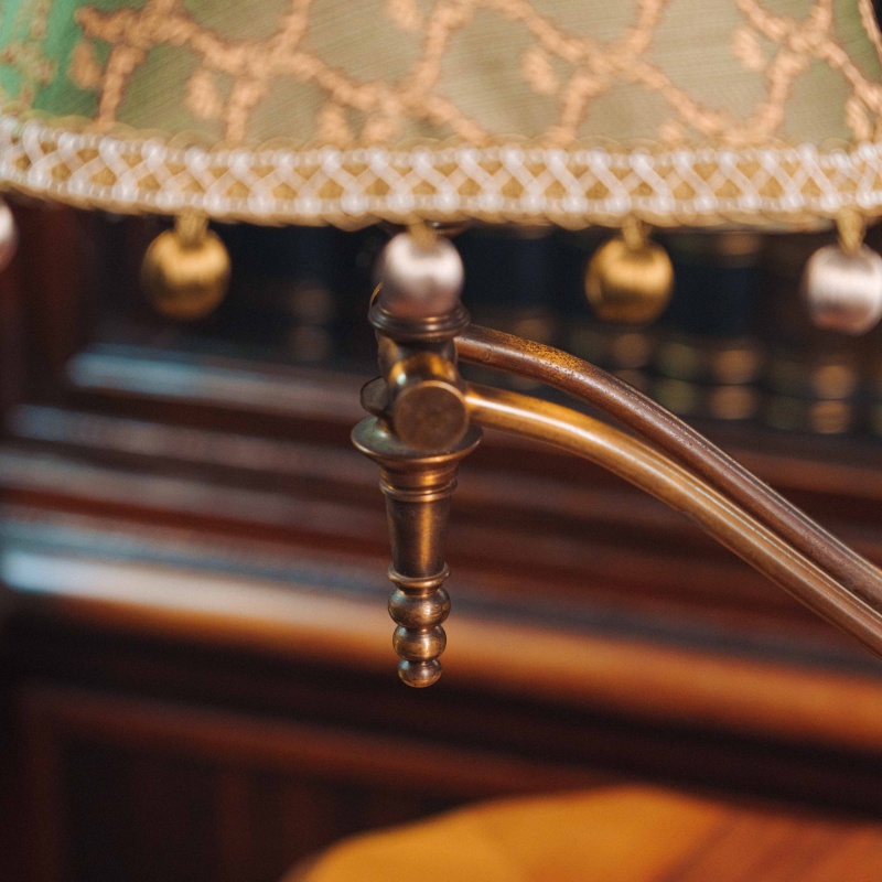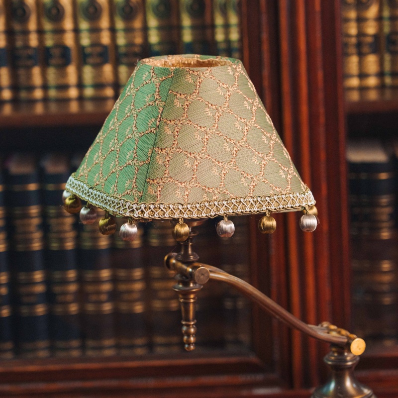 Абажур из текстиля мягкого зелёного оттенка украшен декоративным узором и бахромой, создавая тёплый рассеянный свет и атмосферу уюта. Лампа гармонично впишется в интерьер кабинета, библиотеки или гостиной.