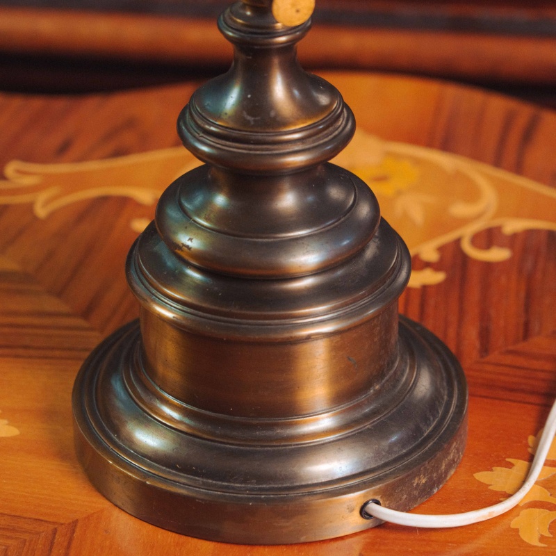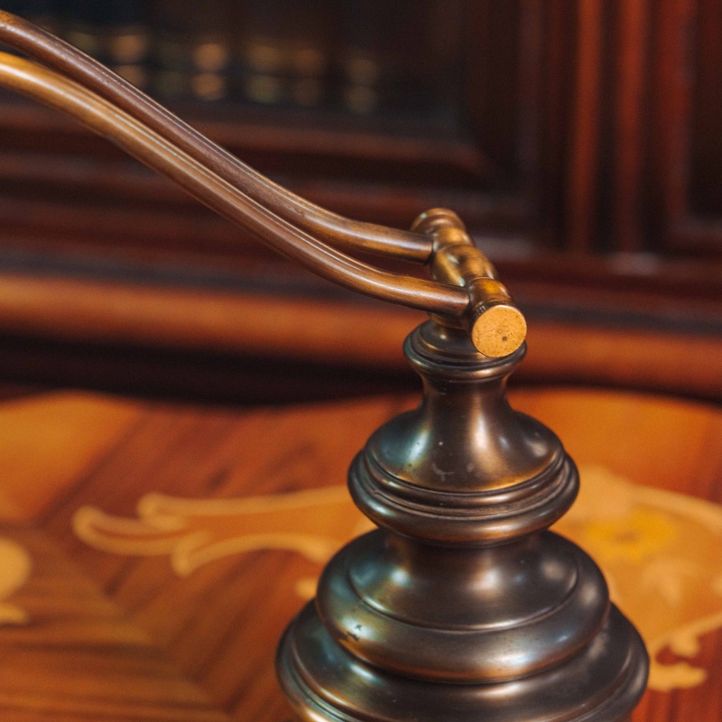 Основание выполнено из металла с благородной патиной, форма отличается классическими пропорциями и устойчивостью. Поворотный рычаг придаёт лампе особую функциональность и делает её практичным элементом интерьера.