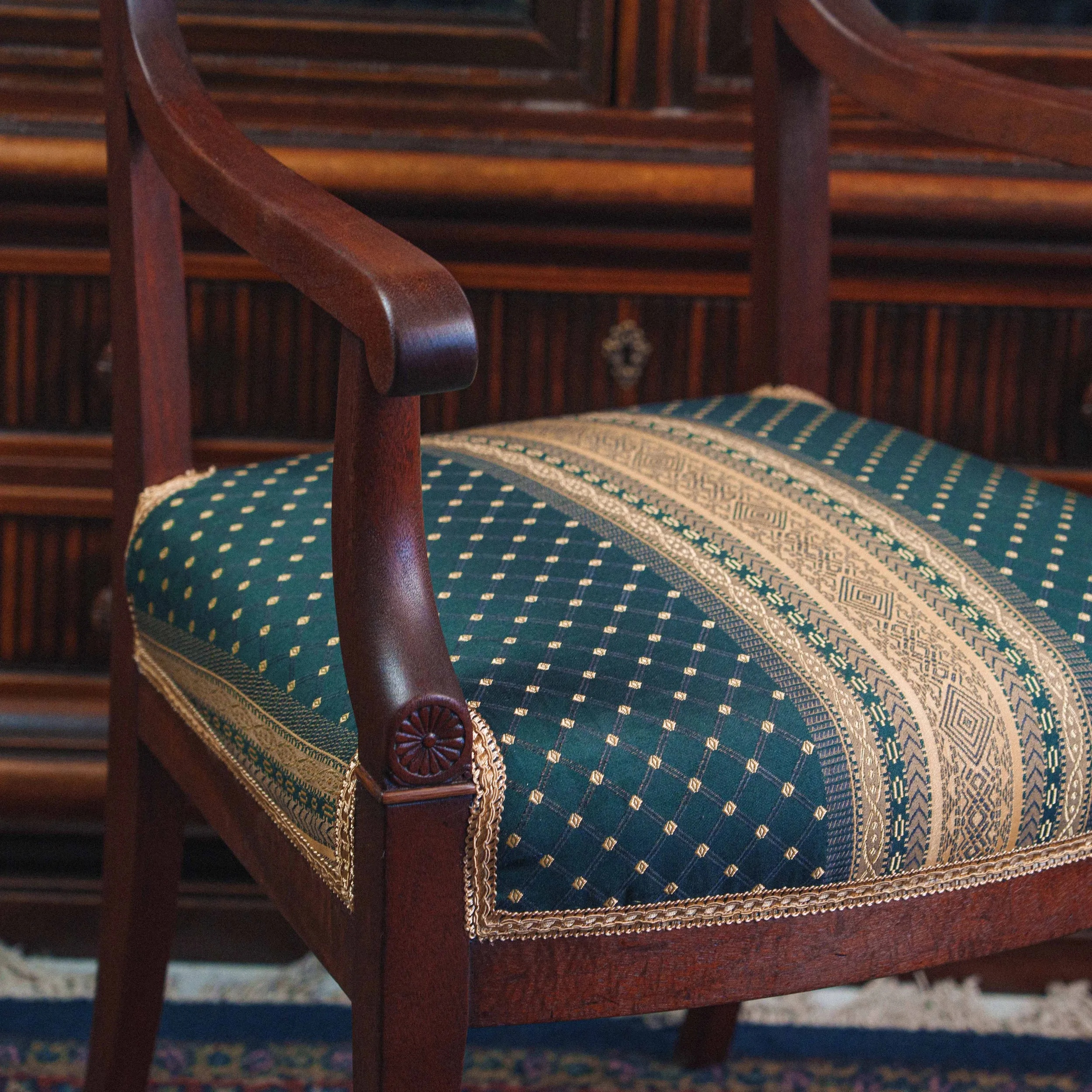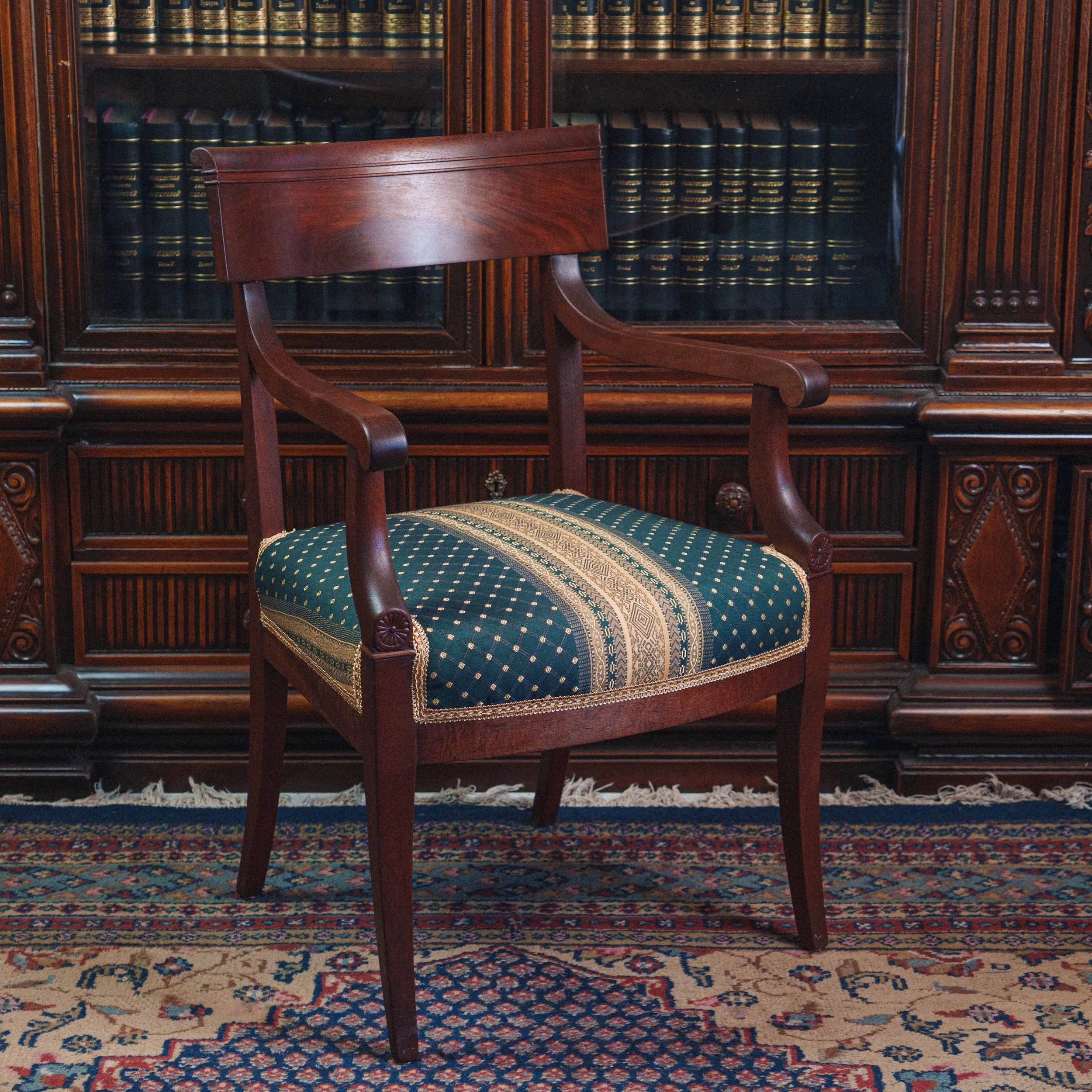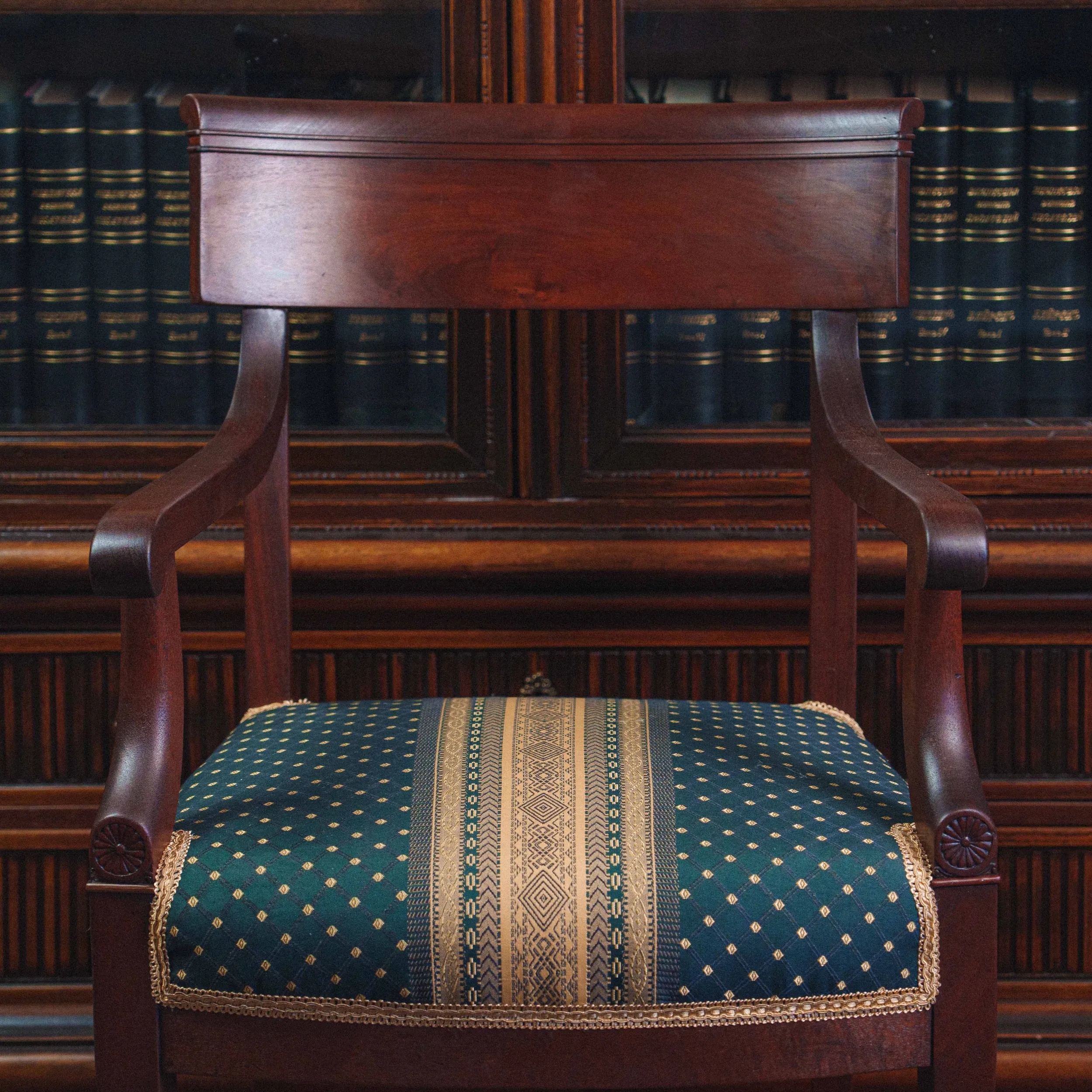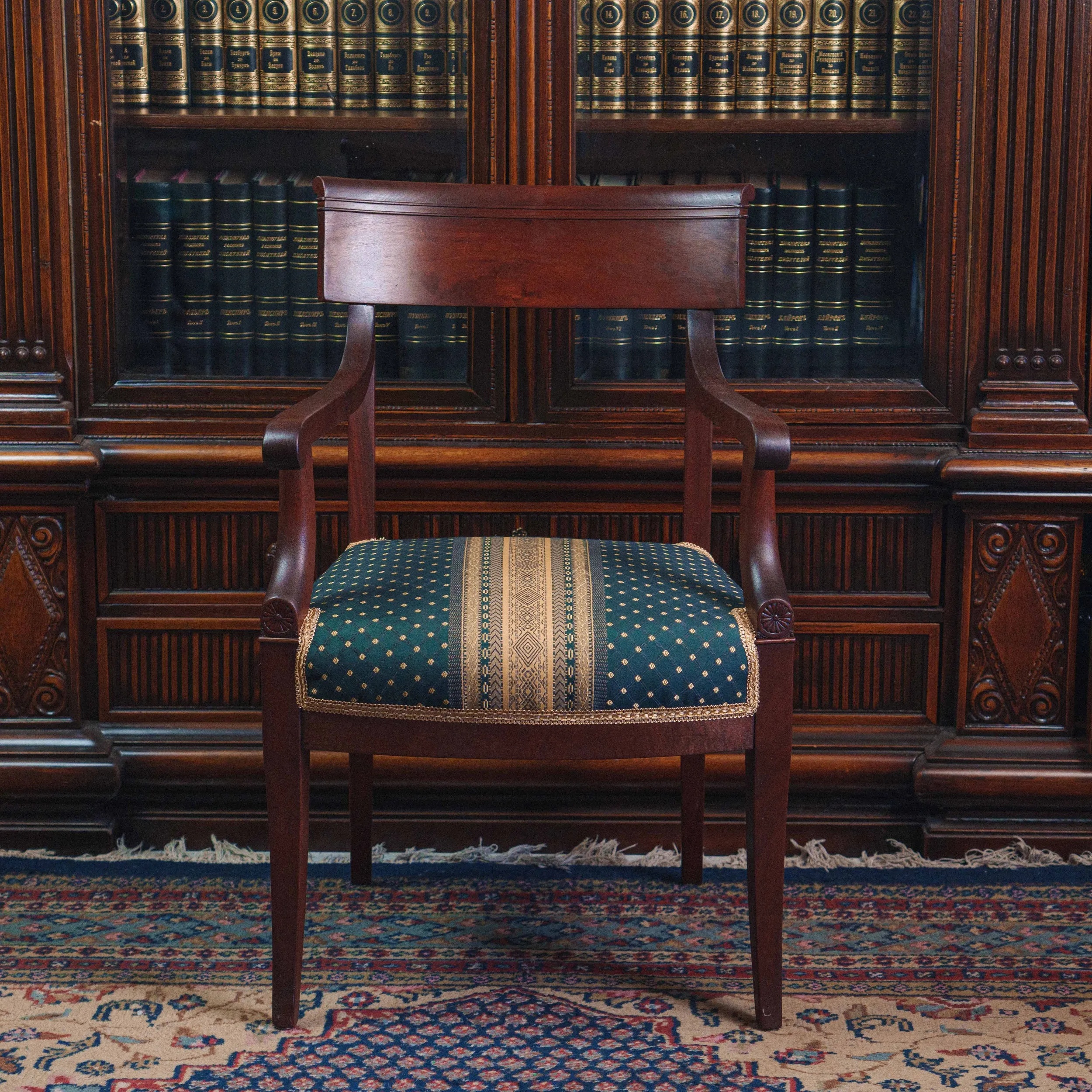 Подлокотники изящно изогнуты и опираются на тонкие, но прочные передние стойки. Их линия плавная и элегантная: начинаясь от боковых стоек спинки, они мягко снижаются вперёд, формируя удобную опору для рук. Такой изгиб характерен для кресел, предназначенных для письменных столов или библиотек.Общий характер предмета позволяет отнести его к кабинетной мебели в стиле неоклассицизма или позднего историзма, распространённой в Европе и России на рубеже XIX–XX веков. Подобные кресла использовались в библиотеках, кабинетах, гостиных и при письменных столах. Их ценили за удобство, сдержанную элегантность и долговечность.