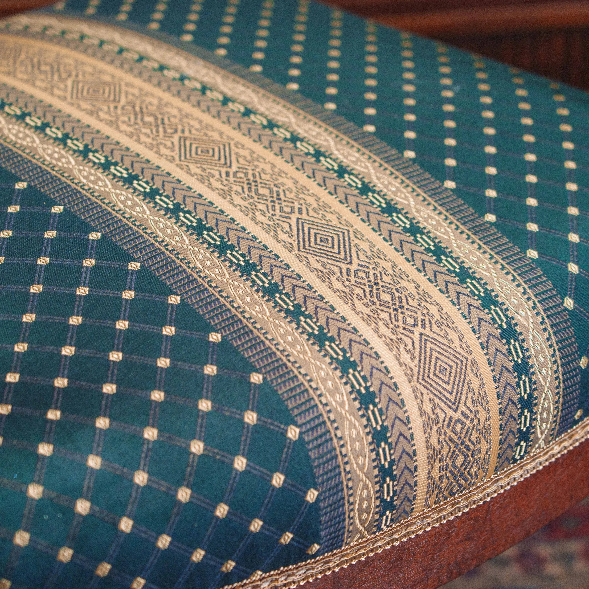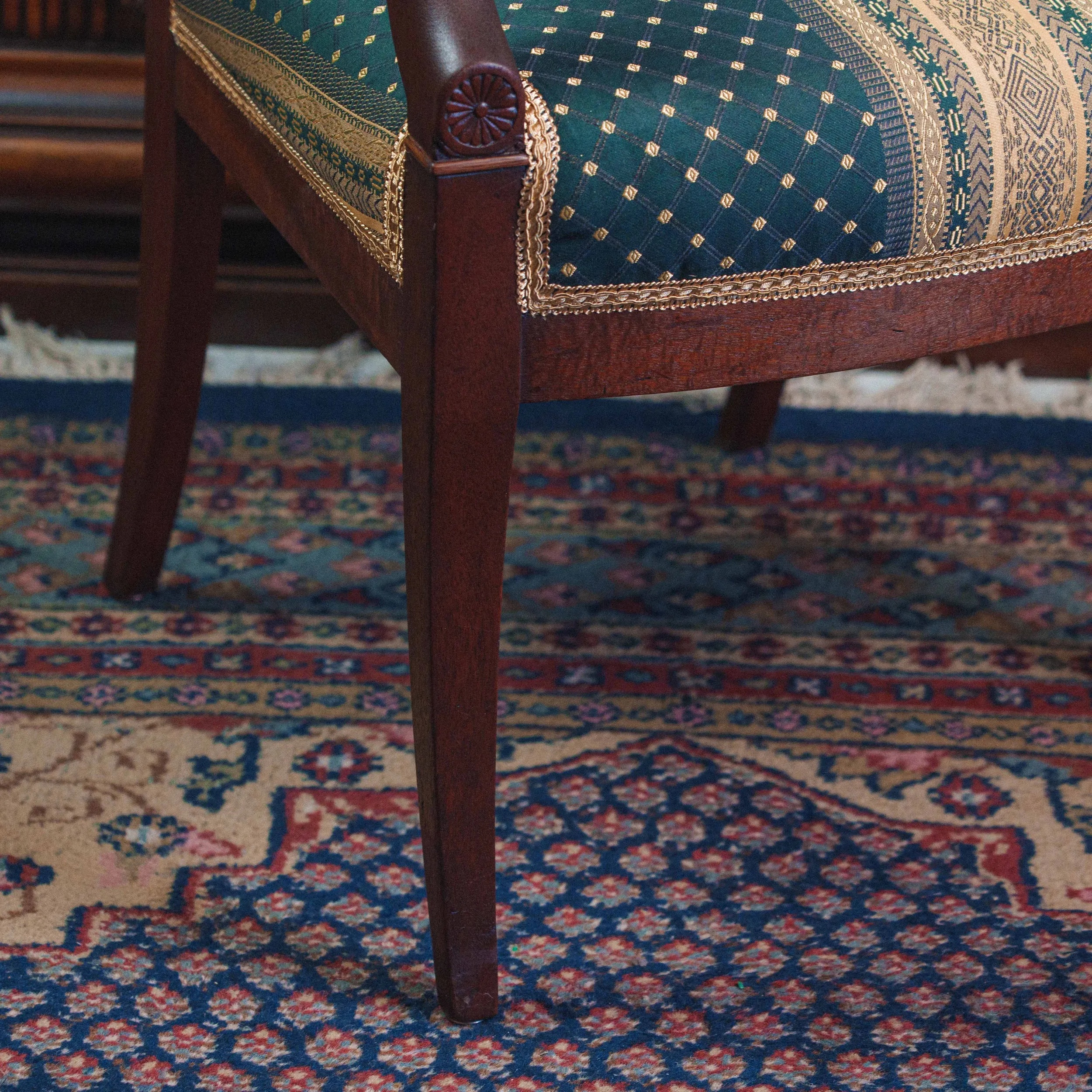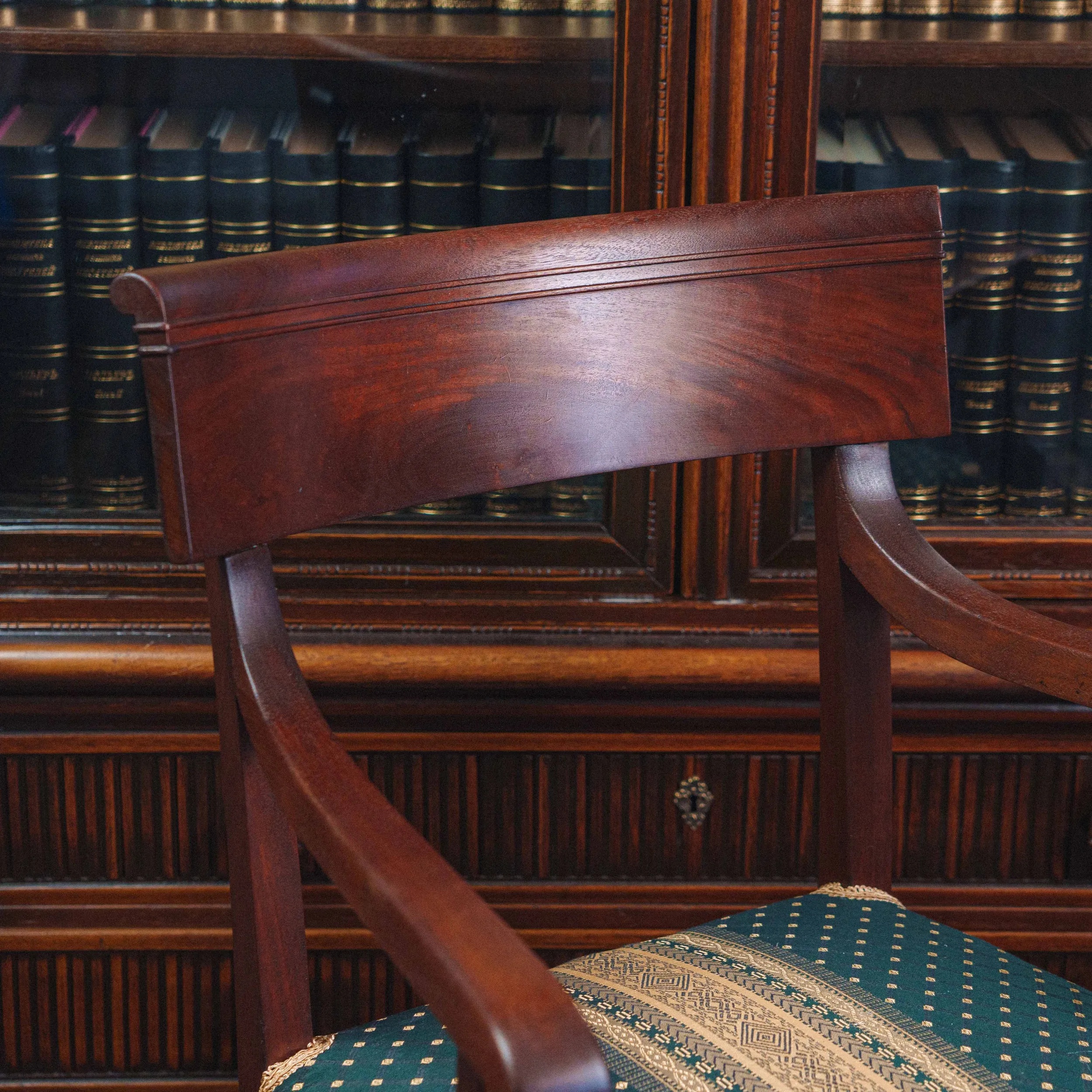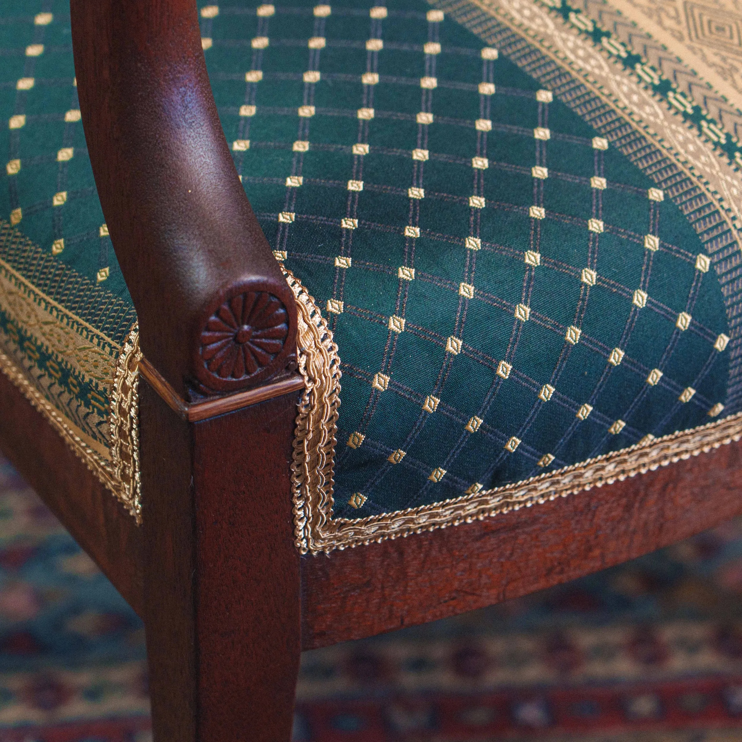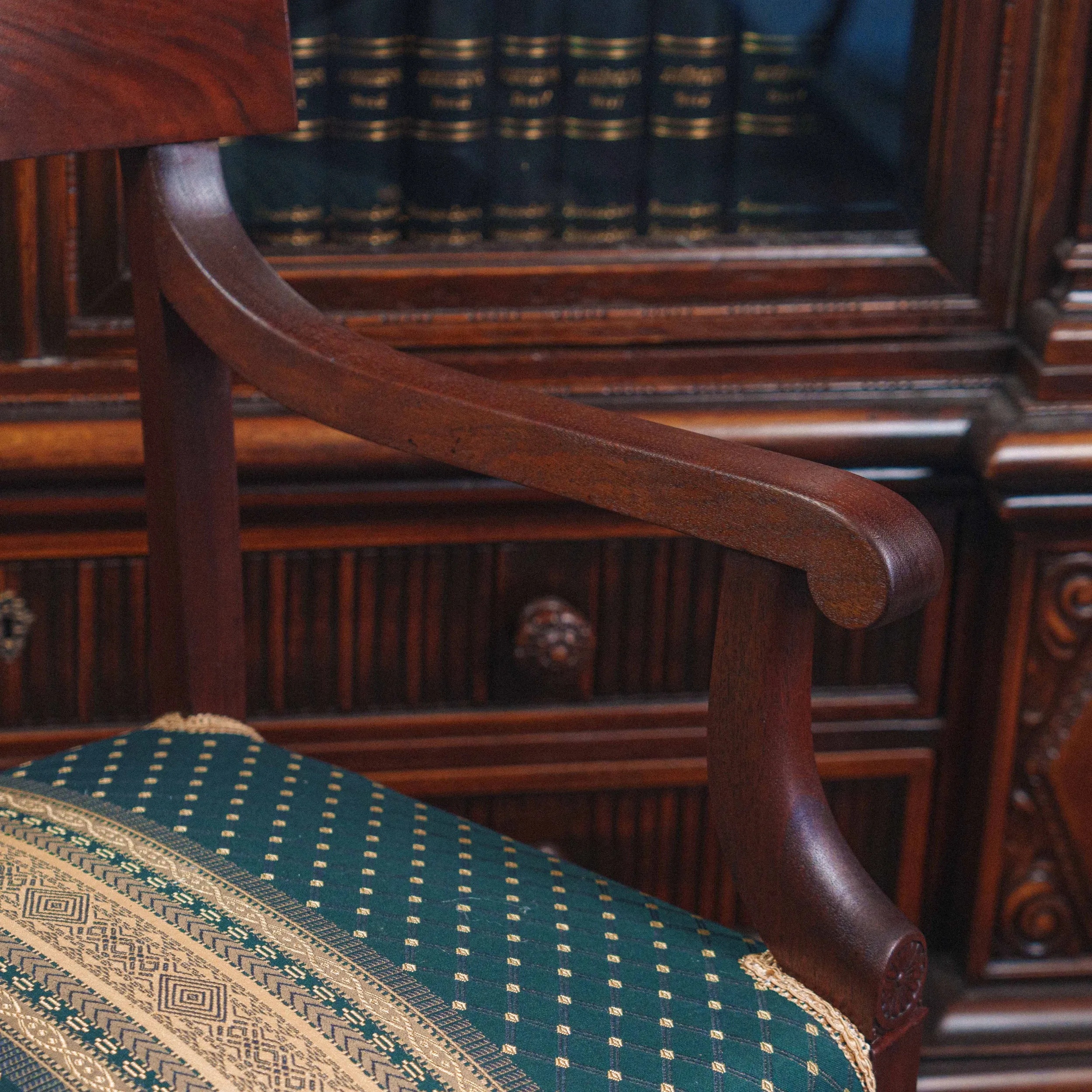 Подлокотники изящно изогнуты и опираются на тонкие, но прочные передние стойки. Их линия плавная и элегантная: начинаясь от боковых стоек спинки, они мягко снижаются вперёд, формируя удобную опору для рук. Такой изгиб характерен для кресел, предназначенных для письменных столов или библиотек.Общий характер предмета позволяет отнести его к кабинетной мебели в стиле неоклассицизма или позднего историзма, распространённой в Европе и России на рубеже XIX–XX веков. Подобные кресла использовались в библиотеках, кабинетах, гостиных и при письменных столах. Их ценили за удобство, сдержанную элегантность и долговечность.