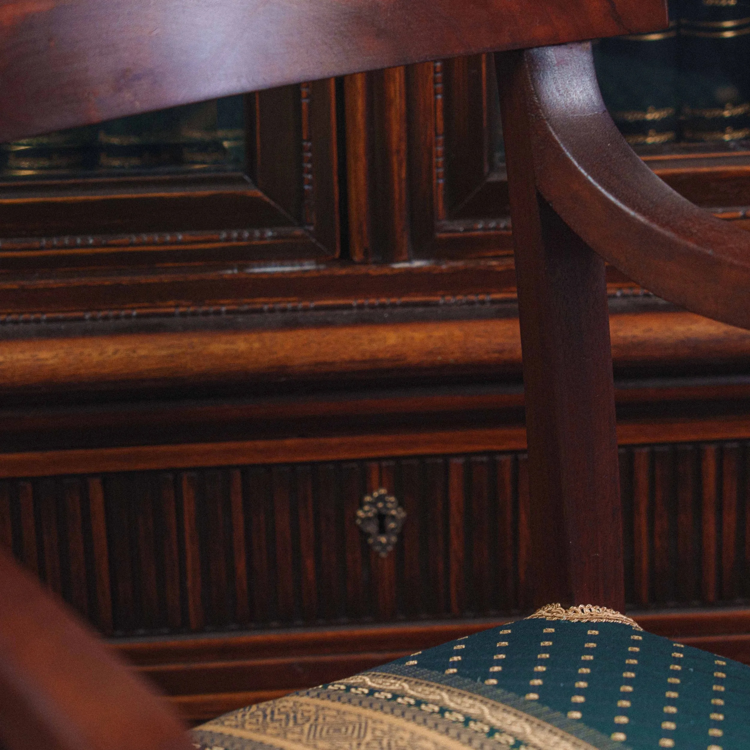 Антикварное кресло кабинетного типа, выполненное в строгой и благородной манере, характерной для европейской мебели конца XIX — начала XX века. Предмет отличается уравновешенными пропорциями, сдержанным декором и выразительной фактурой натурального дерева.