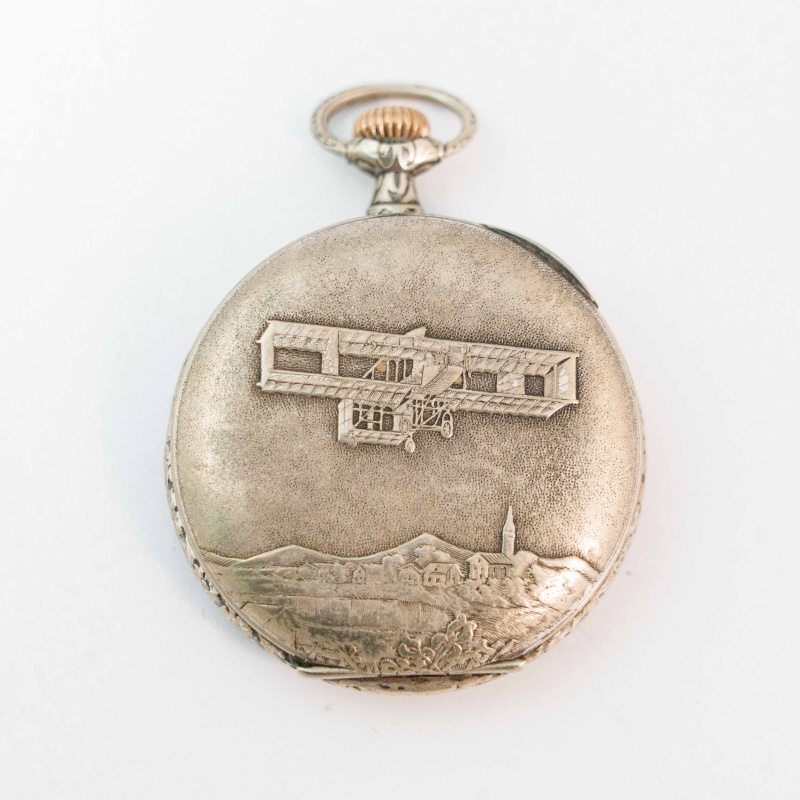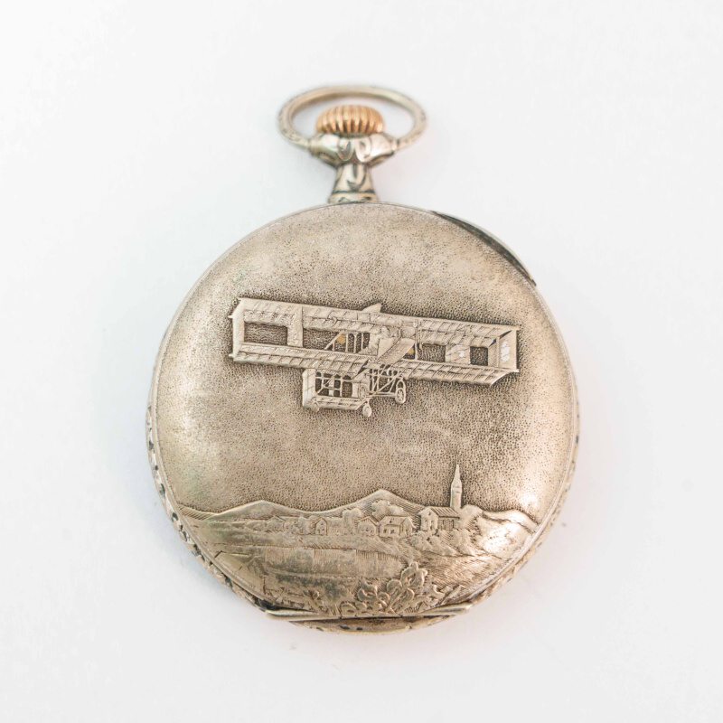 Гравюра на задней крышке ваших часов изображает один из первых самолетов в истории — «Флайер» братьев Райт или биплан Фарман, что было крайне популярным мотивом в дизайне аксессуаров начала XX века (примерно 1910–1915 годы).