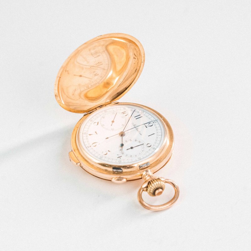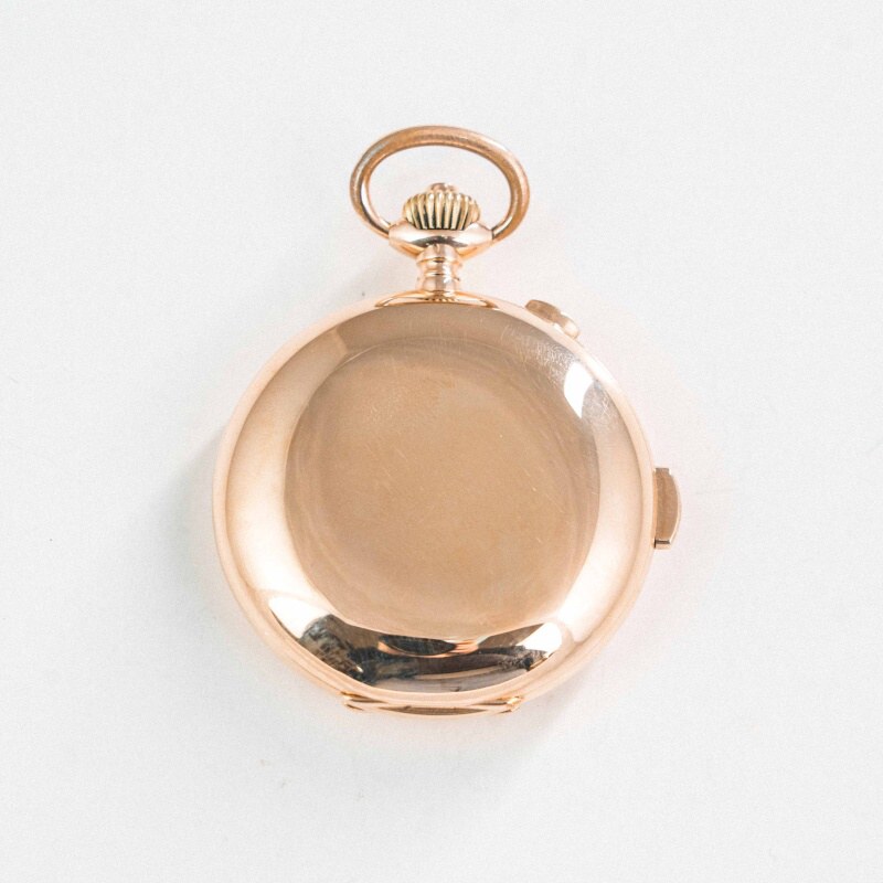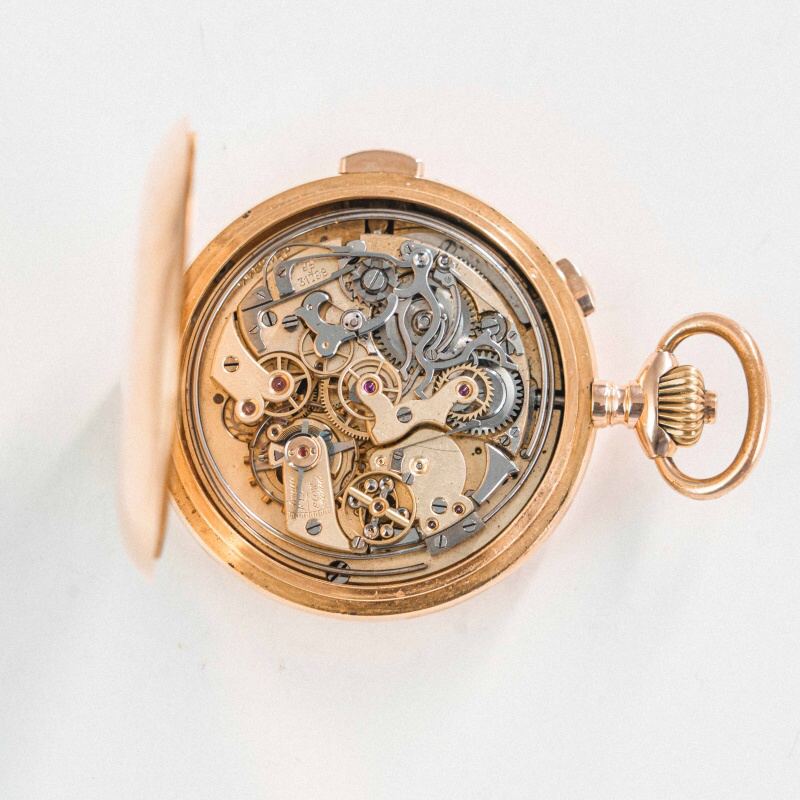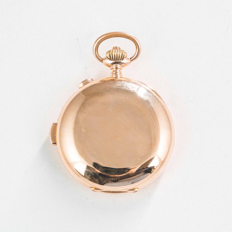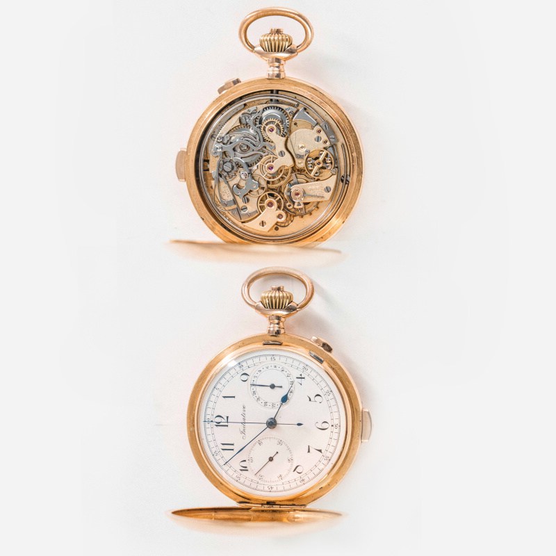 «Савонетта» (Savonette) — трехкрышечный корпус с откидной передней крышкой. Золото 18 карат (750 проба). Это высший стандарт качества для того времени. Массивные часы общим весом 106 грамм.Три золотые крышки (передняя, задняя и внутренний пыльник), обеспечивающие максимальную защиту механизма от пыли. Данные часы объединяют в себе две редкие функции, которые до сих пор считаются вершиной часового искусства: Четвертной репетир (Repetition à Quarts): Механический «аудио-календарь». При нажатии на рычаг (слайдер) на боку корпуса часы отбивают время звуком: Низкий тон — количество часов. Двойной удар (динь-дон) — количество прошедших четвертей часа (15, 30 или 45 минут).