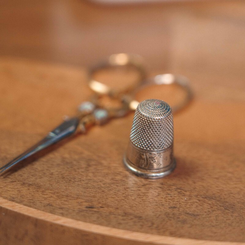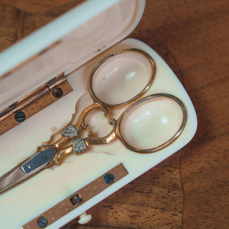 Элегантный дорожный швейный набор — необходимый аксессуар дамы XIX века, сочетающий в себе практичность и изящество. Внутри аккуратно размещены инструменты для рукоделия: ножницы, напёрсток, иглы и другие принадлежности, выполненные с вниманием к деталям.