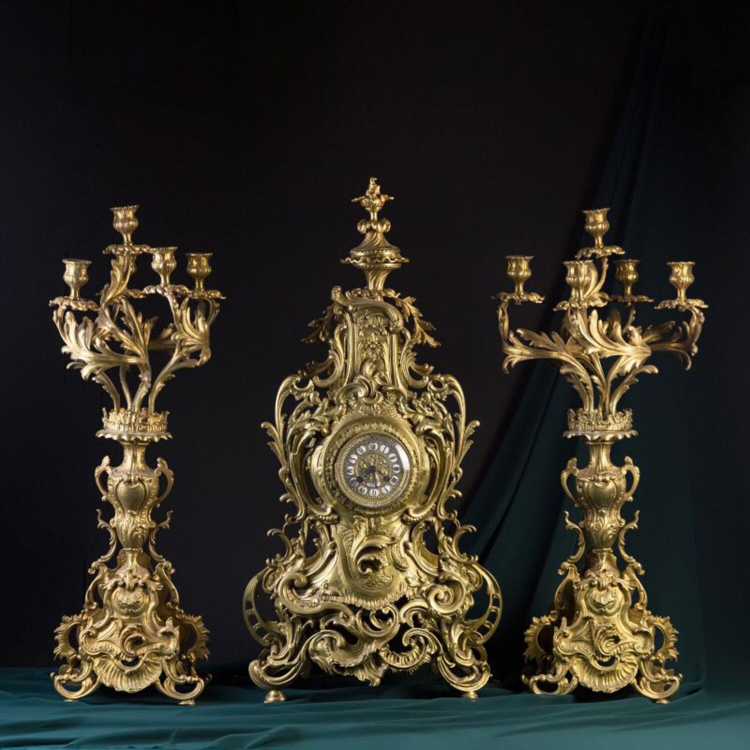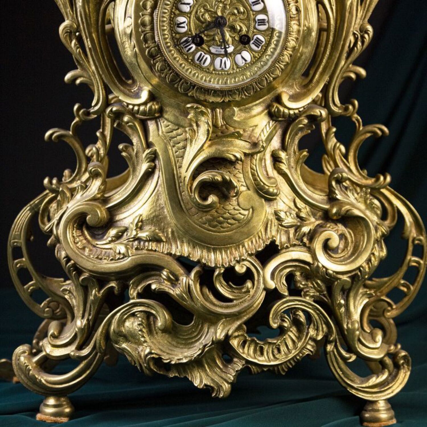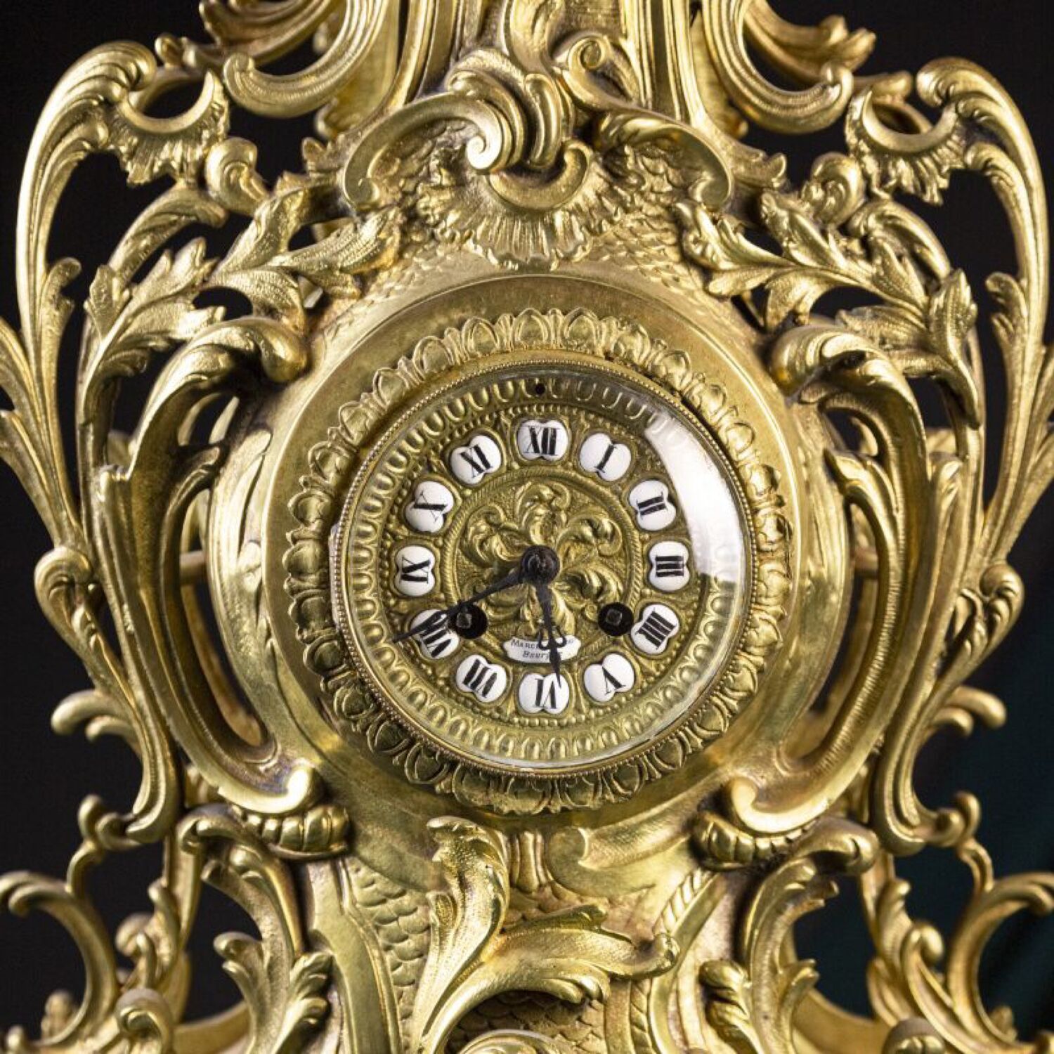 Часовой гарнитур в стиле Неорококо с парой пятирожковых канделябров. Декоративное оформление гарнитура представлено изображением растительных стеблей и листьев, стилизованных элементов морской волны и раковин. Литье отличается высокой техникой исполнения и тонкой проработкой мелких деталей. Бронзовый циферблат с римскими цифрами на эмалевых щитках великолепно сочетается со стрелками классической формы. На циферблате имеется эмалевая табличка с названием литейной мастерской «Marcel Richoux».