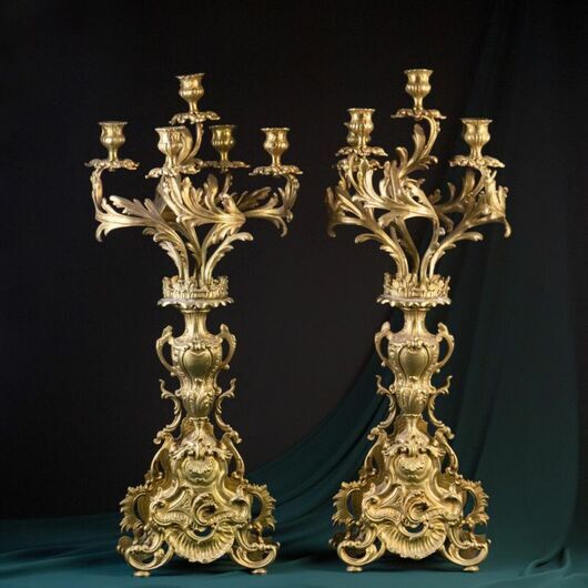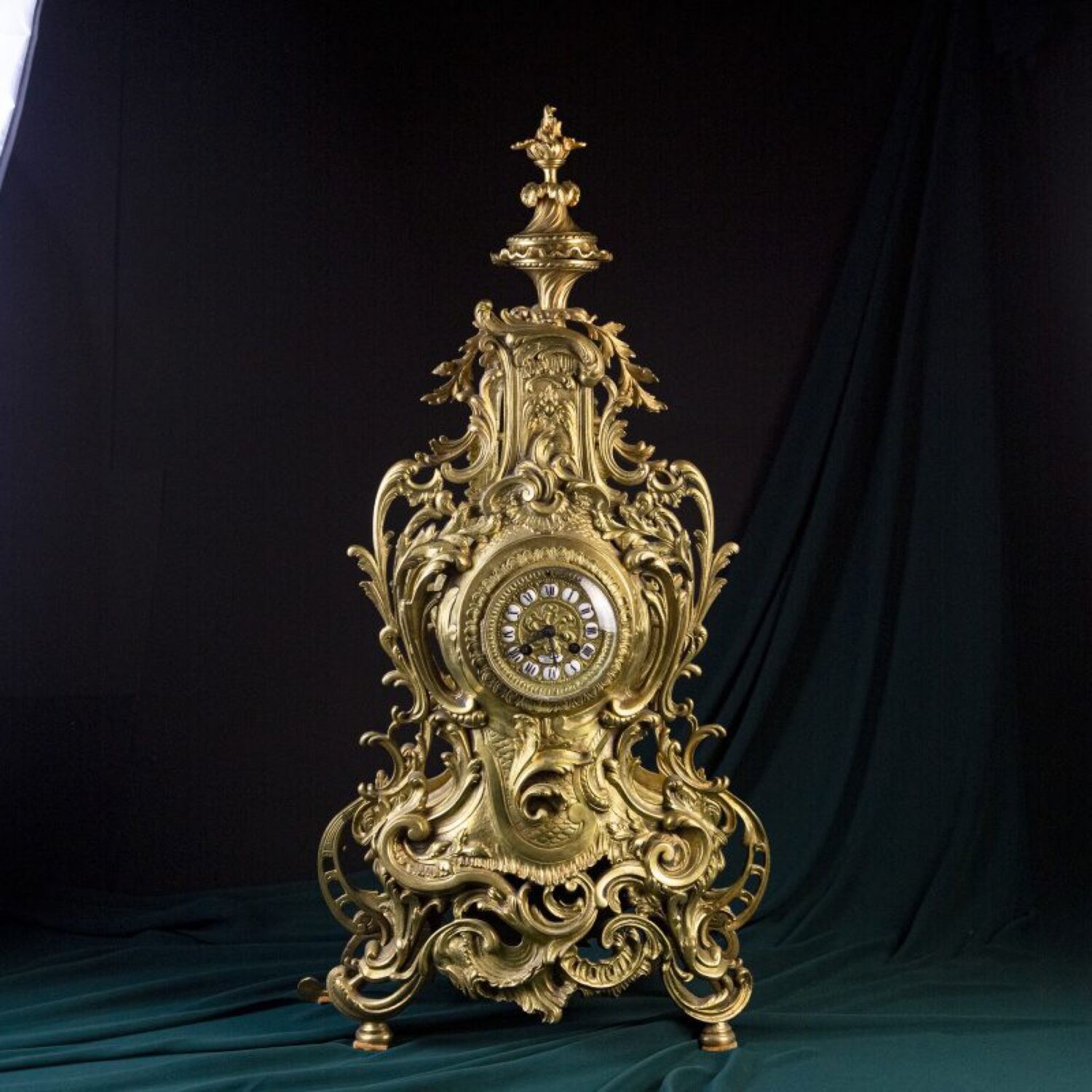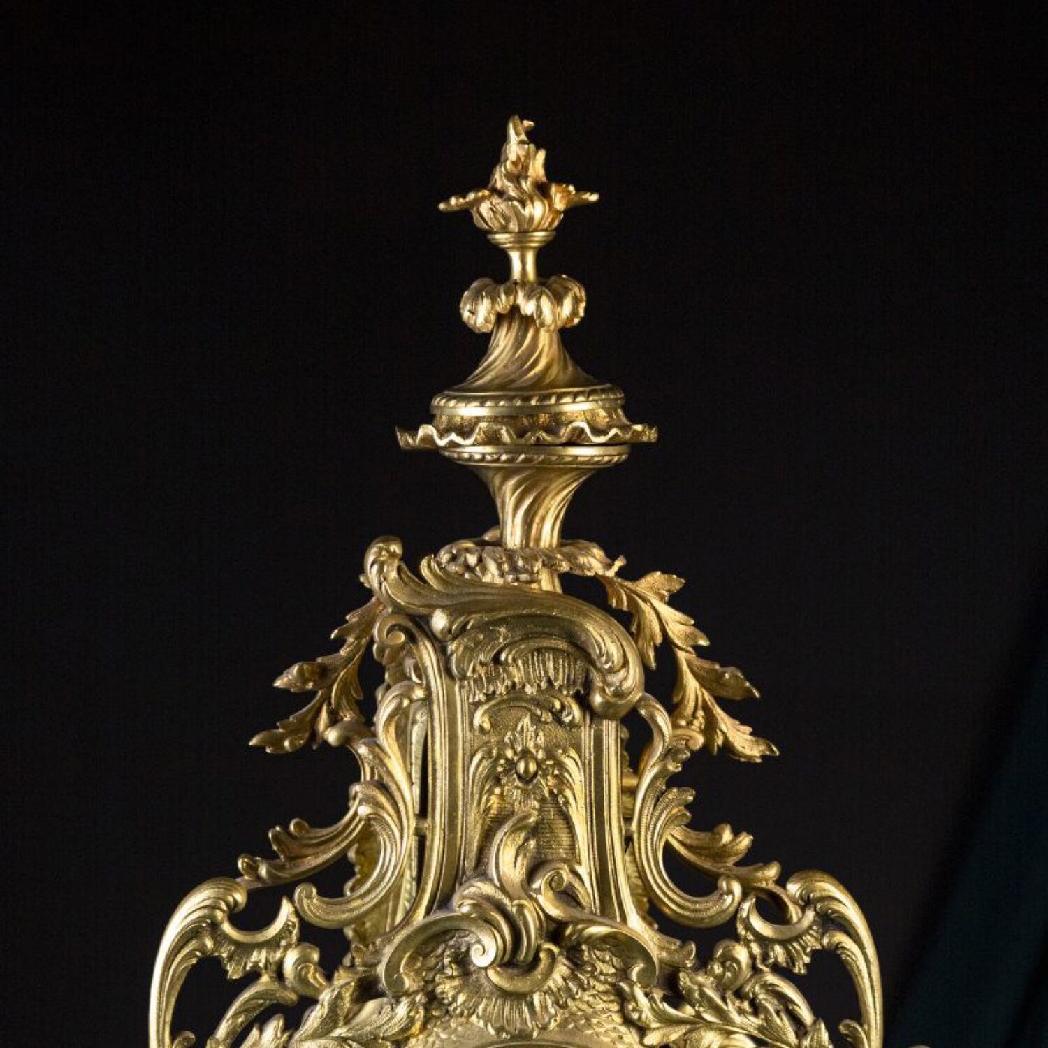 Часовой гарнитур в стиле Неорококо с парой пятирожковых канделябров. Декоративное оформление гарнитура представлено изображением растительных стеблей и листьев, стилизованных элементов морской волны и раковин. Литье отличается высокой техникой исполнения и тонкой проработкой мелких деталей. Бронзовый циферблат с римскими цифрами на эмалевых щитках великолепно сочетается со стрелками классической формы. На циферблате имеется эмалевая табличка с названием литейной мастерской «Marcel Richoux».