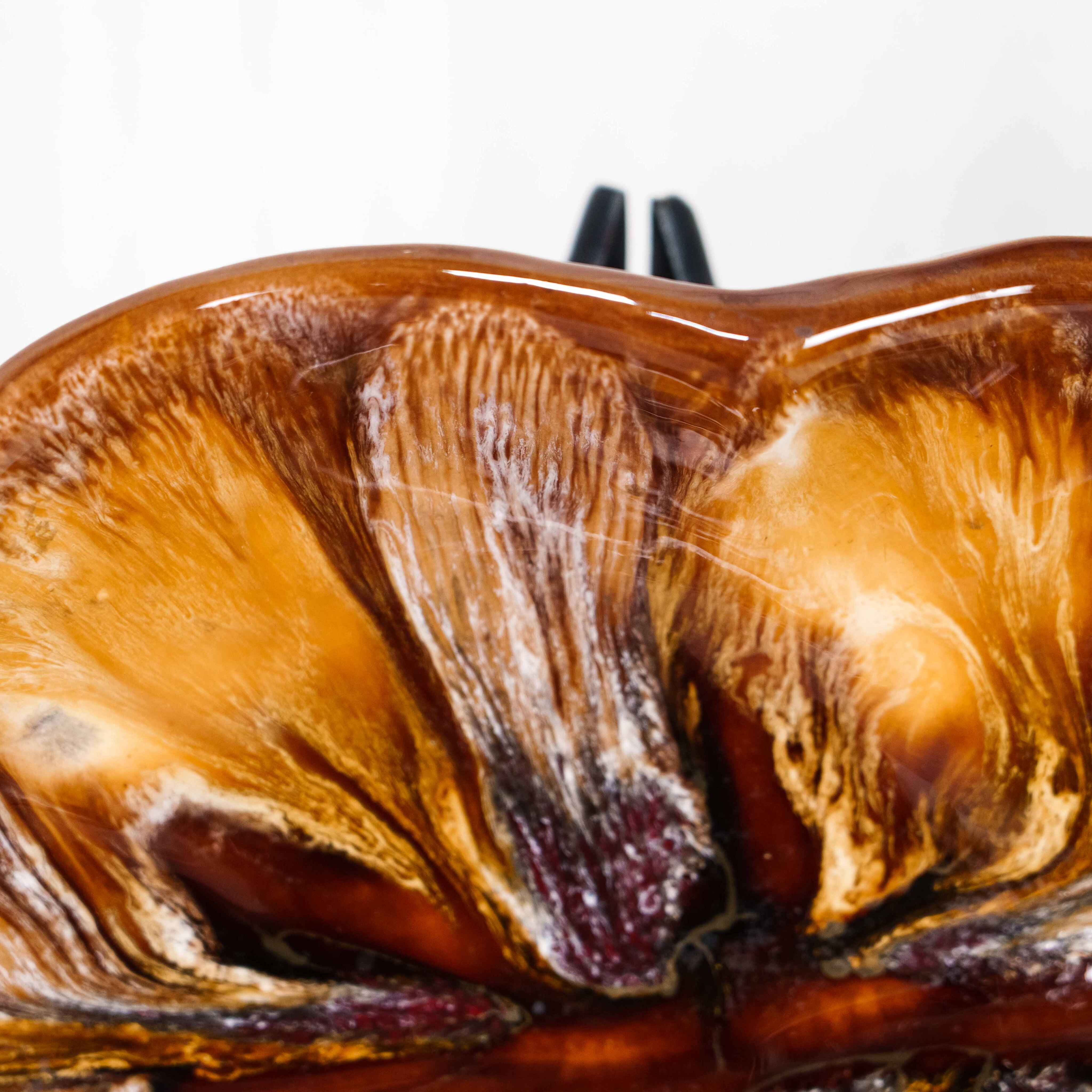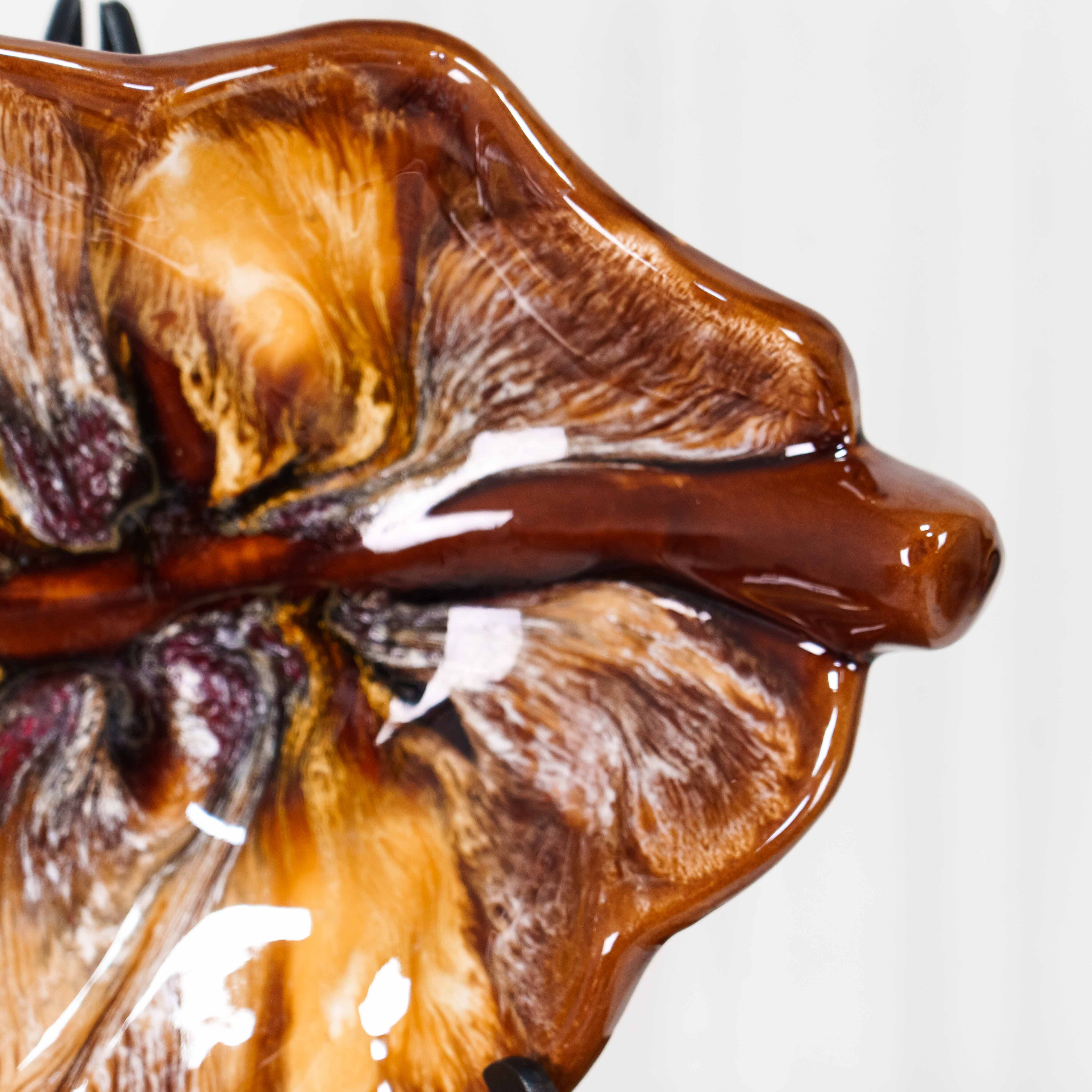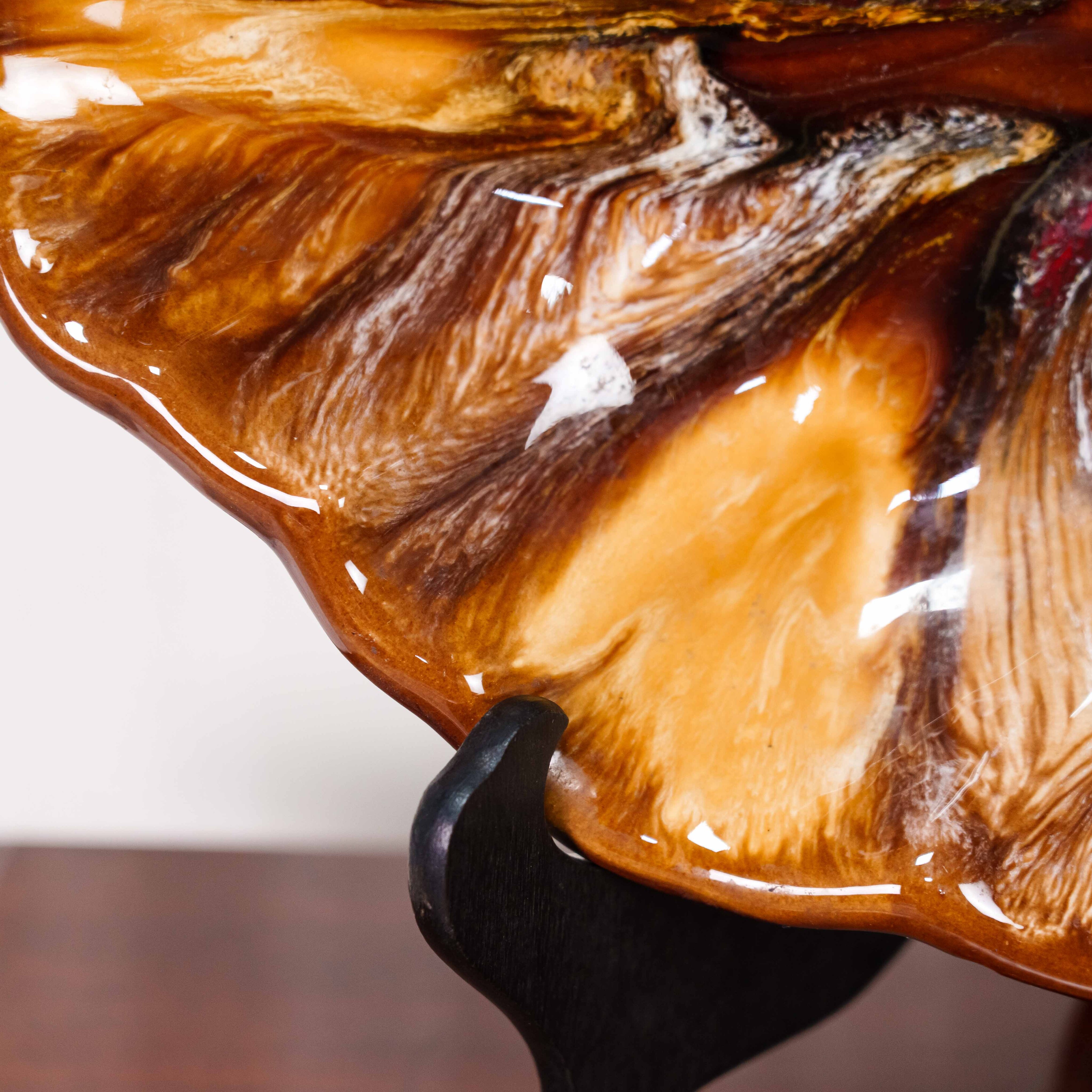 Глянцевая глазурь усиливает игру света и подчёркивает фактуру, создавая эффект полупрозрачности и внутреннего свечения. Такой тип декора характерен для художественной керамики середины XX века, вдохновлённой природными мотивами и экспериментами с глазурями.