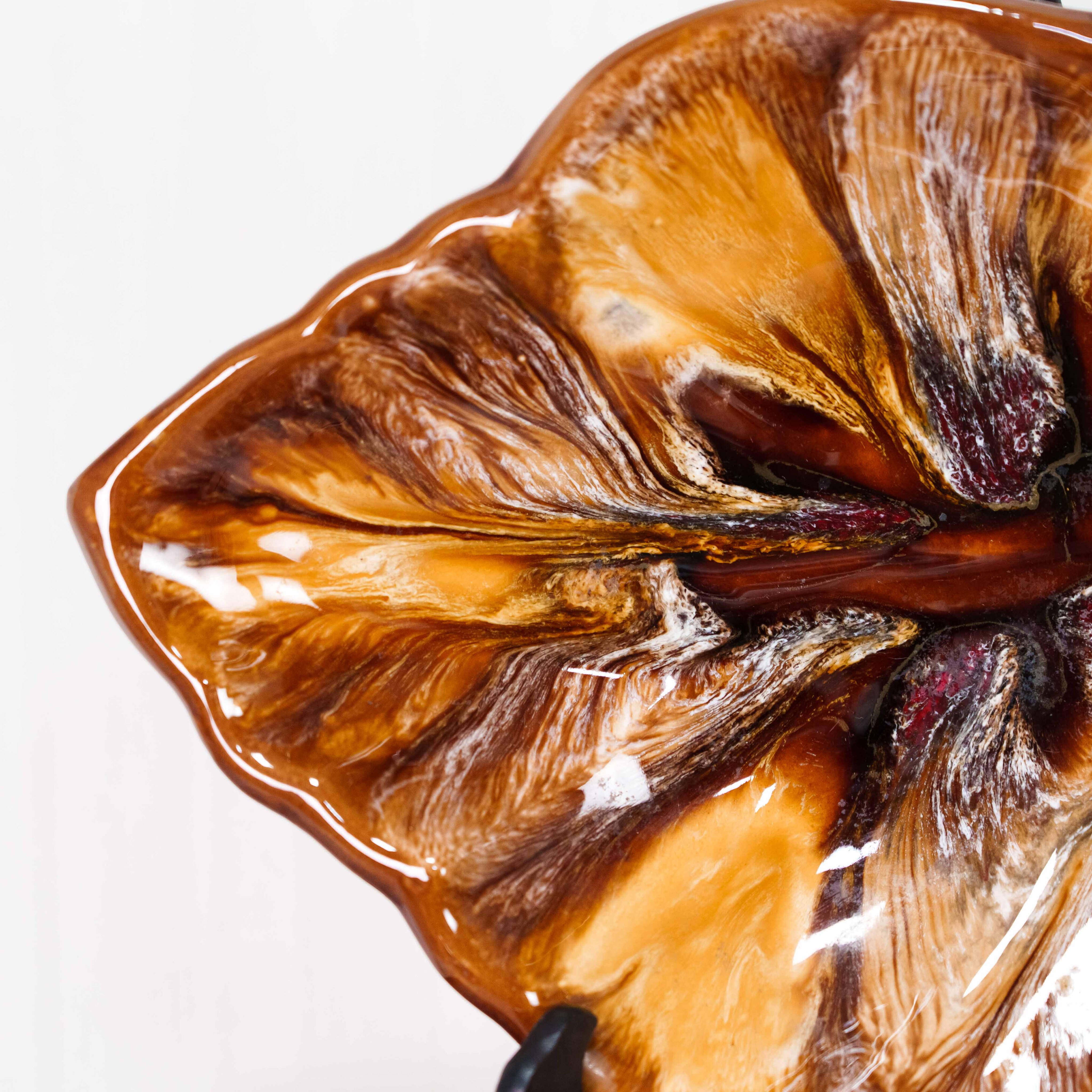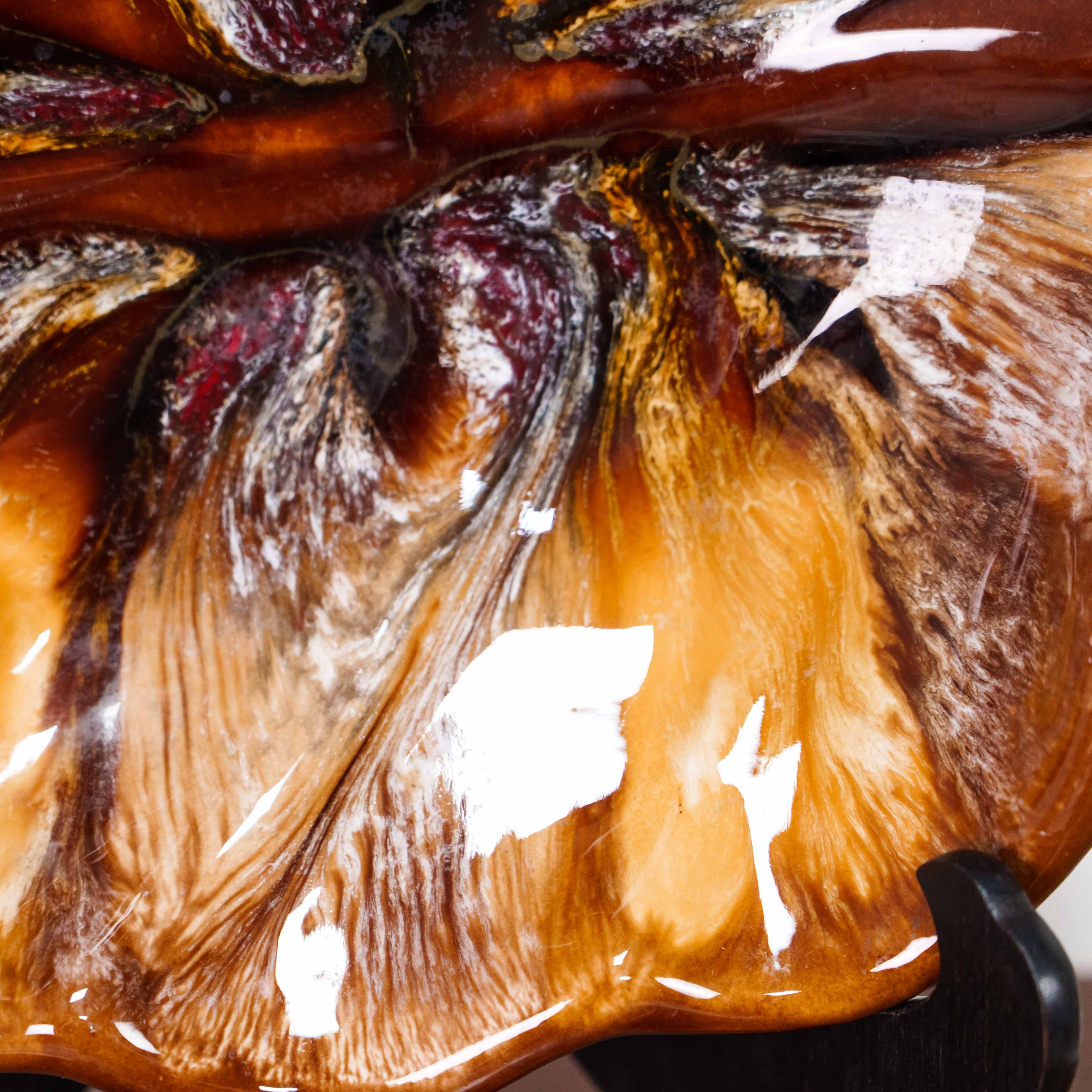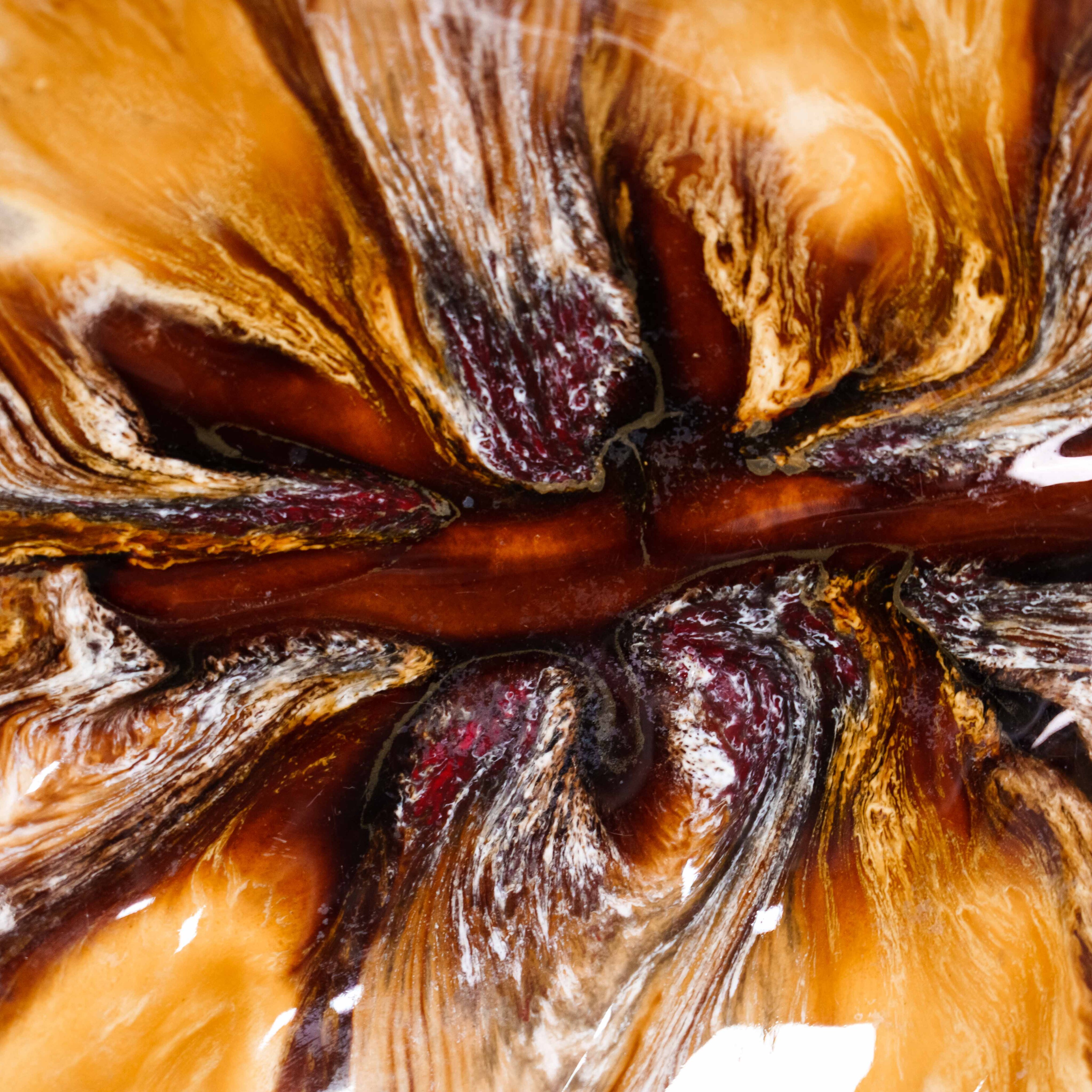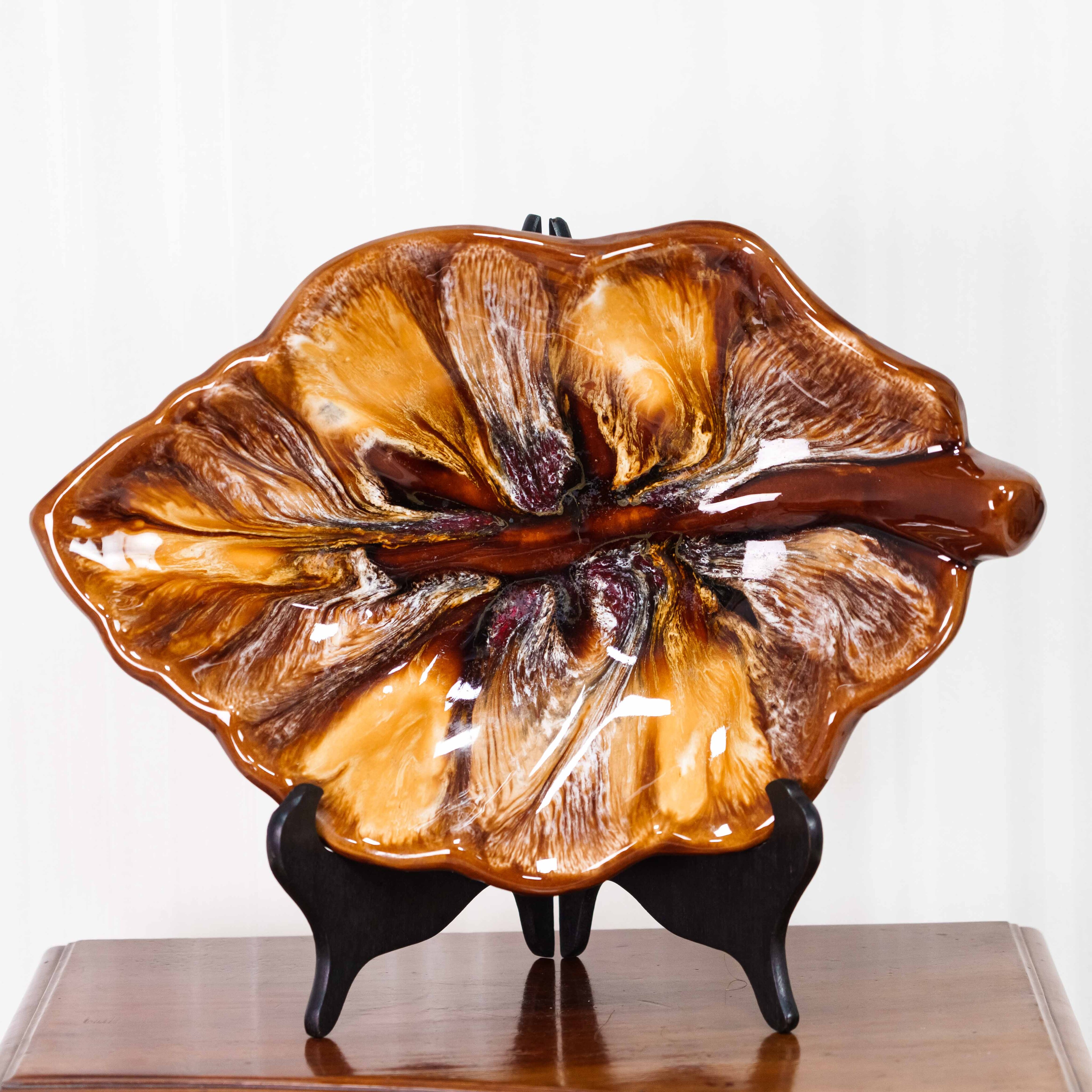 Это эффектное декоративное блюдо выполнено в выразительной органической форме, напоминающей распустившийся цветок или стилизованный лист. Его волнистый контур и рельефная поверхность создают ощущение движения, словно природная форма застыла в моменте. Центральная часть композиции акцентирована глубокими переливами оттенков — от янтарно-золотистых до насыщенных коричневых и карамельных тонов, с тонкими переходами и «мраморными» прожилками, что придаёт поверхности особую глубину и живописность.