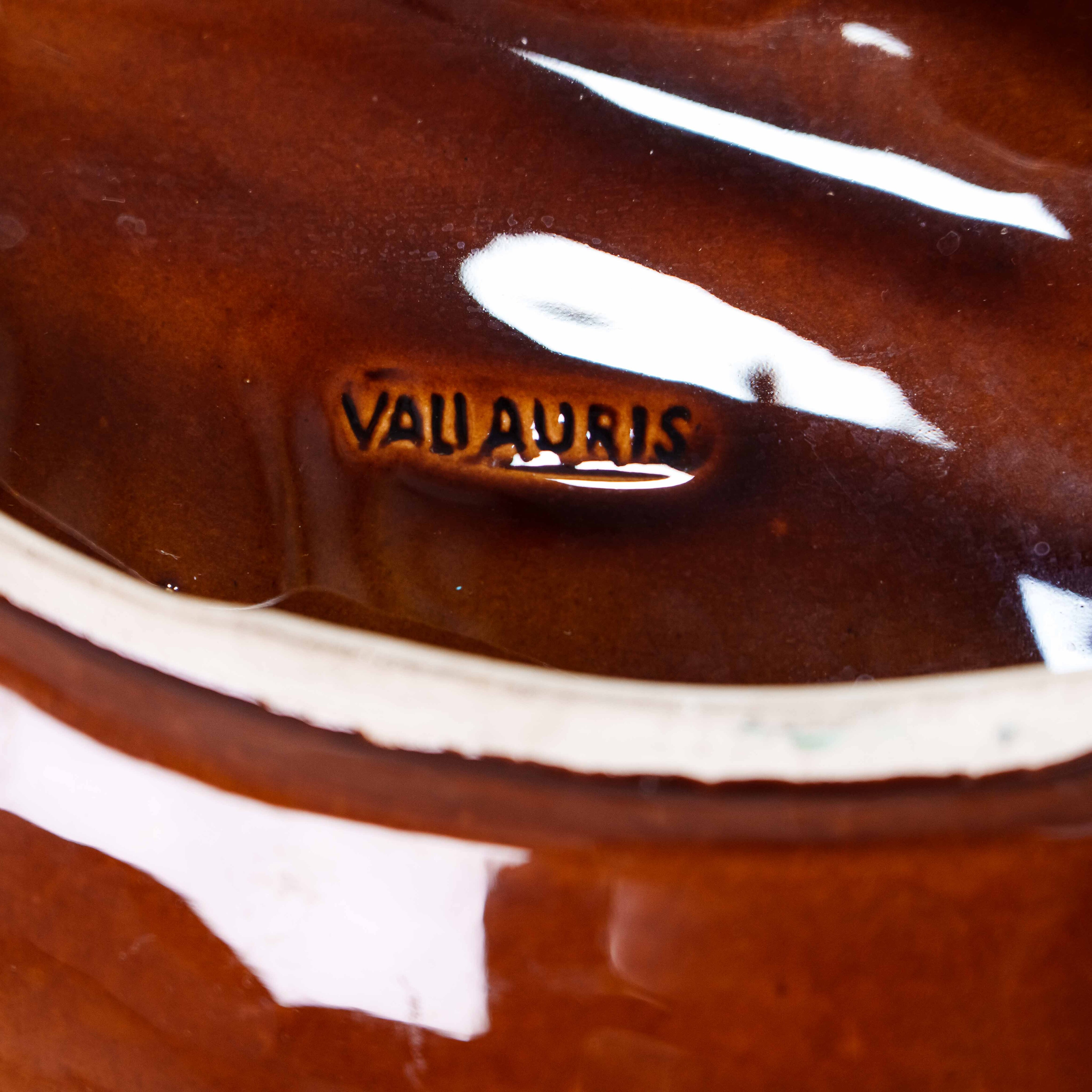 На обороте присутствует клеймо Vallauris, что указывает на происхождение изделия из знаменитого французского керамического центра Валлорис, прославившегося своими авторскими работами и смелыми формами.