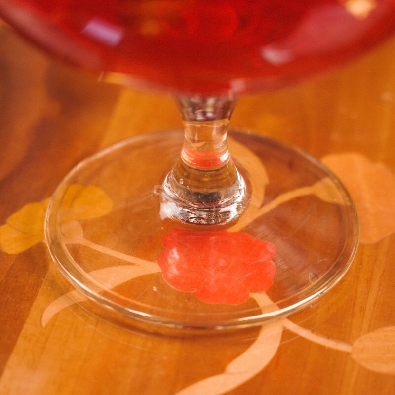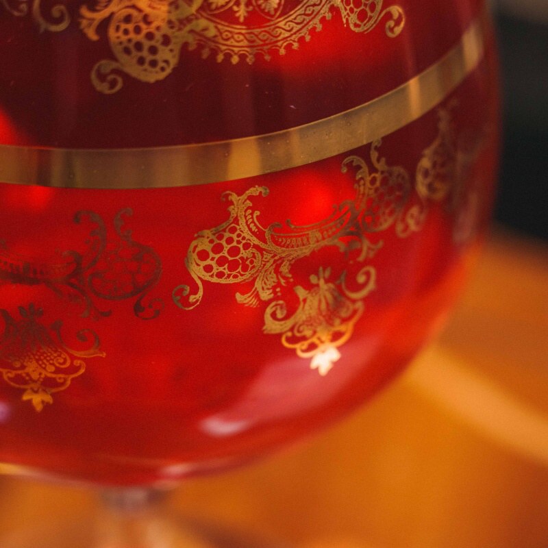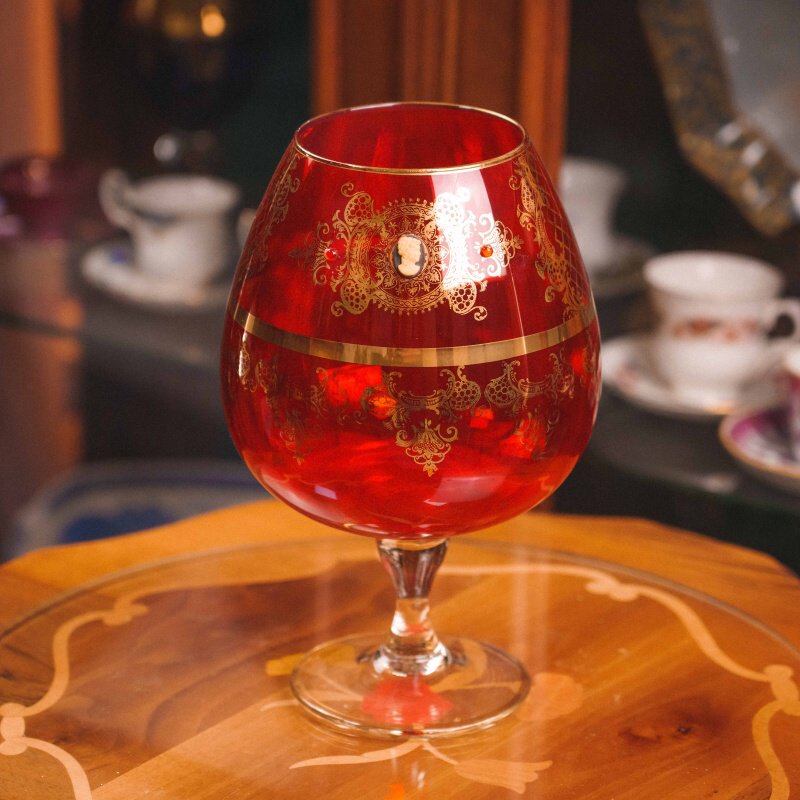 Эффектный декоративный бокал выполнен из насыщенного рубиново-красного стекла, оттенок которого усиливается мягкими бликами света. Поверхность украшена широкими орнаментальными золотыми поясами, в узорах которых читаются мотивы барочного кружева, стилизованные картуши и растительные завитки. В центре одного из картушей помещена миниатюрная овальная камея с женским профилем в античном стиле — акцент, придающий предмету особую изысканность и отсылающий к традициям европейского декоративного искусства XIX века. Композицию дополняют небольшие накладные стеклянные элементы тёплого рубинового цвета, которые создают эффект драгоценных вставок.
