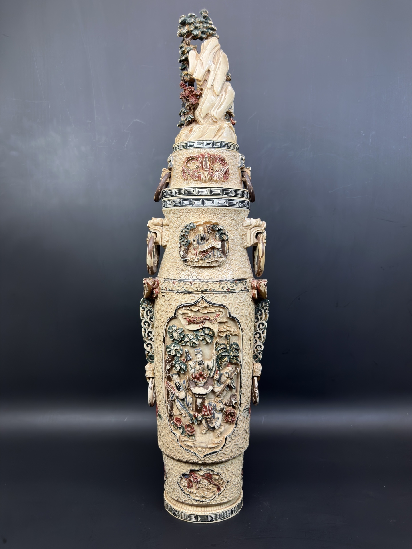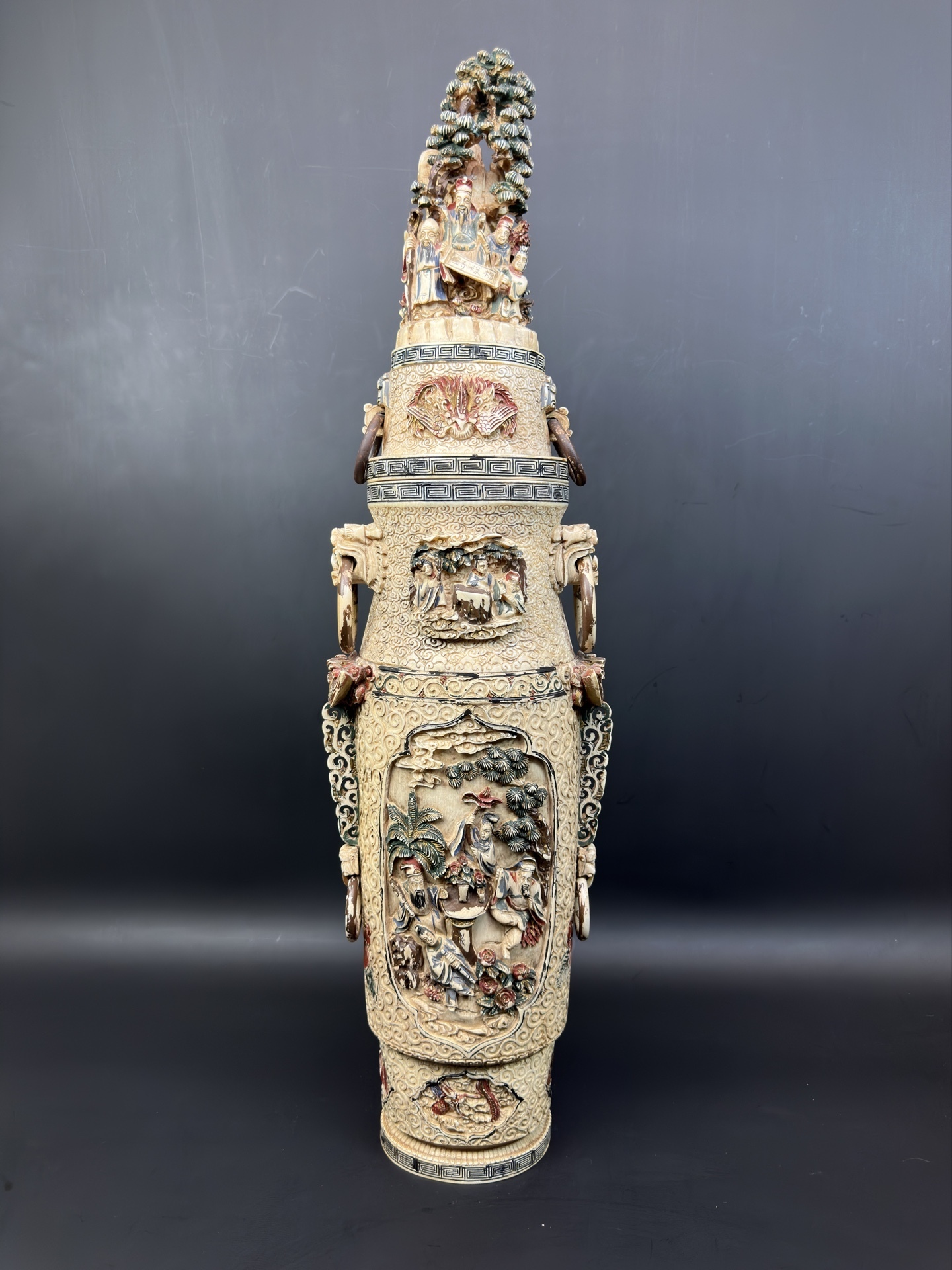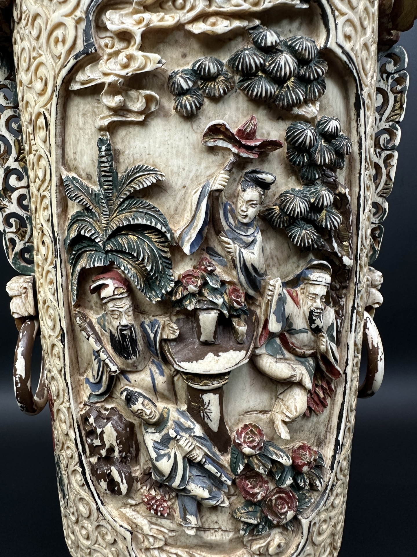 Ваза украшена многоуровневой резьбой, изображающей сцены с фигурами людей в традиционных одеждах, элементами пейзажа (деревья, облака) и декоративными узорами.