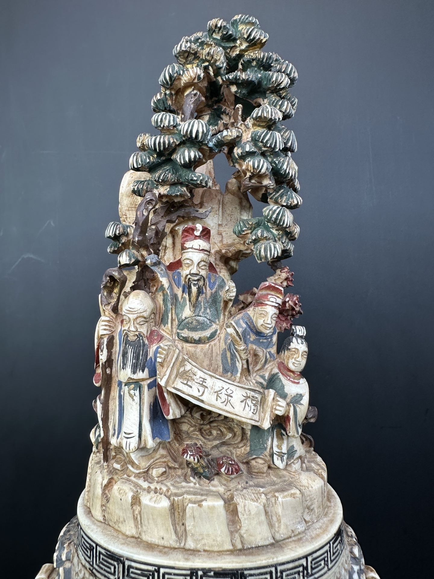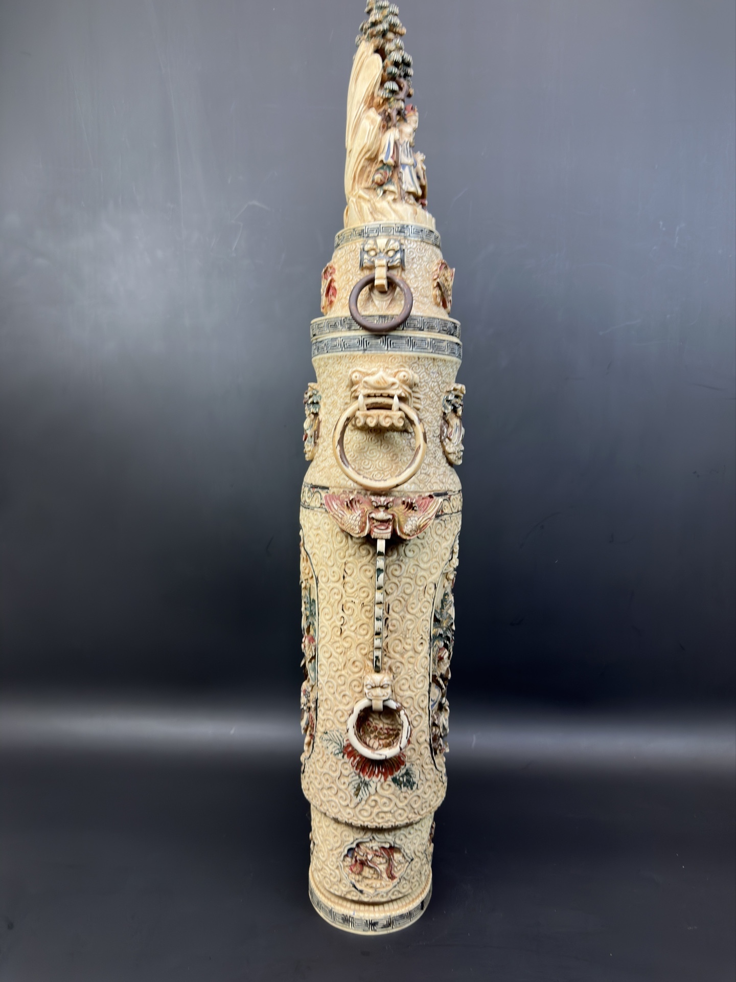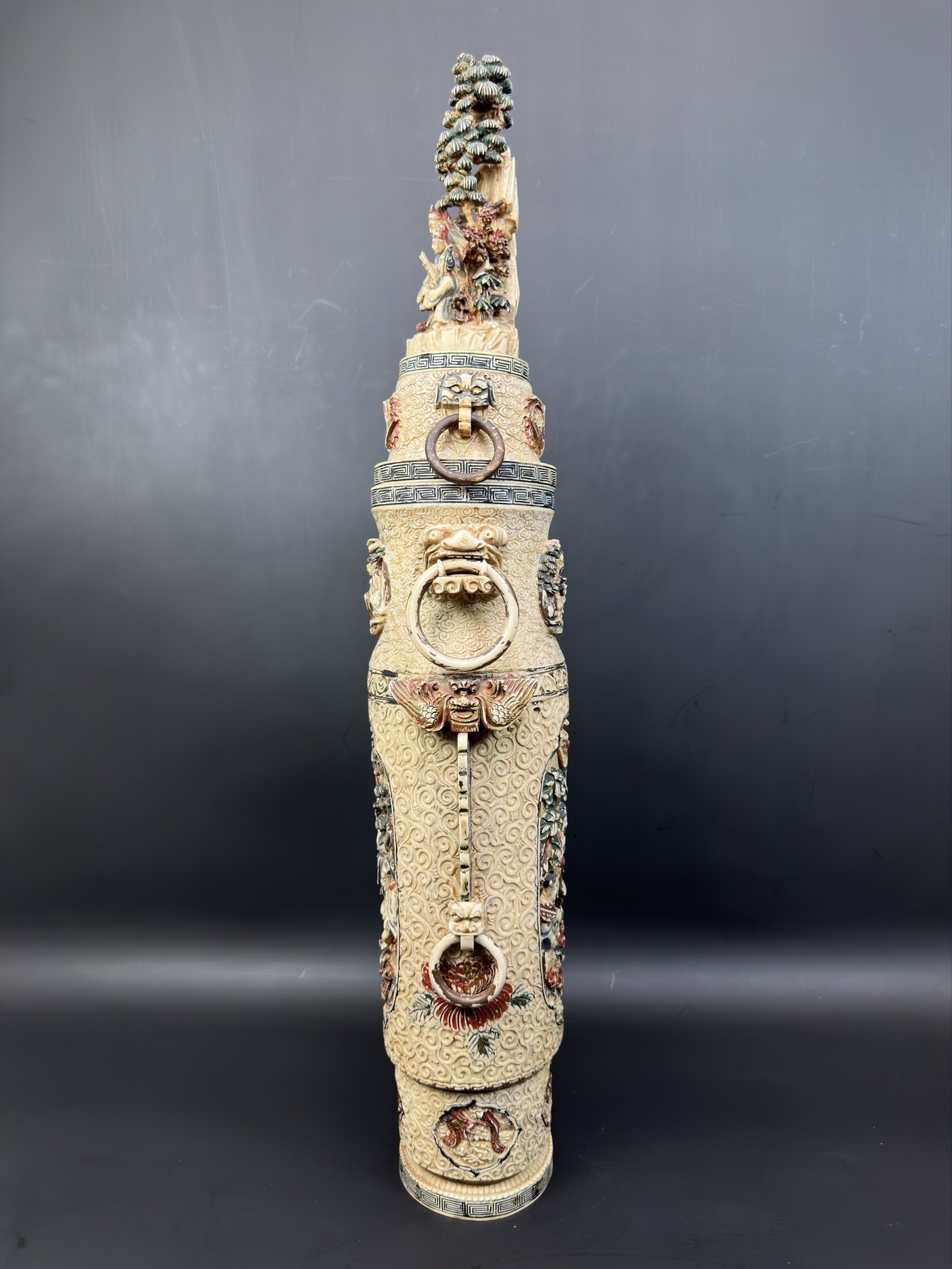 Ваза украшена многоуровневой резьбой, изображающей сцены с фигурами людей в традиционных одеждах, элементами пейзажа (деревья, облака) и декоративными узорами.