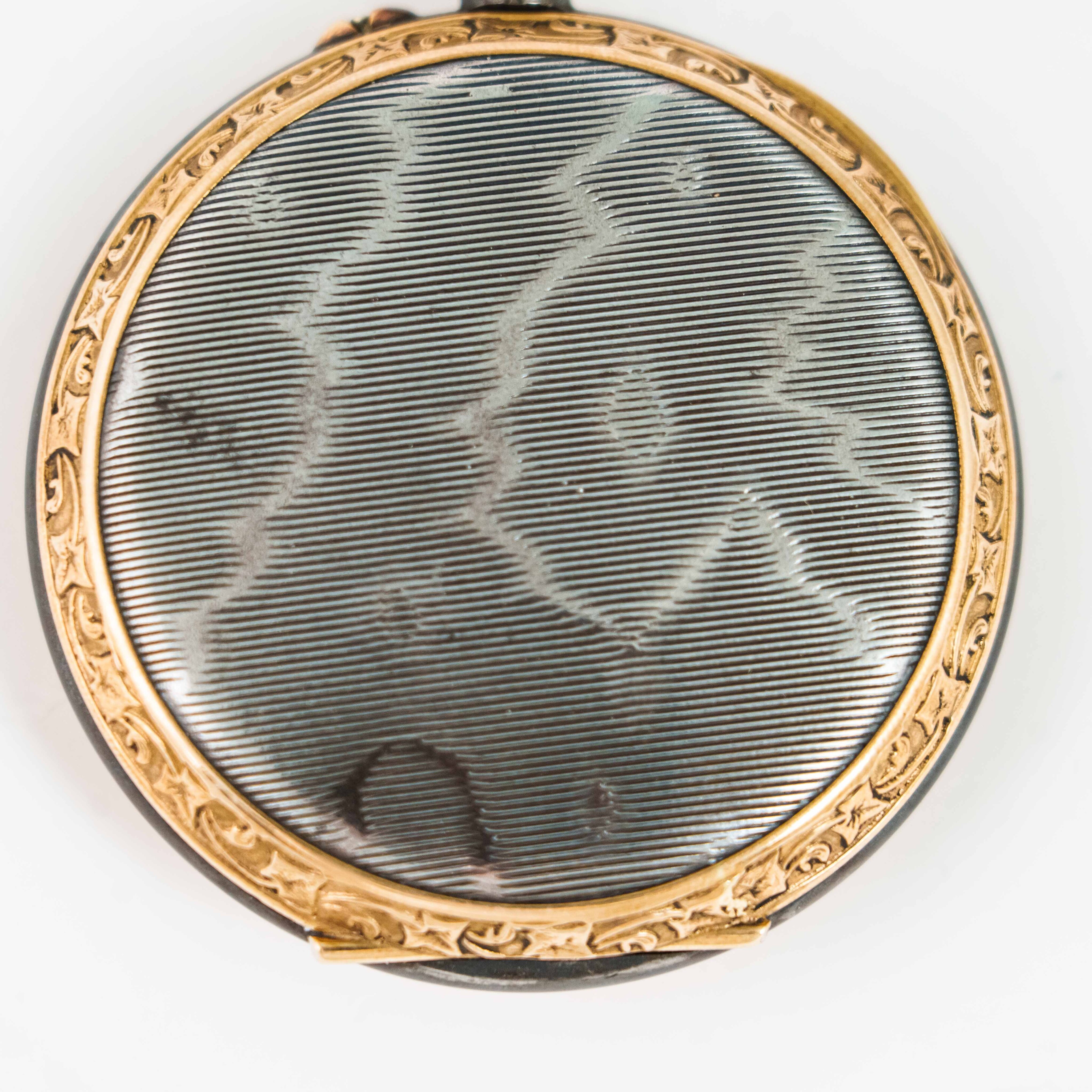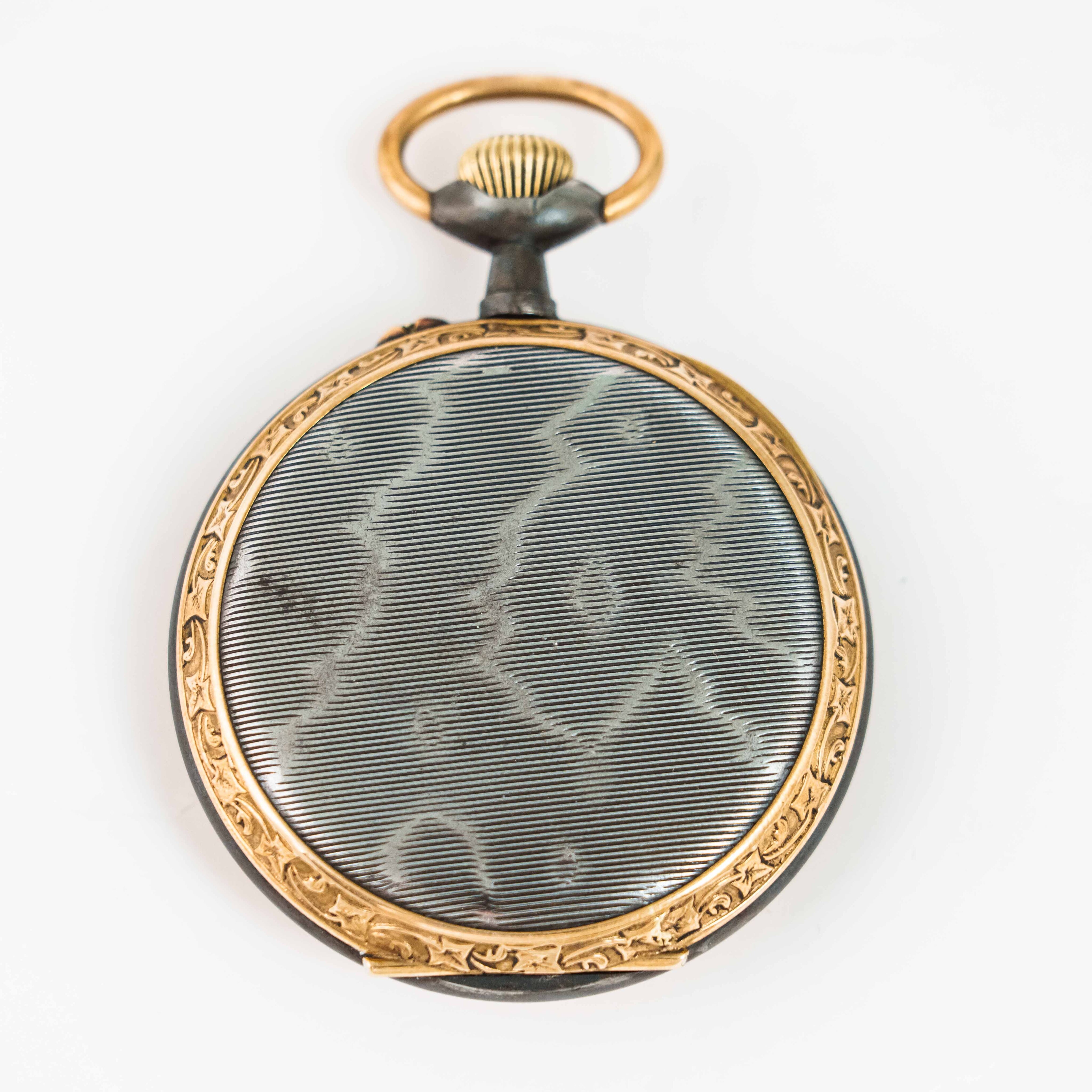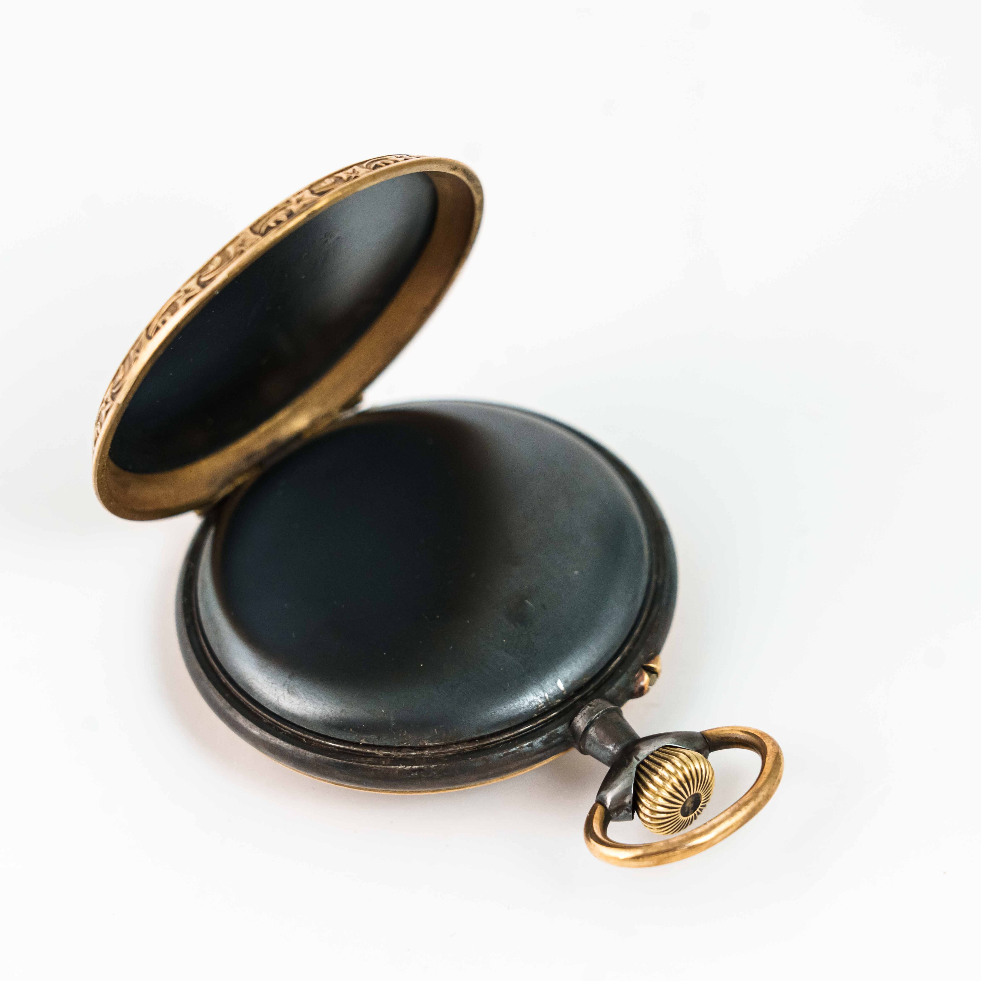 Старинные викторианские карманные часы, в корпусе из вороненной стали, бронзовый ободок, с красивым цветочным узором. Корпус не поврежден, крышки работают исправно. Красивый циферблат украшенный позолоченными вставками с цветочным орнаментом, большие золотые римские цифры и ажурные стрелки. Малая секундная стрелка в положении «6 часов». Завод — заводной головкой (Коронкой), кнопка перевода стрелок расположена с боку от заводной головки. Красивый никелированный анкерный механизм.