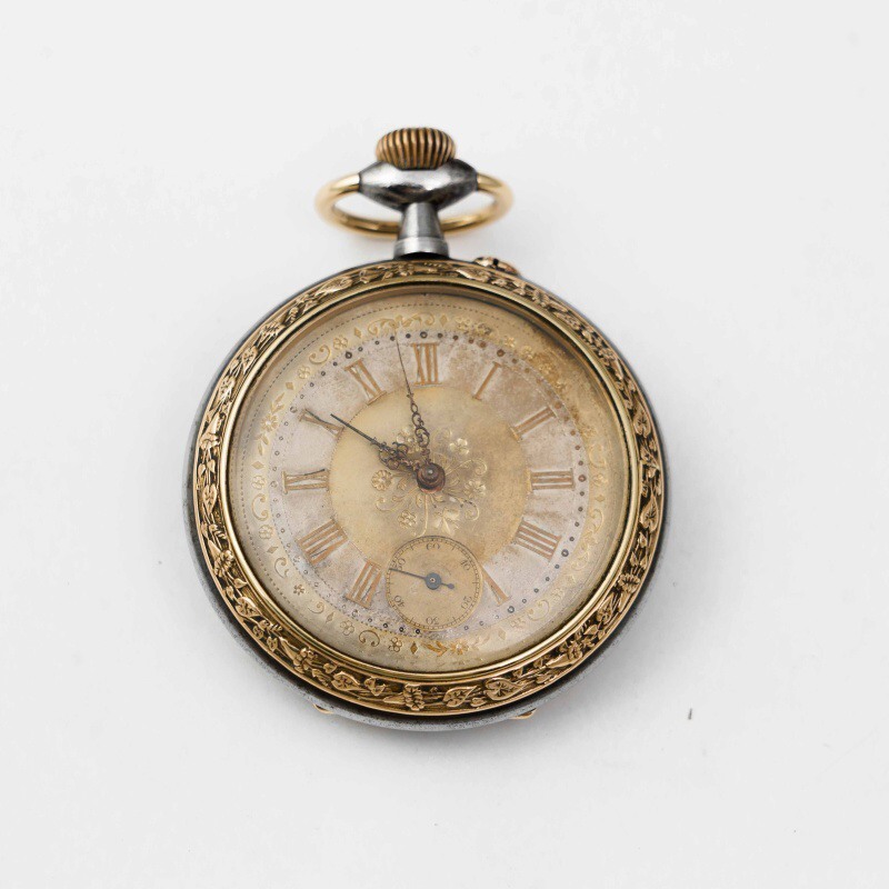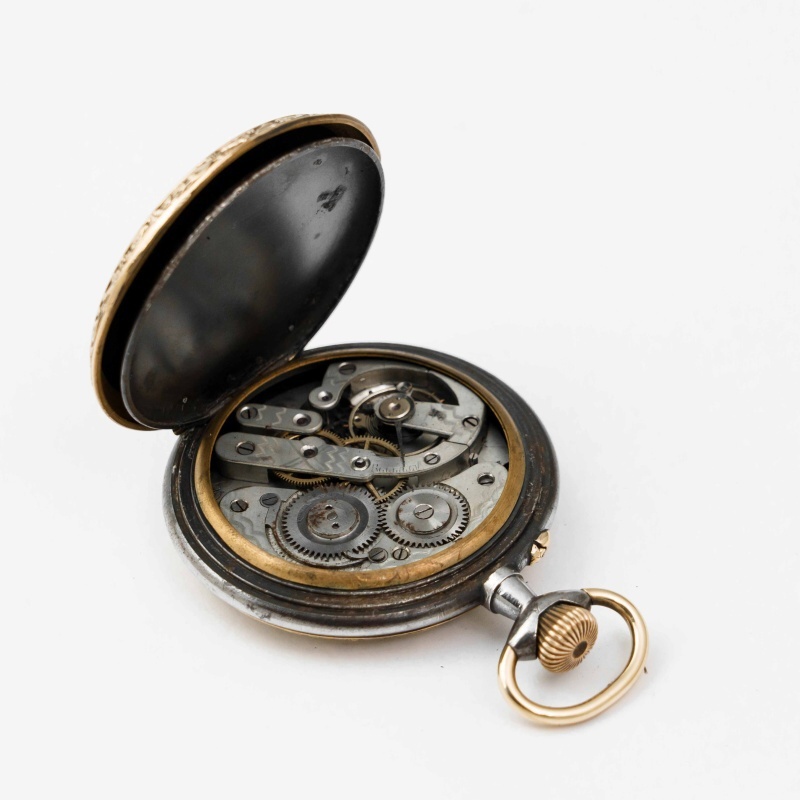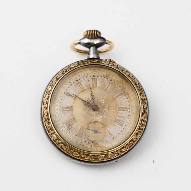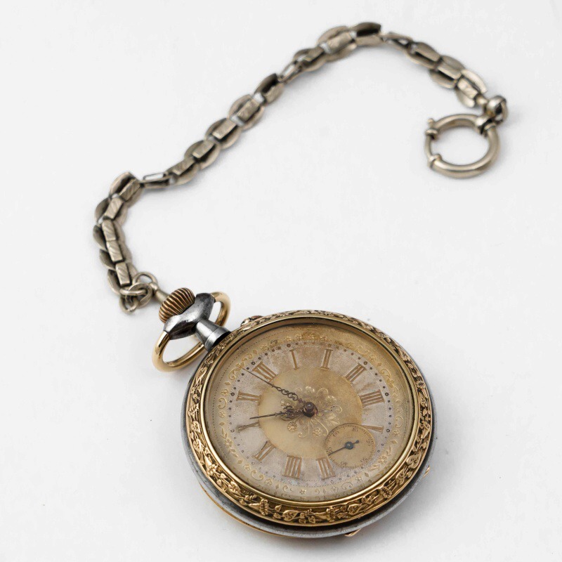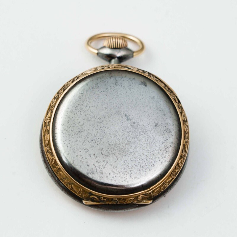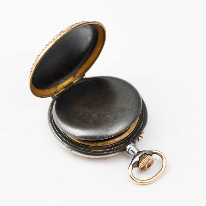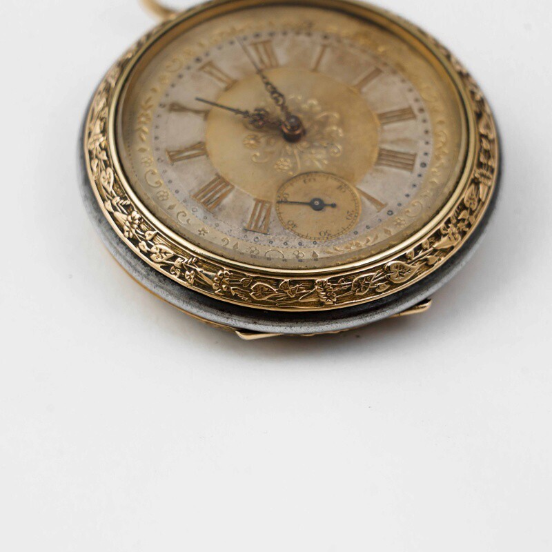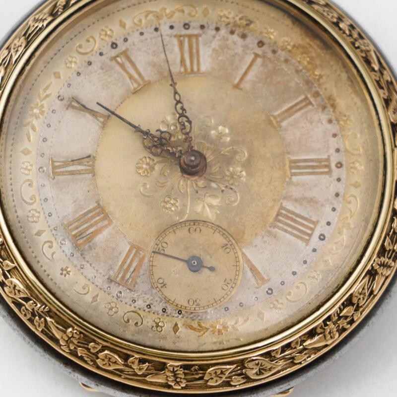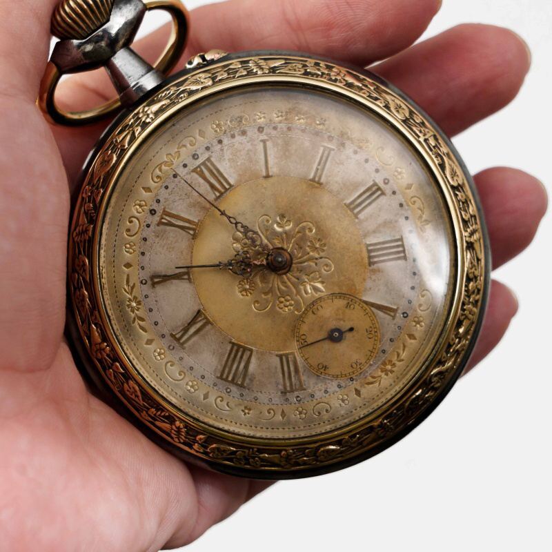 Старинные викторианские карманные часы, в корпусе из вороненной стали, бронзовый ободок, с красивым цветочным узором. Корпус не поврежден, крышки работают исправно. Красивый циферблат украшенный позолоченными вставками с цветочным орнаментом, большие золотые римские цифры и ажурные стрелки. Малая секундная стрелка в положении «6 часов». Завод — заводной головкой (Коронкой), кнопка перевода стрелок расположена с боку от заводной головки. Красивый никелированный анкерный механизм.