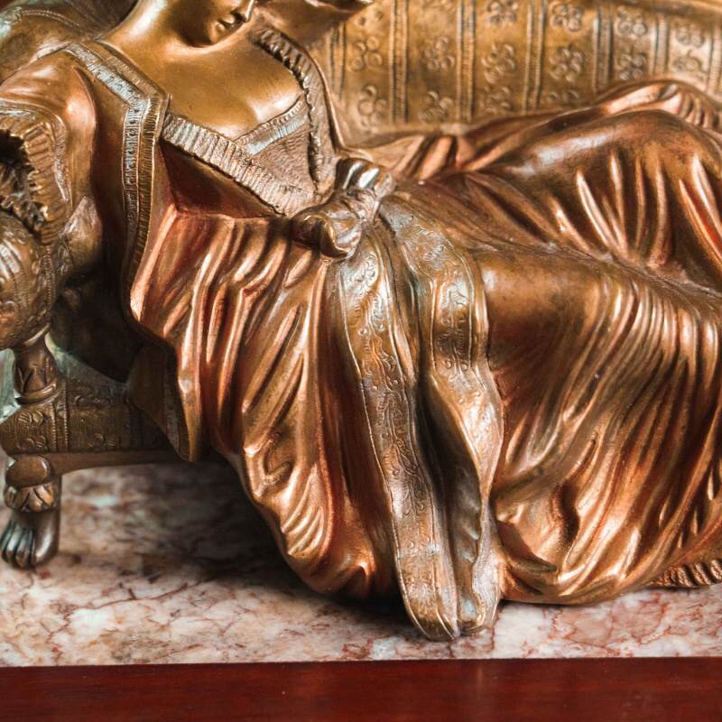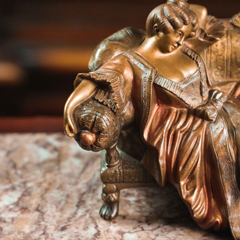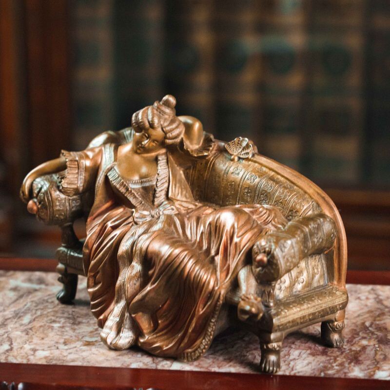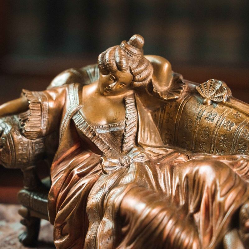 Изящная бронзовая скульптура малой пластики, изображающая даму в богатом платье, сидящую на диване с декоративными подлокотниками. Композиция наполнена атмосферой салонной жизни рубежа XIX–XX вв.: спокойная поза, мягкие линии одежды, тщательно проработанные детали мебели и тканевых складок создают ощущение уюта и интимности. Лицо дамы выражает лёгкую задумчивость и кокетливую грацию, что подчёркивает характерный для «венской бронзы» интерес к жанровым, бытовым и театрализованным сюжетам.