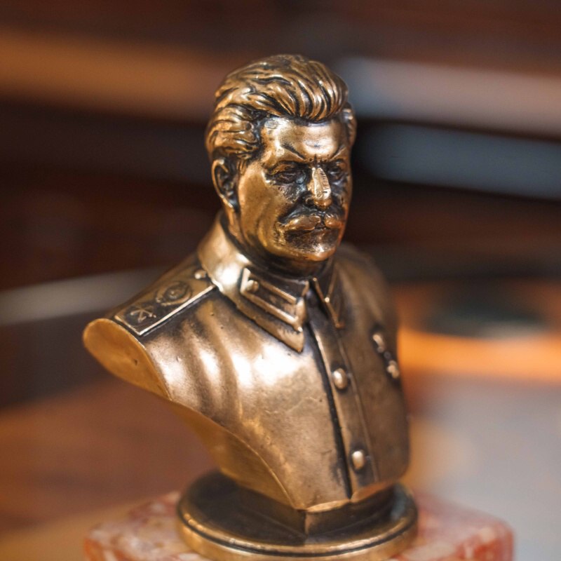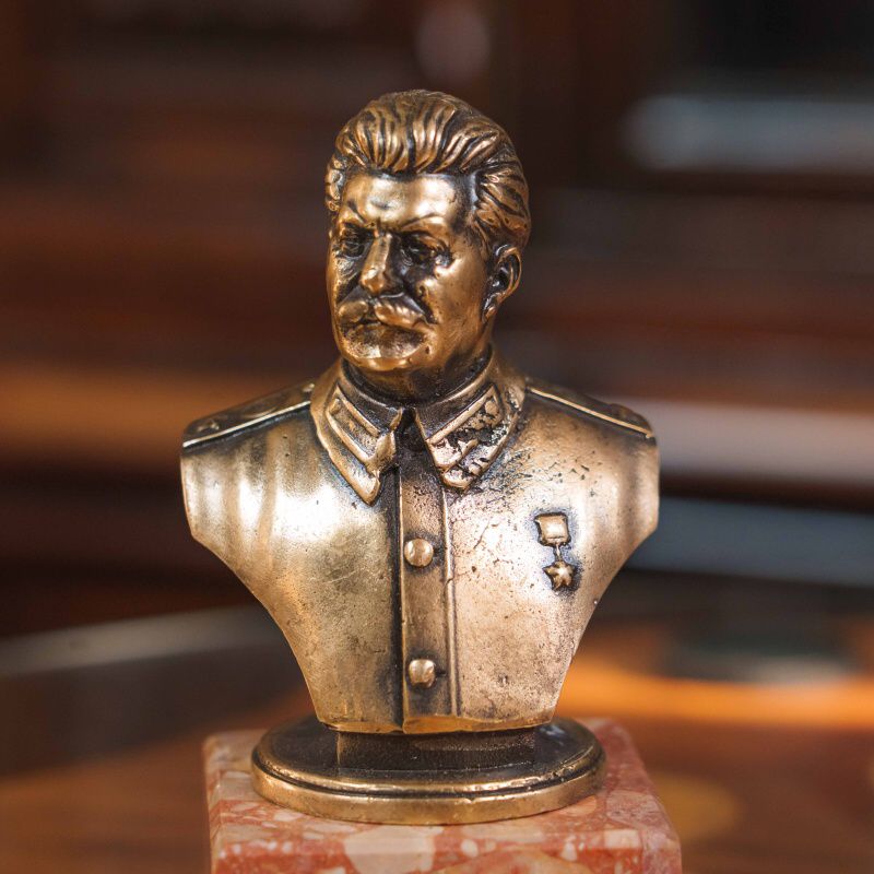 Кабинетный бюст Иосифа Сталина, выполненный из бронзы и установленный на мраморном основании, представляет собой выразительный предмет исторической и коллекционной тематики. Скульптура выполнена в характерной парадной манере, подчёркивающей узнаваемые черты образа и стилистику эпохи.