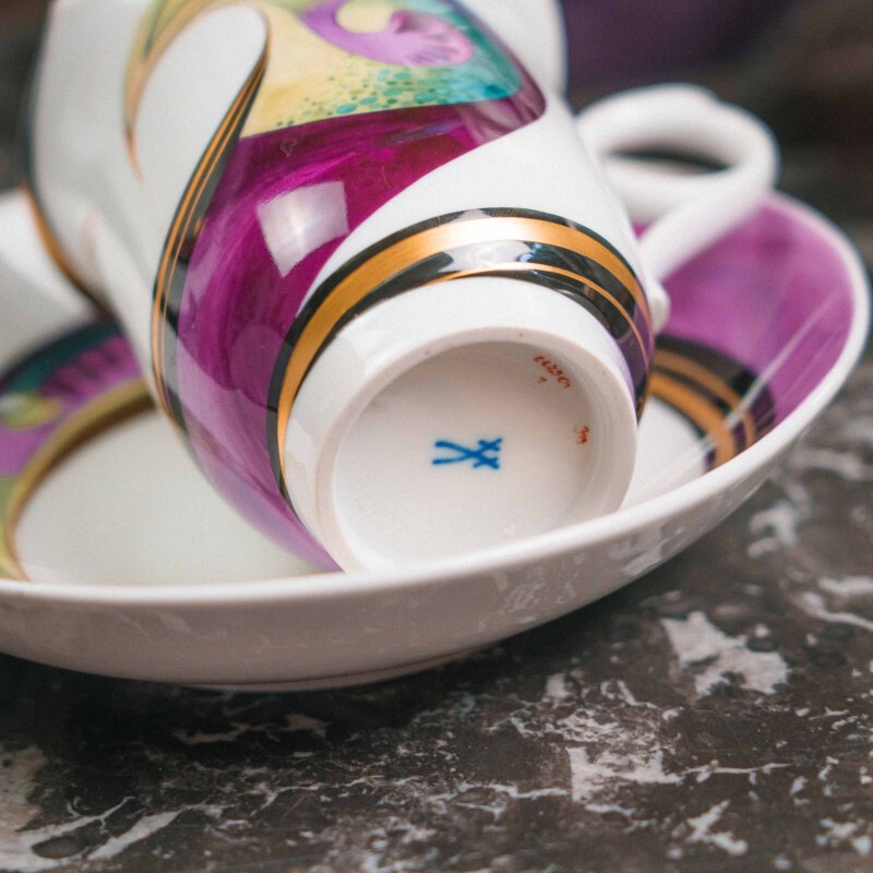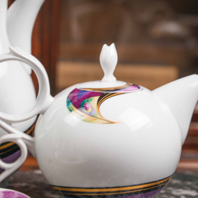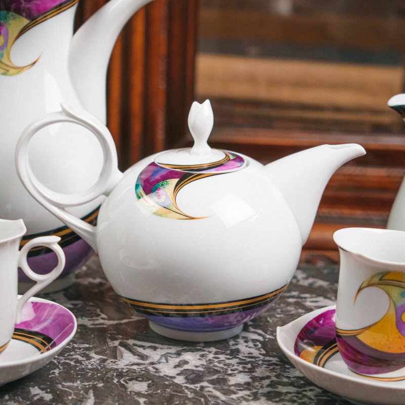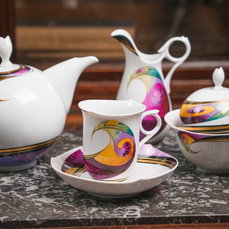 Характерные изогнутые ручки-кольца, утончённые крышки с «бутоном», элегантные вытянутые носики чайника и кофейника подчёркивают современную эстетическую линию Meissen.