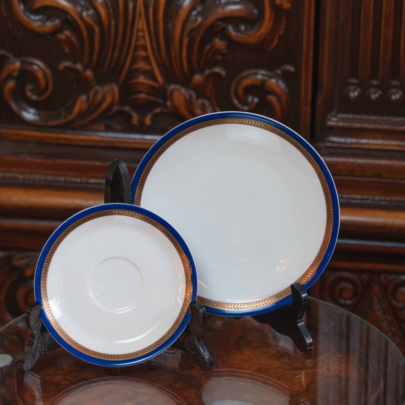 Дизайн представлен контрастом чистого белого фарфора и насыщенного кобальтового пояса, обрамленного тонким золотым орнаментом.