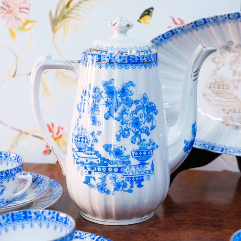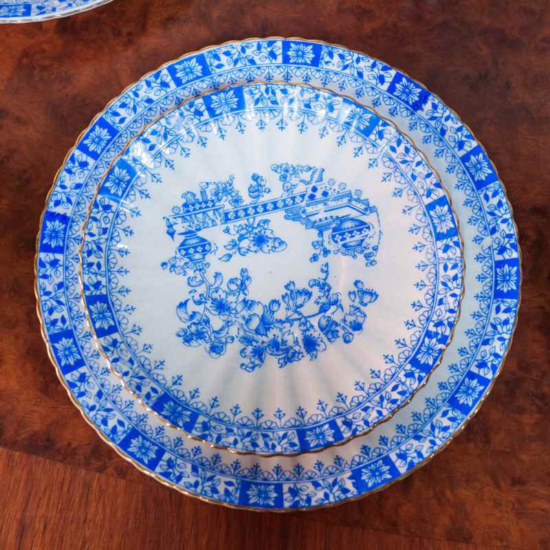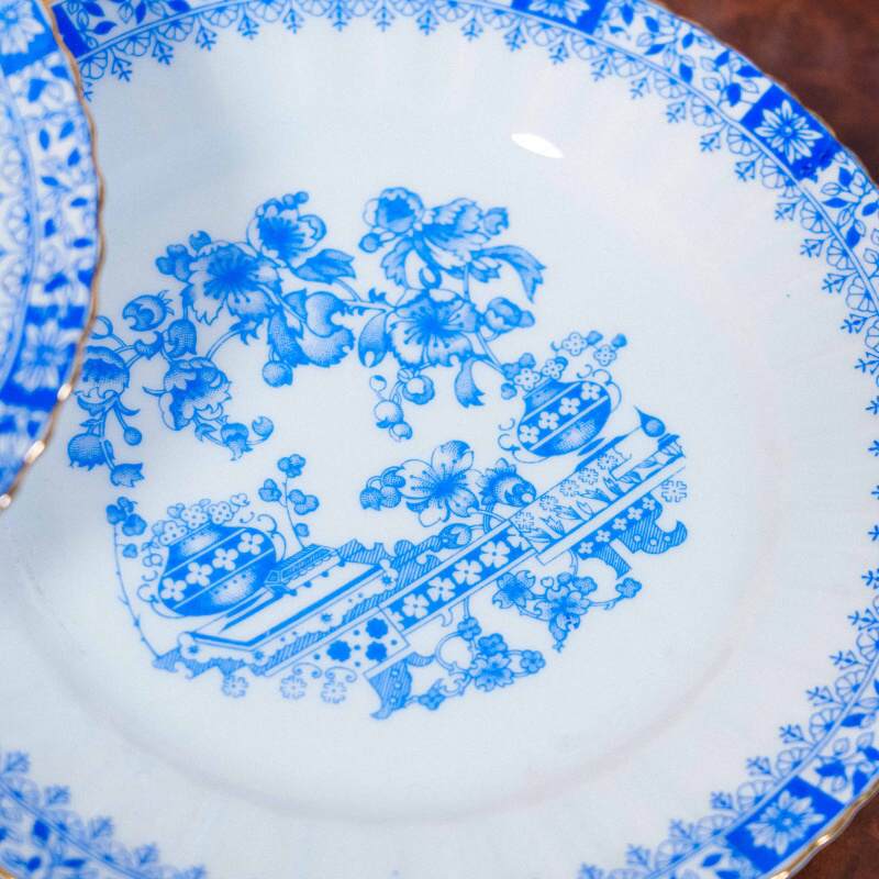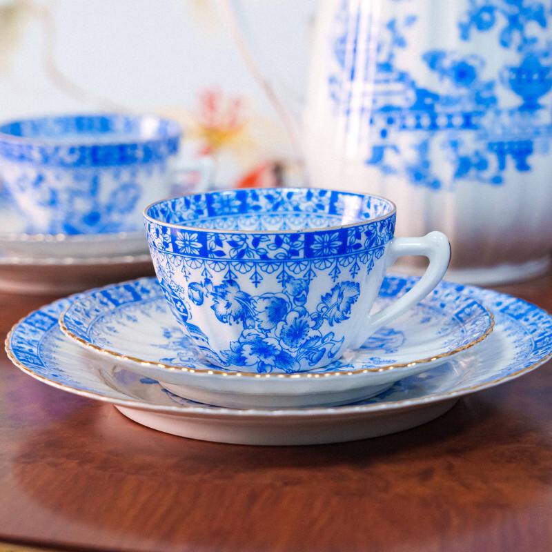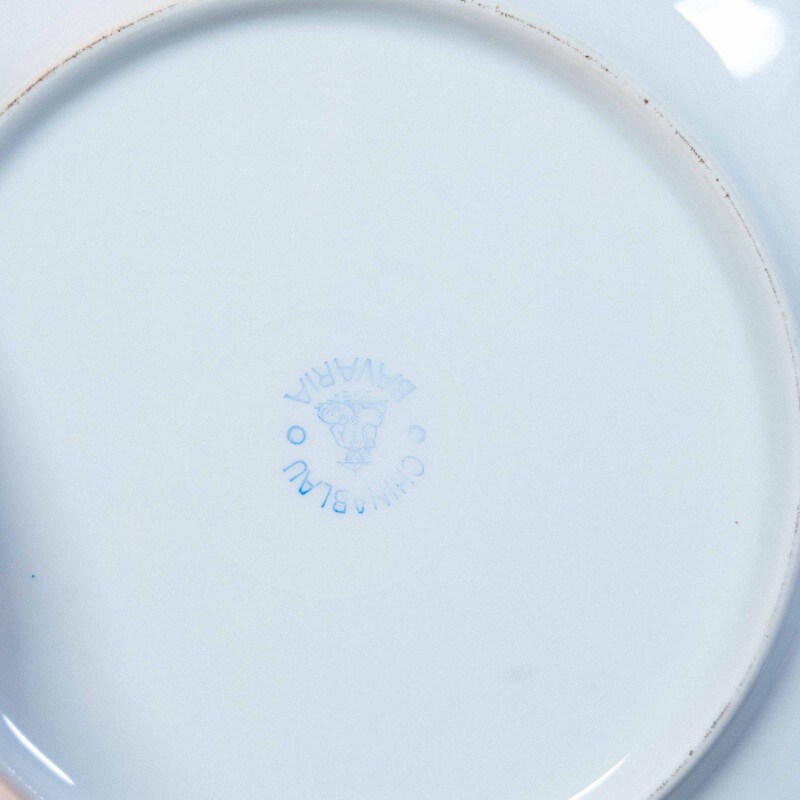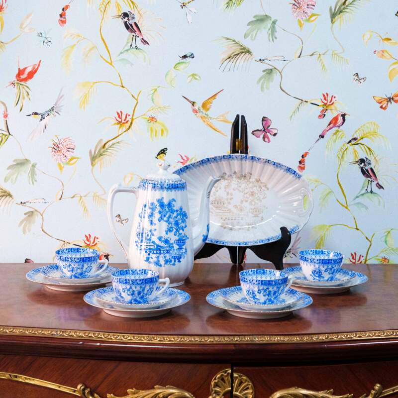 Чайный сервиз на 4 персоны, объединенный единым декоративным стилем Chinablau («китайский голубой»), представляет собой гармоничный ансамбль предметов, выполненных на различных немецких фарфоровых мануфактурах середины ХХ века. В составе сервиза — чайник, чайные пары, десертные тарелка и блюдо для десертов, при этом на отдельных предметах присутствуют клейма Chinablau Bavaria, Schumann Arzberg с указанием серии China Blau, а также Echt Tuppack Tiefenfurt.