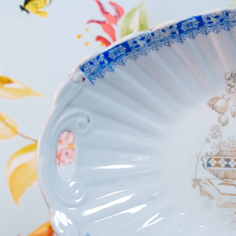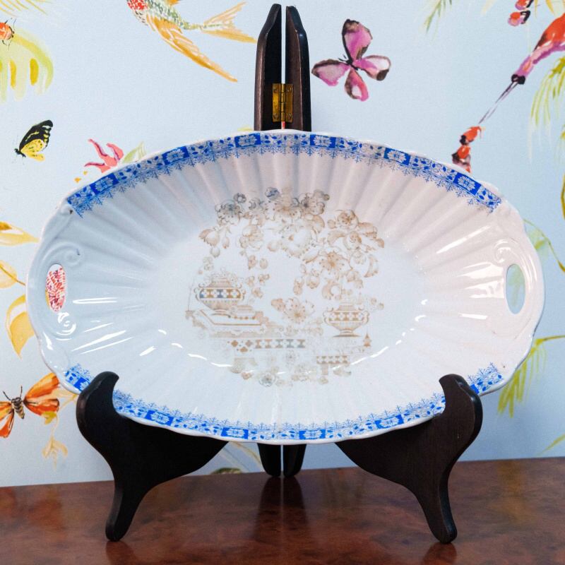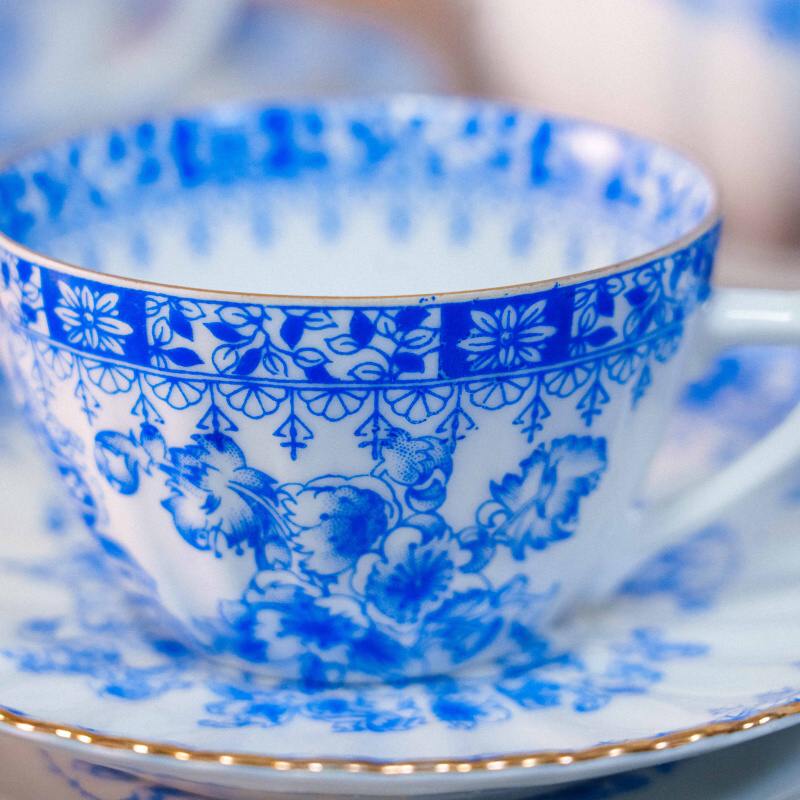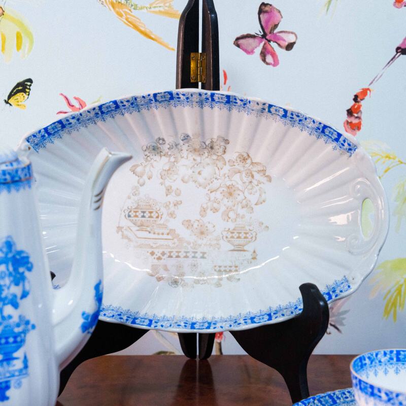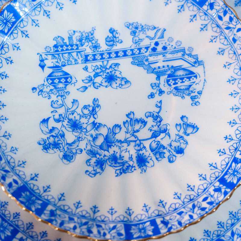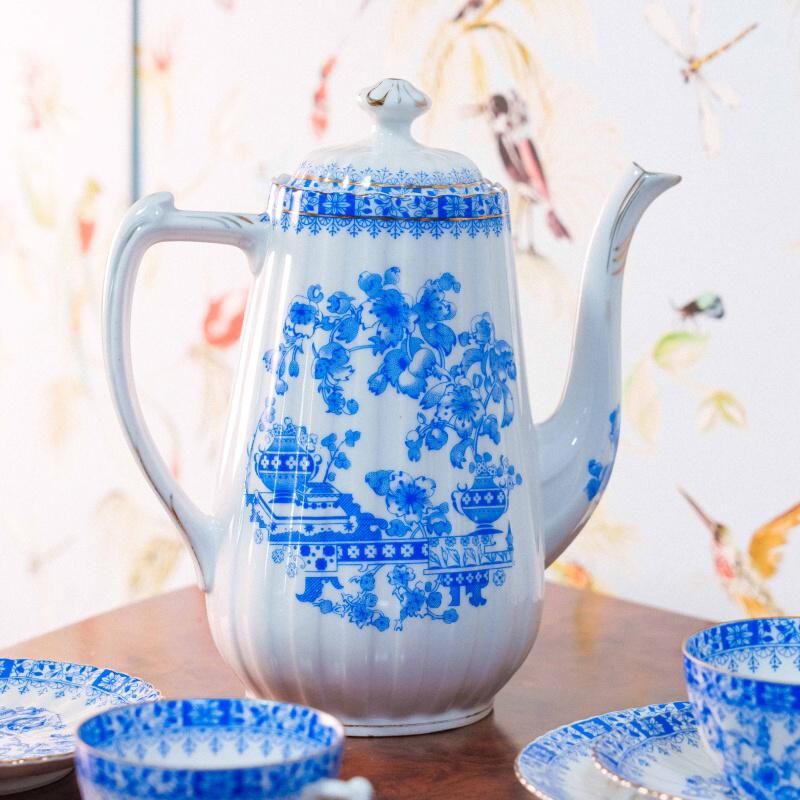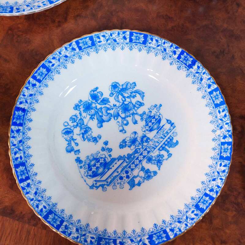 Чайный сервиз на 4 персоны, объединенный единым декоративным стилем Chinablau («китайский голубой»), представляет собой гармоничный ансамбль предметов, выполненных на различных немецких фарфоровых мануфактурах середины ХХ века. В составе сервиза — чайник, чайные пары, десертные тарелка и блюдо для десертов, при этом на отдельных предметах присутствуют клейма Chinablau Bavaria, Schumann Arzberg с указанием серии China Blau, а также Echt Tuppack Tiefenfurt.