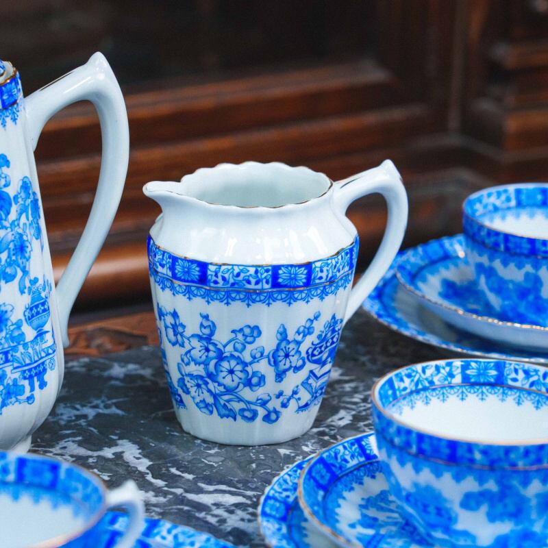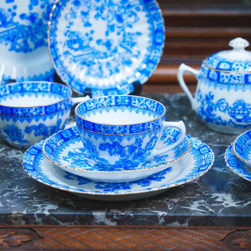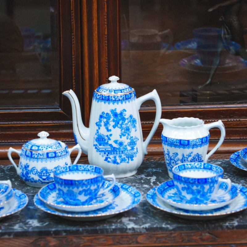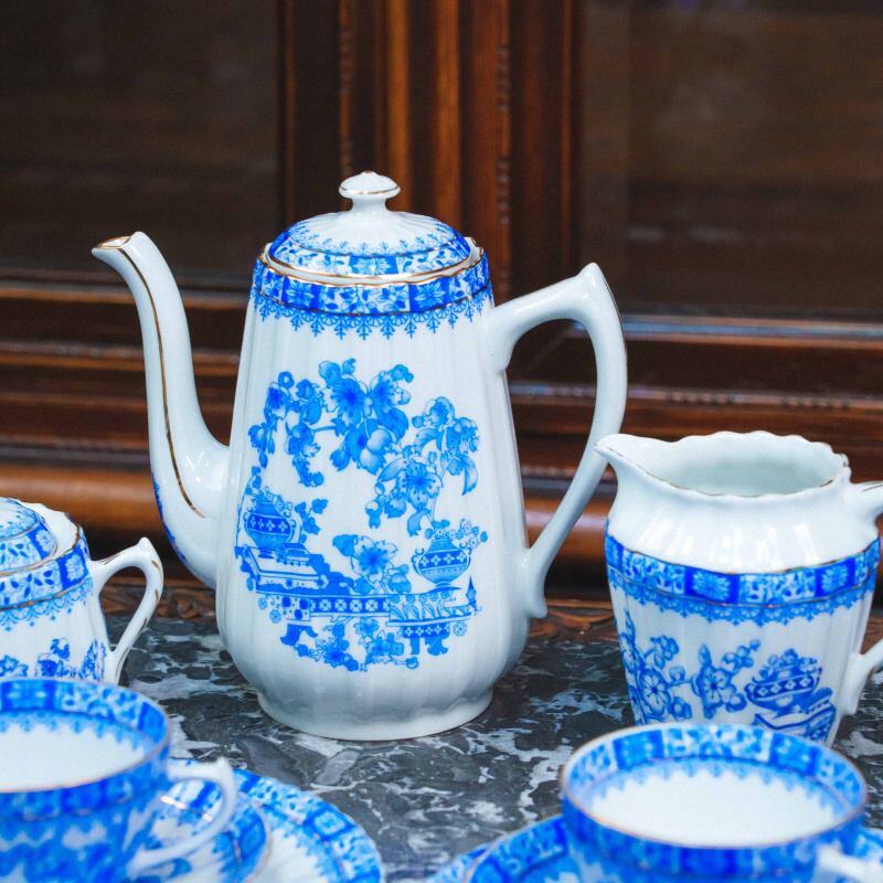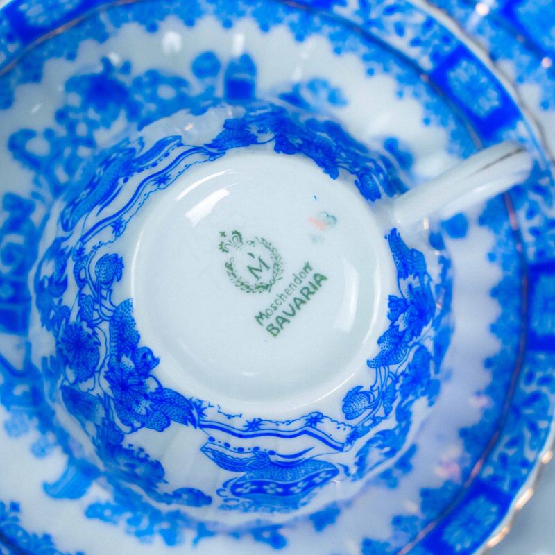 Чайный сервиз состоит из 21 предмета: чайник, молочник, сахарница, 6 чайных пар, 6 пирожковых тарелок. Элегантный чайный сервиз, произведённый на немецкой фарфоровой мануфактуре Moschendorf, известной качественным столовым фарфором и аккуратным декоративным исполнением. Сервиз выполнен из тонкого белого фарфора и украшен выразительным кобальтово-синим орнаментом с цветочными гирляндами и декоративными композициями, дополненными изящной позолотой по краям. Декор выдержан в классической европейской традиции: насыщенный синий цвет эффектно контрастирует с белым фоном, а тонкие золотые линии подчёркивают форму каждого предмета, придавая сервизу нарядный и благородный вид. Орнамент распределён гармонично, без перегруженности, благодаря чему сервиз выглядит цельным и визуально лёгким.