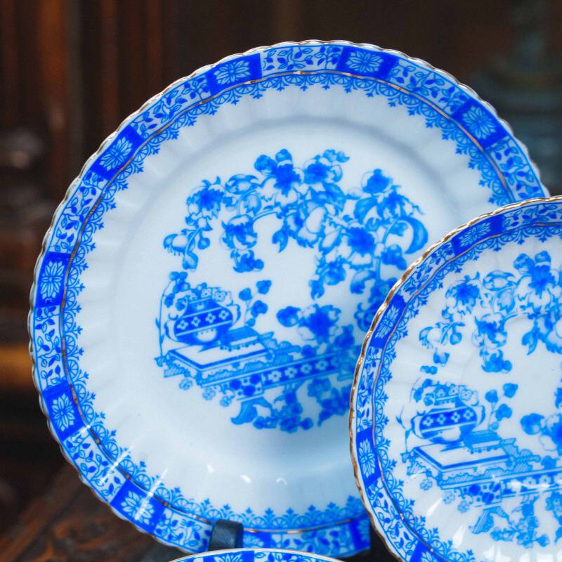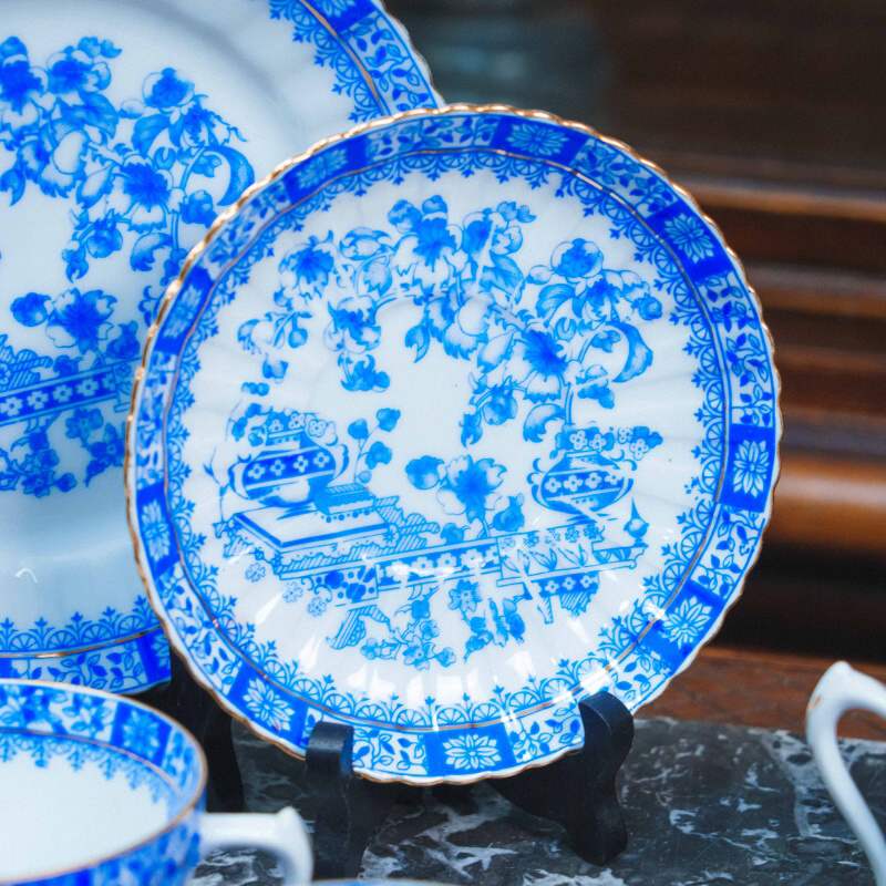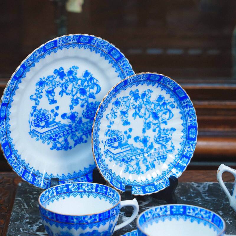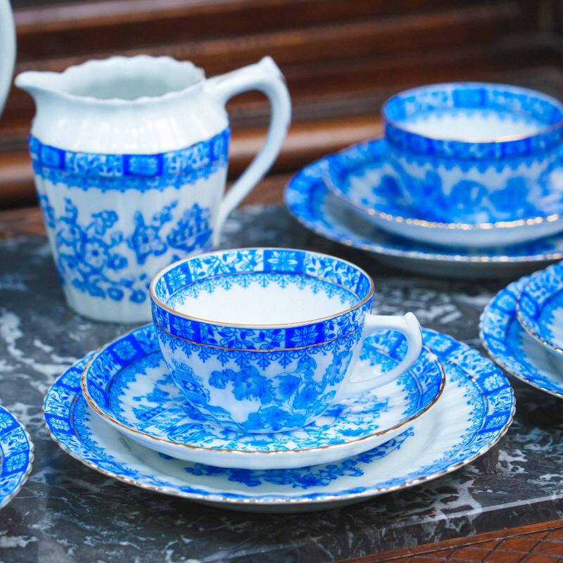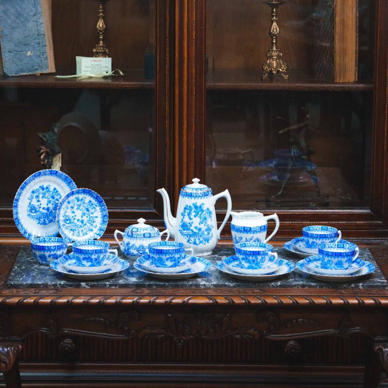 Чайный сервиз состоит из 21 предмета: чайник, молочник, сахарница, 6 чайных пар, 6 пирожковых тарелок. Элегантный чайный сервиз, произведённый на немецкой фарфоровой мануфактуре Moschendorf, известной качественным столовым фарфором и аккуратным декоративным исполнением. Сервиз выполнен из тонкого белого фарфора и украшен выразительным кобальтово-синим орнаментом с цветочными гирляндами и декоративными композициями, дополненными изящной позолотой по краям. Декор выдержан в классической европейской традиции: насыщенный синий цвет эффектно контрастирует с белым фоном, а тонкие золотые линии подчёркивают форму каждого предмета, придавая сервизу нарядный и благородный вид. Орнамент распределён гармонично, без перегруженности, благодаря чему сервиз выглядит цельным и визуально лёгким.