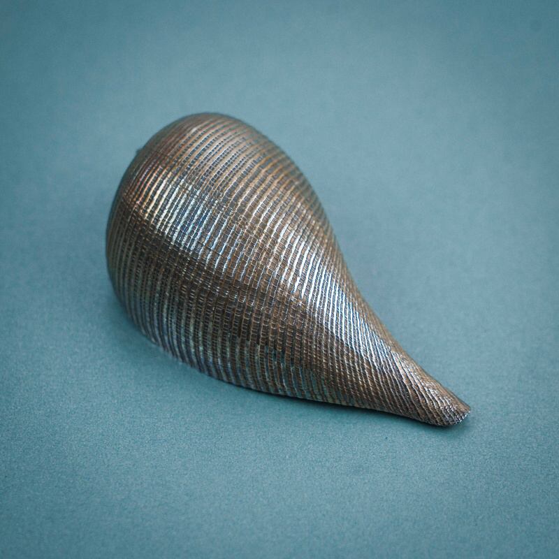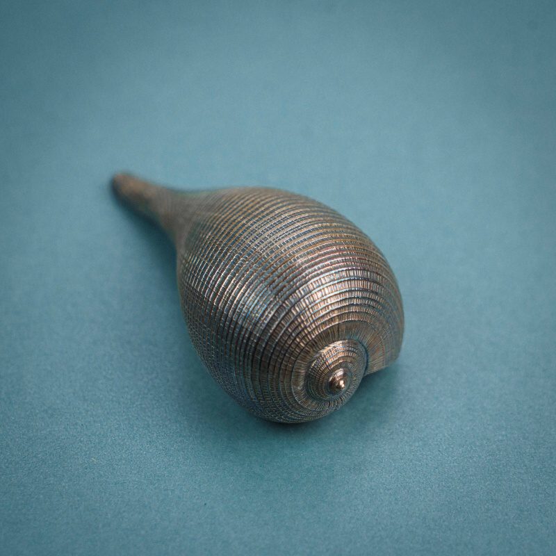Декоративная раковина, в основе которой — настоящая морская раковина, покрытая серебром. Мастер бережно сохраняет ее природную форму, лишь подчеркивая рельеф: поверхность остается живой, с характерной пластикой морского происхождения.