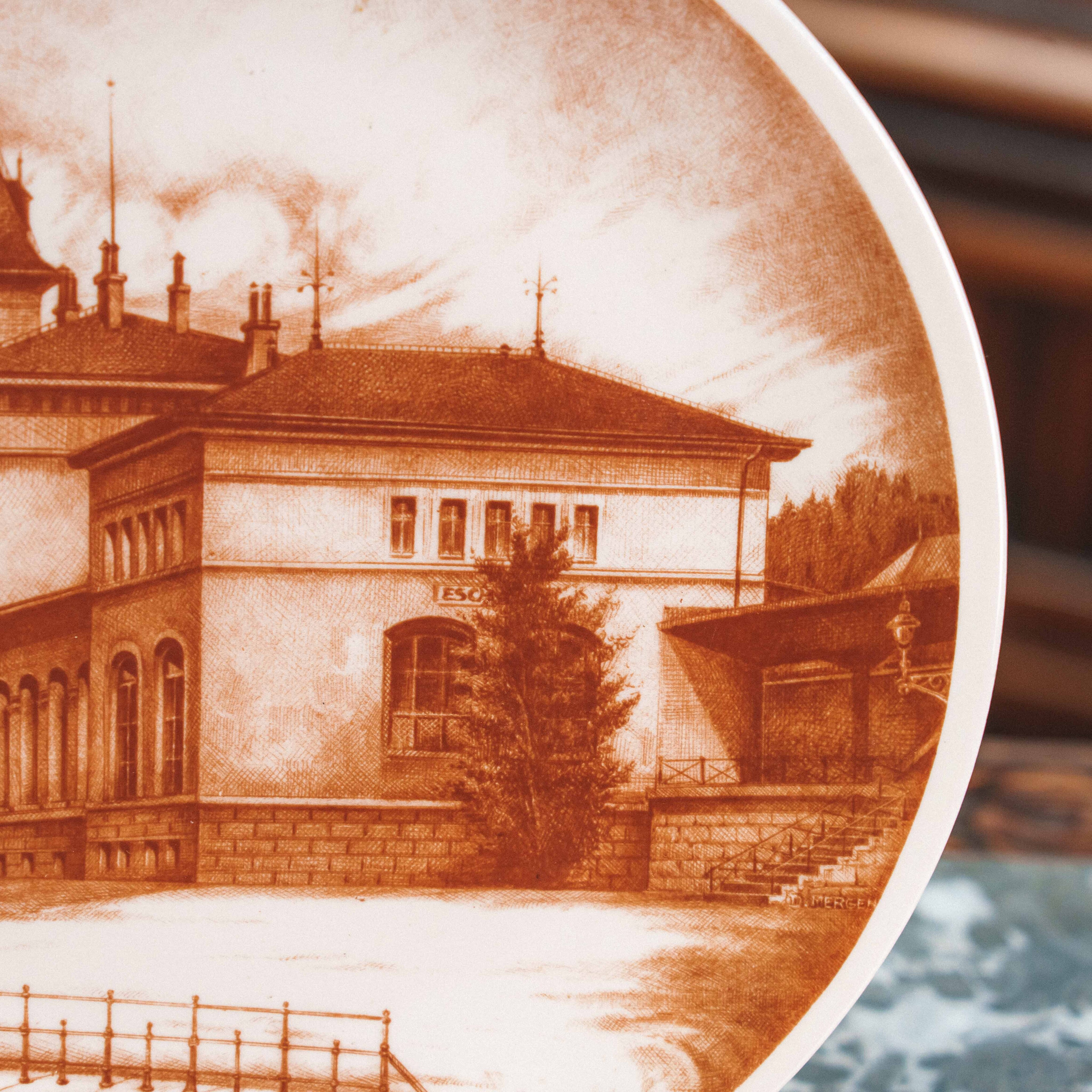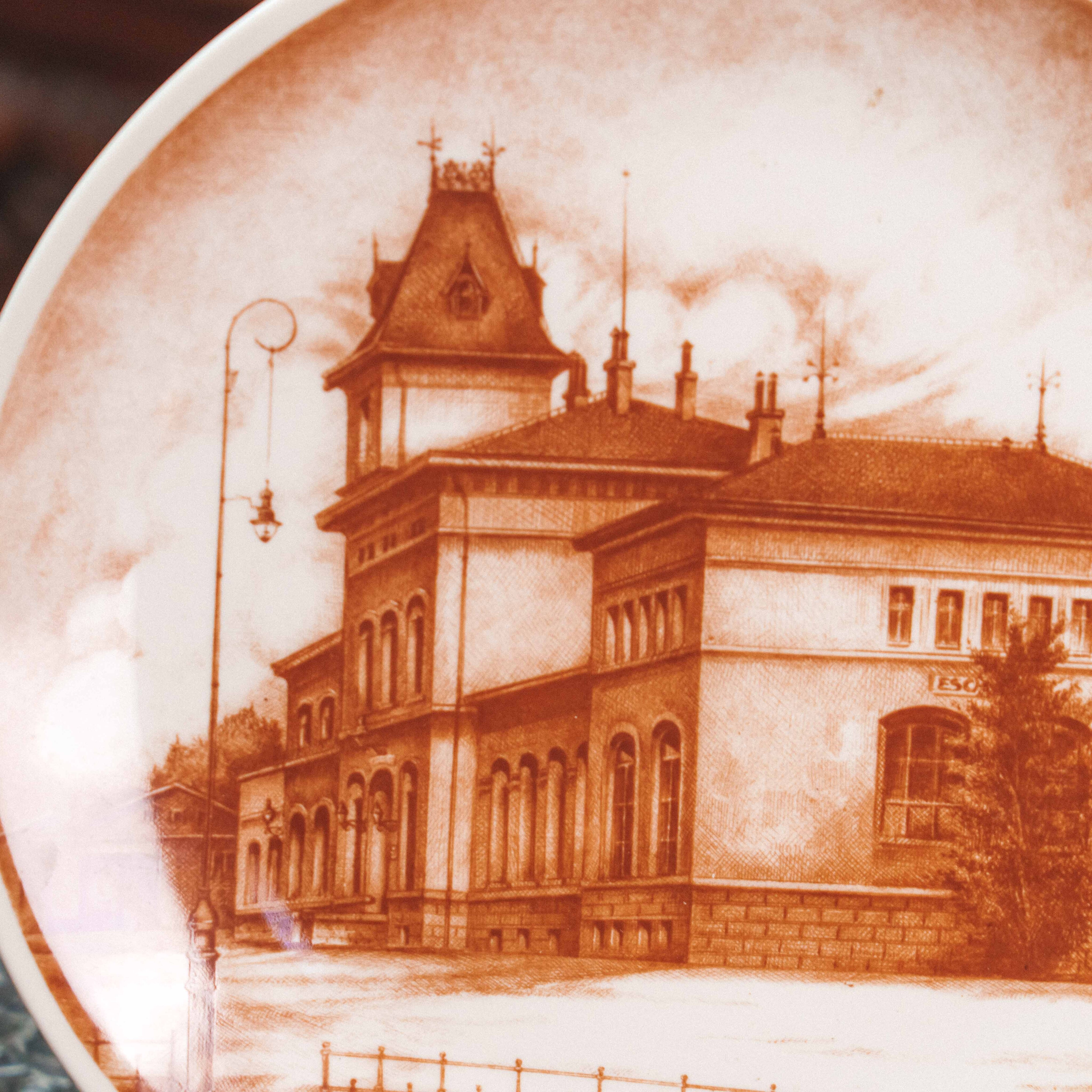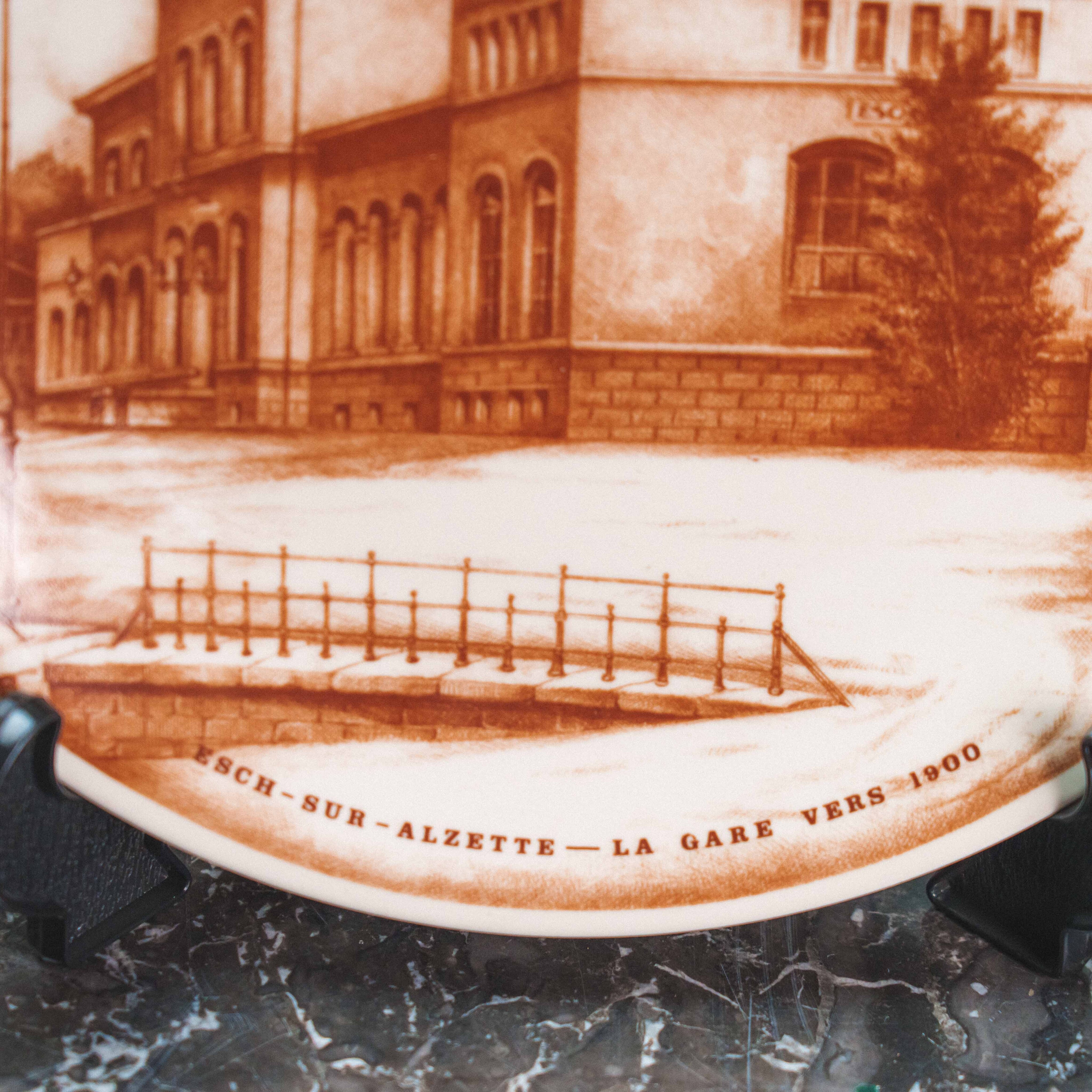 Коллекционная декоративная тарелка мануфактуры Villeroy & Boch из серии Les Cheminots Philatélistes, посвящённой истории европейских железных дорог. На тарелке изображено здание вокзала Эш-сюр-Альзетт (Esch-sur-Alzette) — один из характерных архитектурных памятников конца XIX – начала XX века, выполненный в стиле эклектики с элементами неоренессанса. Тёплая сепийная гамма придаёт композиции ощущение старинной гравюры и создаёт эффект путешествия во времени. Детальная прорисовка фасадов, окон, кровли и окружающего ландшафта подчёркивает документальную точность и художественную выразительность сюжета.