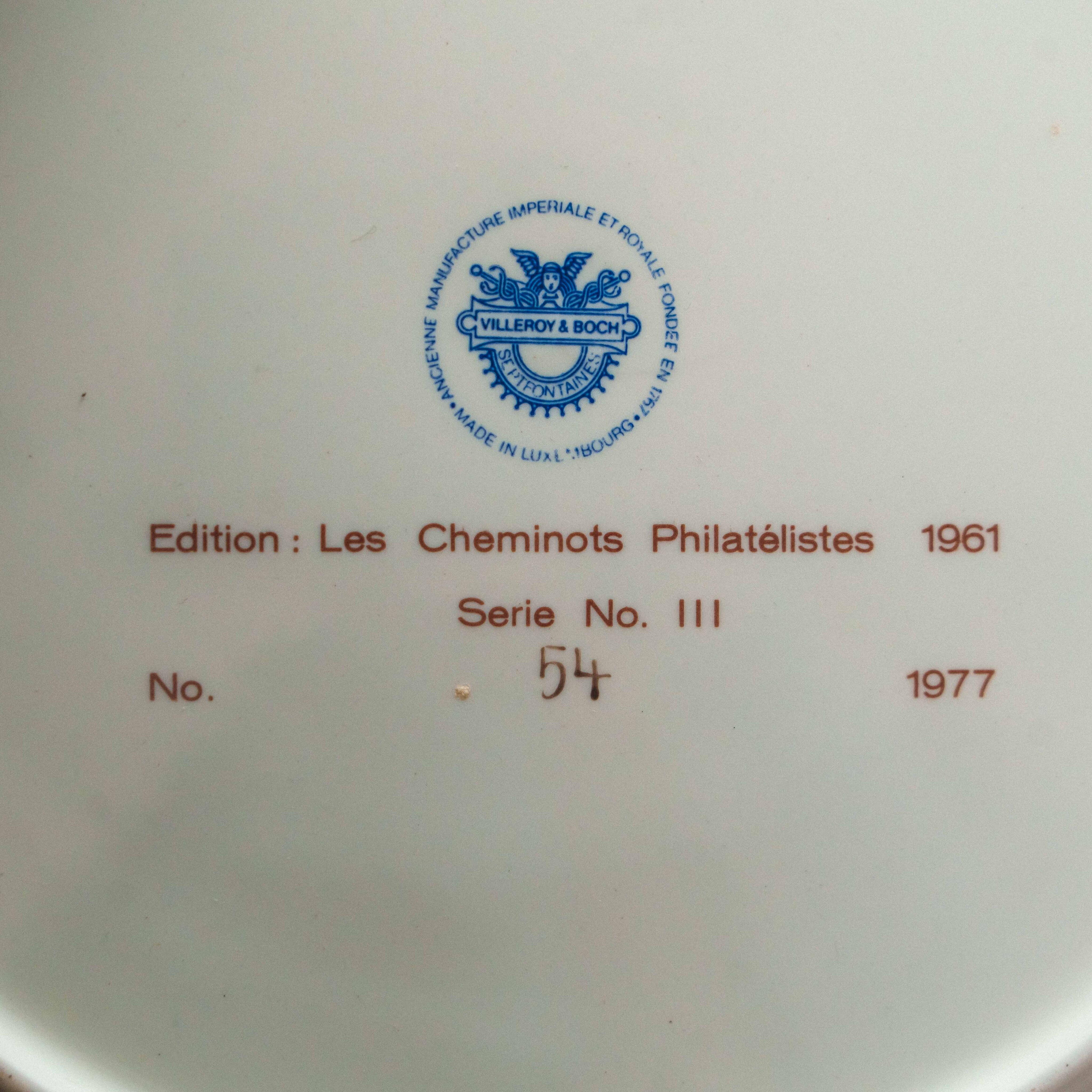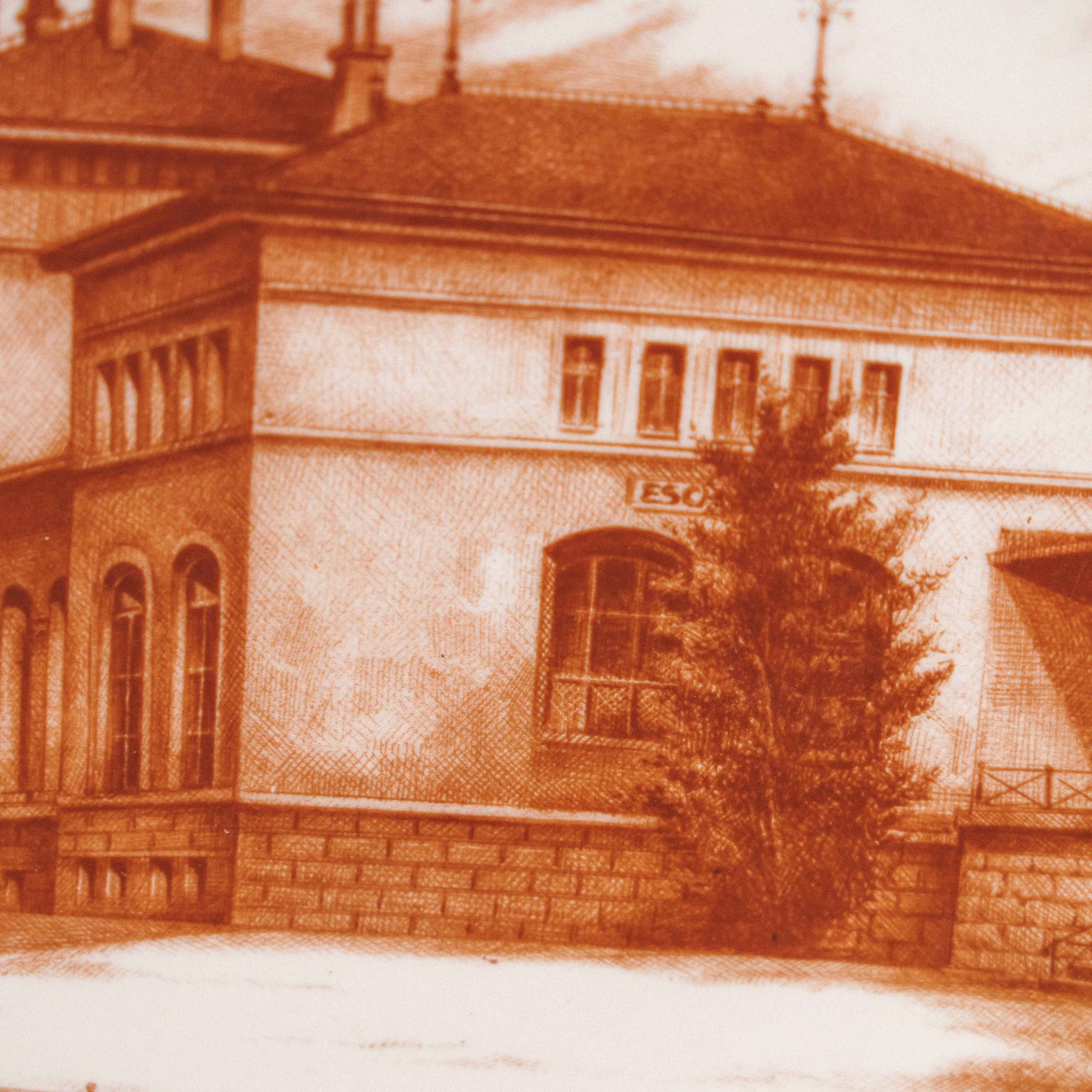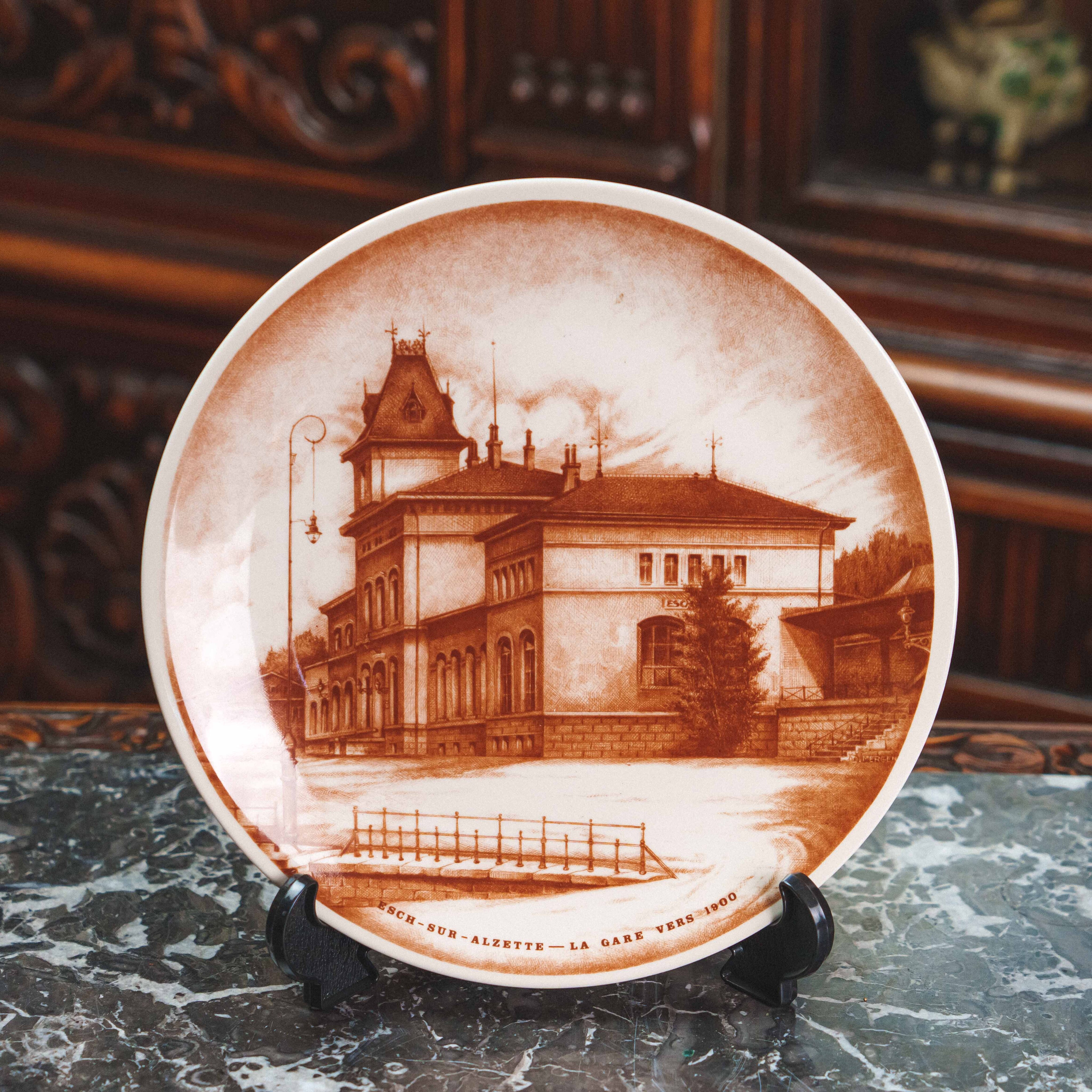 Коллекционная декоративная тарелка мануфактуры Villeroy & Boch из серии Les Cheminots Philatélistes, посвящённой истории европейских железных дорог. На тарелке изображено здание вокзала Эш-сюр-Альзетт (Esch-sur-Alzette) — один из характерных архитектурных памятников конца XIX – начала XX века, выполненный в стиле эклектики с элементами неоренессанса. Тёплая сепийная гамма придаёт композиции ощущение старинной гравюры и создаёт эффект путешествия во времени. Детальная прорисовка фасадов, окон, кровли и окружающего ландшафта подчёркивает документальную точность и художественную выразительность сюжета.