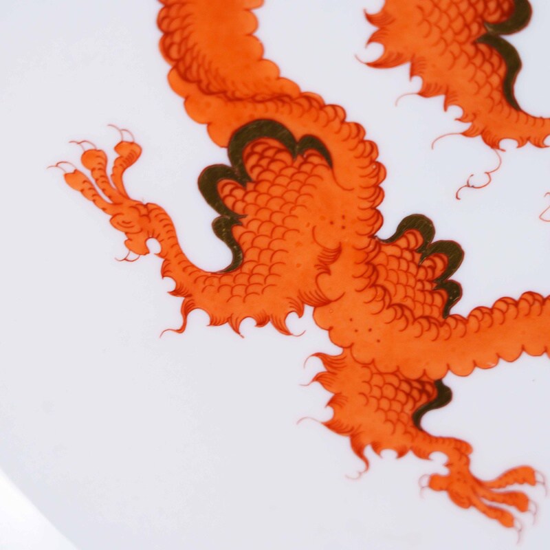 Декоративная фарфоровая тарелка выполнена по мотивам знаменитого «драконьего» сюжета, восходящего к восточным композициям, интерпретированным и популяризированным европейским фарфором мануфактуры Meissen. В центре представлена динамичная фигура огненно-красного дракона с детально проработанной чешуёй, когтями и выразительной мордой, изображённого в характерном для китайской традиции движении — в погоне за «огненной жемчужиной», символом мудрости, силы и бессмертия.