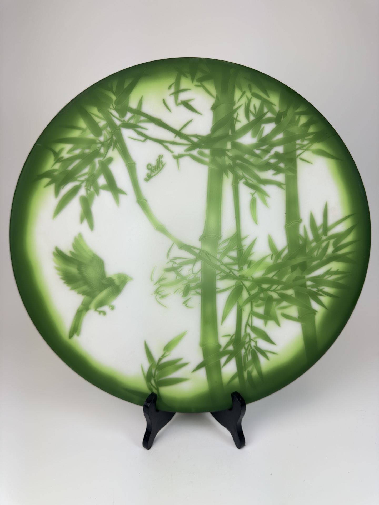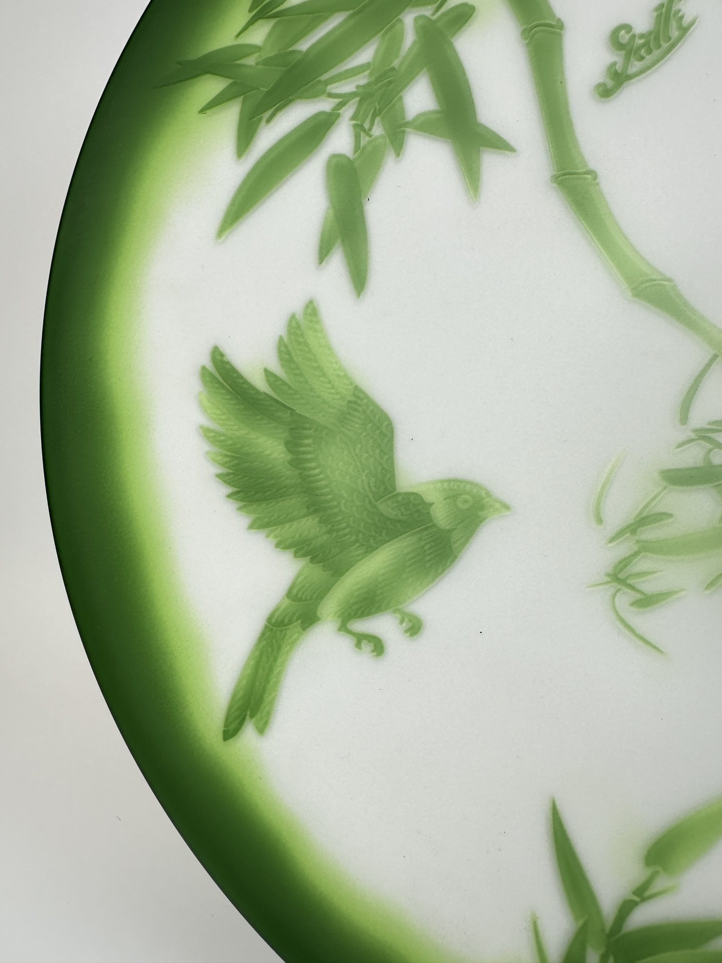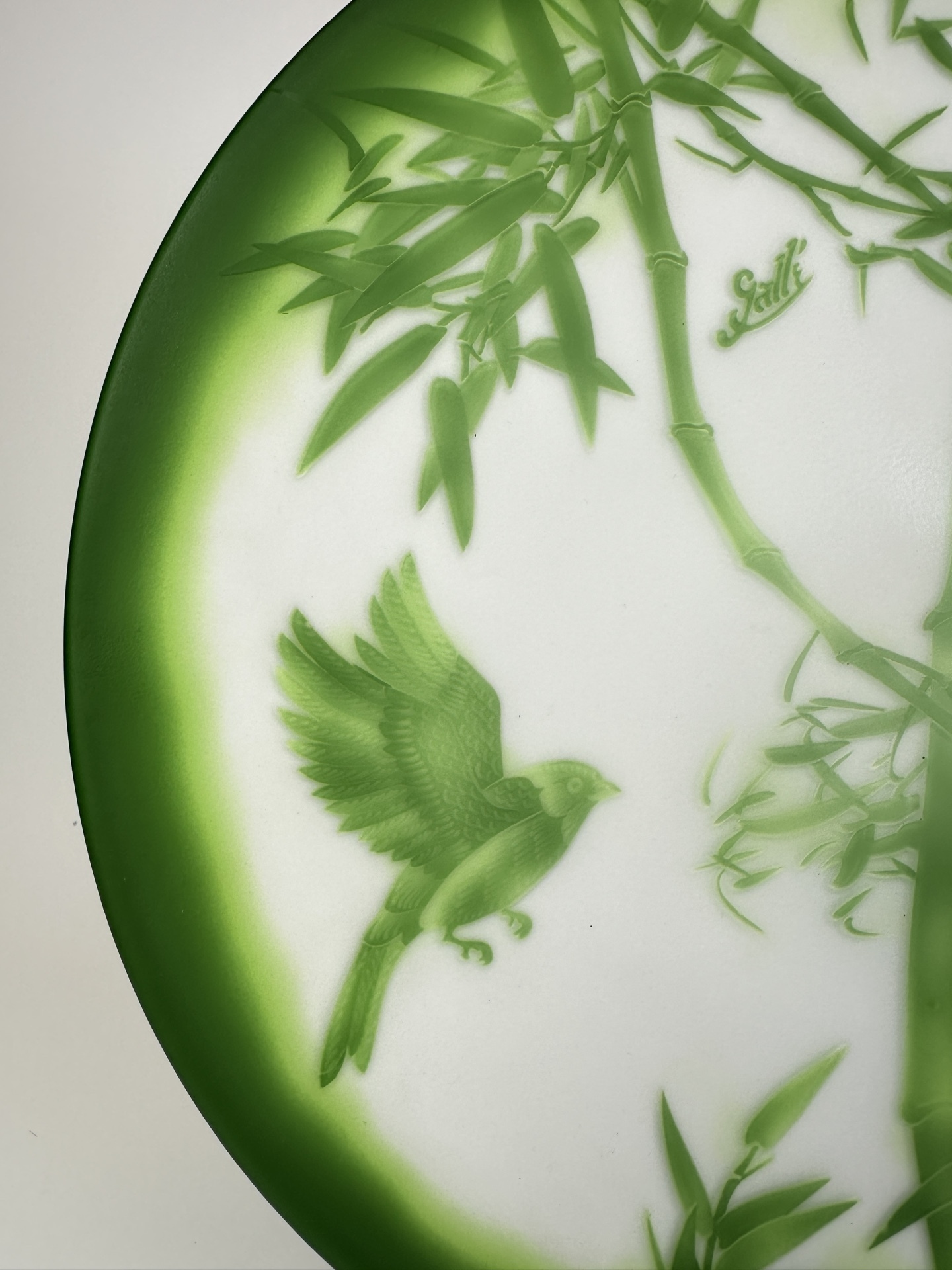 Декоративная стеклянная тарелка в стиле Эмиля Галле (Emile Galle) с мотивом бамбукового леса и птицей.