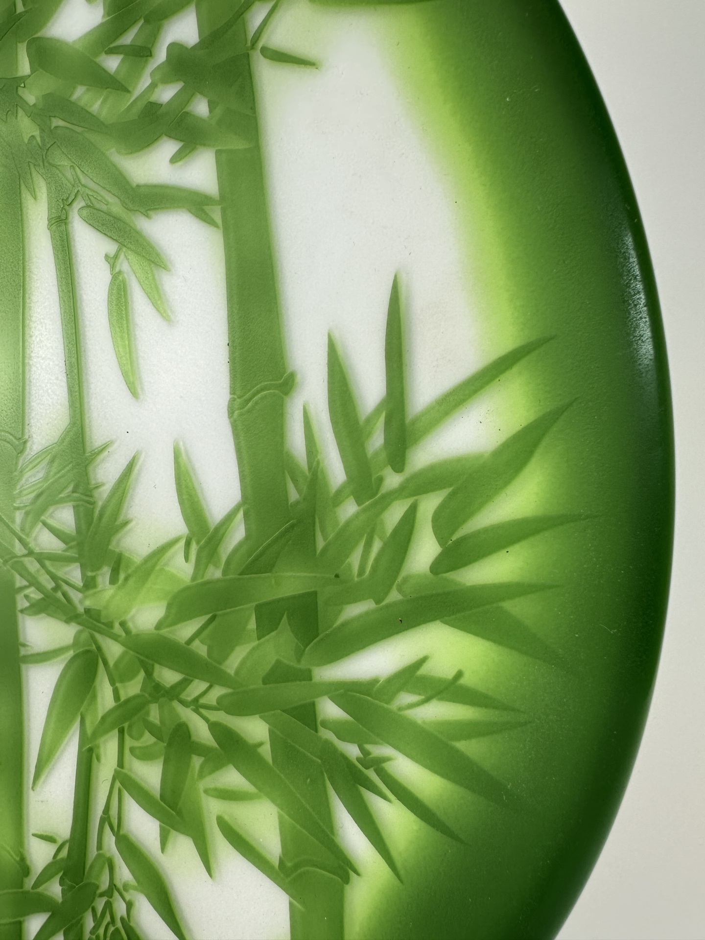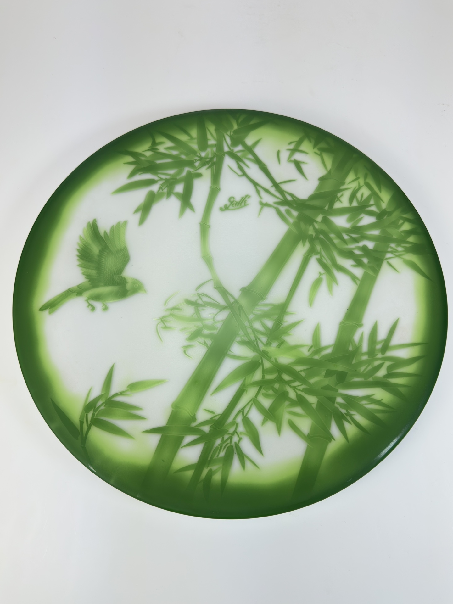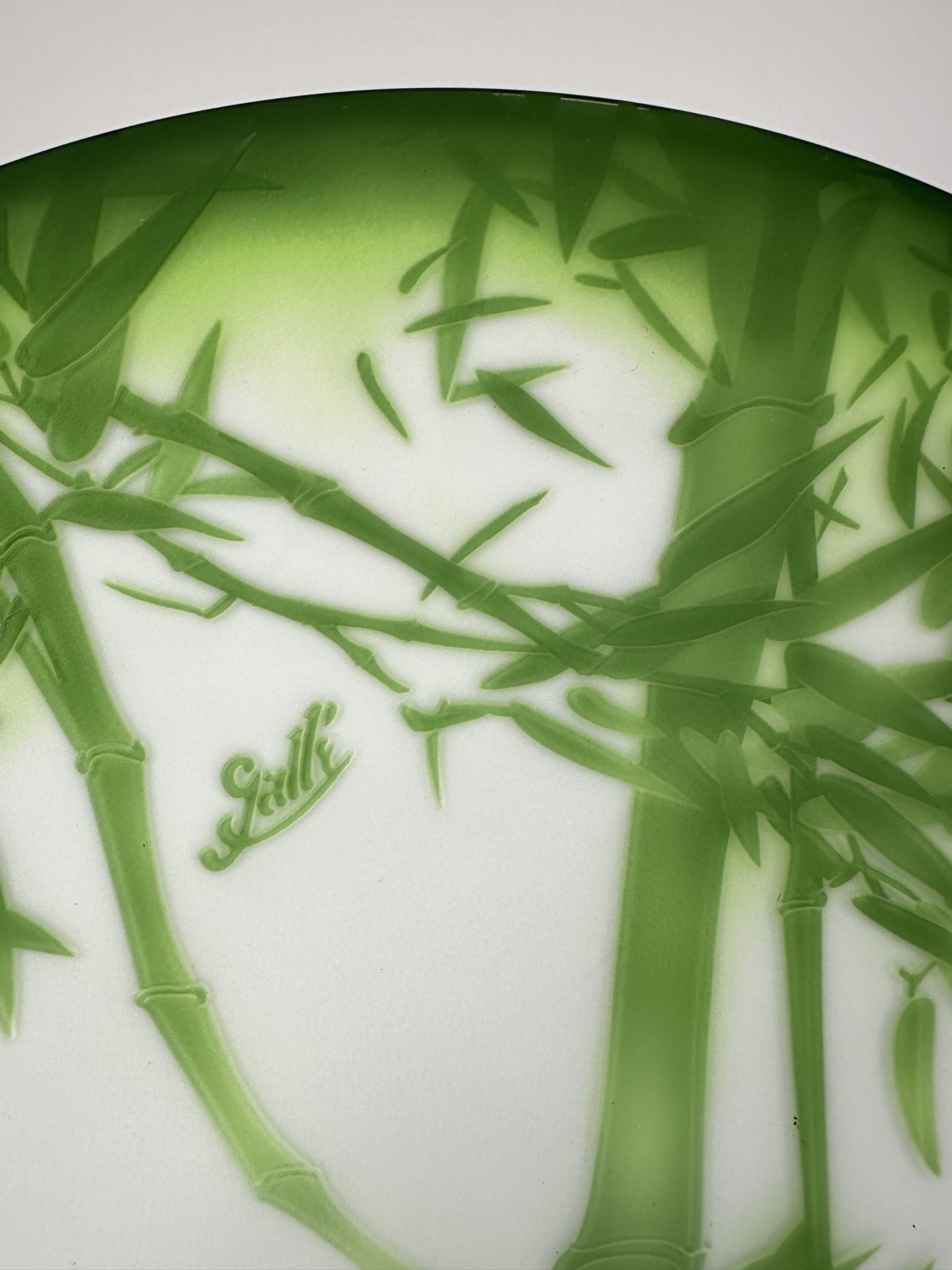 Декоративная стеклянная тарелка в стиле Эмиля Галле (Emile Galle) с мотивом бамбукового леса и птицей.