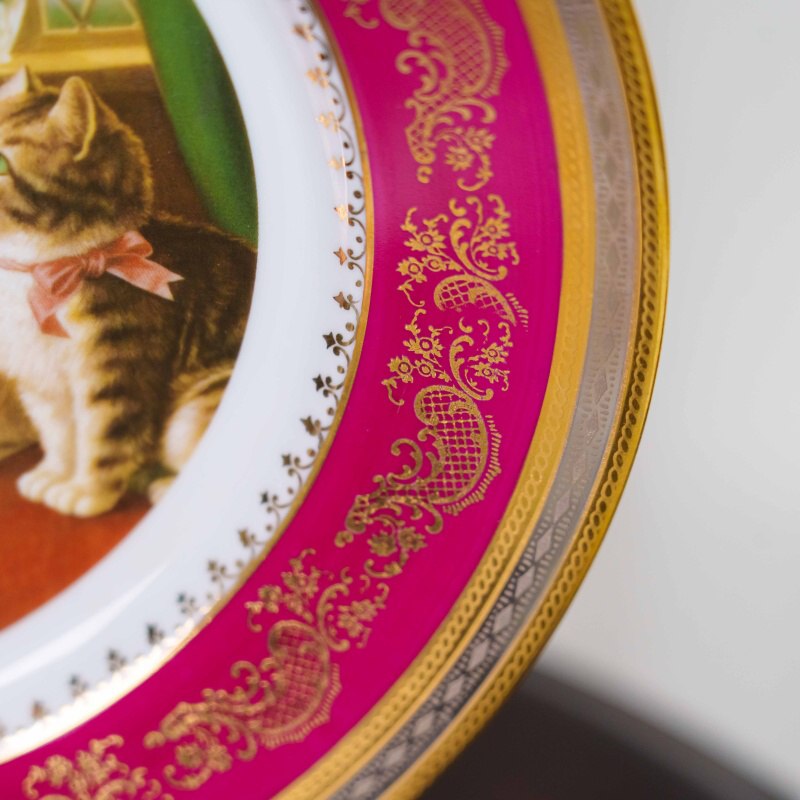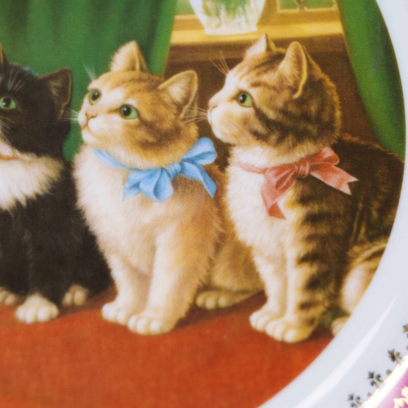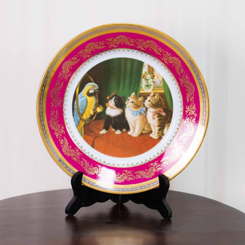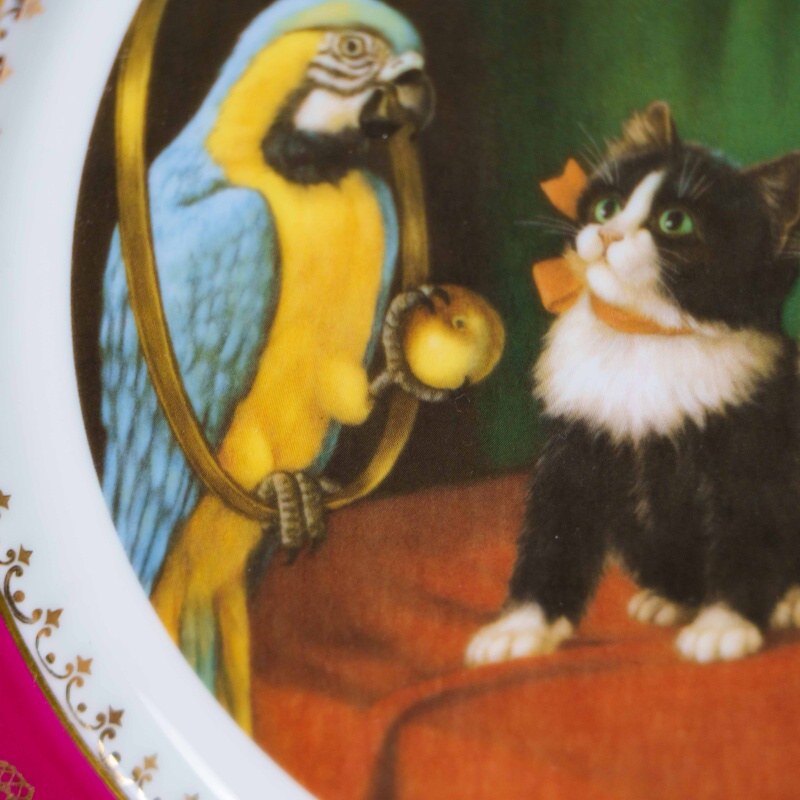 Декоративная фарфоровая тарелка французской мануфактуры Limoges, выполненная в изящной художественной традиции. В центральной композиции — очаровательная сценка: три нарядных котёнка с аккуратными бантами внимательно слушают яркого попугая, сидящего на зеркальной раме и держащего в лапке яблоко. Сюжет словно оживает — котята замерли в ожидании, их взгляды полны любопытства и лёгкого восторга. Атмосфера напоминает иллюстрацию к детской книге XIX века — тёплый интерьер, зелёная портьера, окно с цветами на заднем плане.