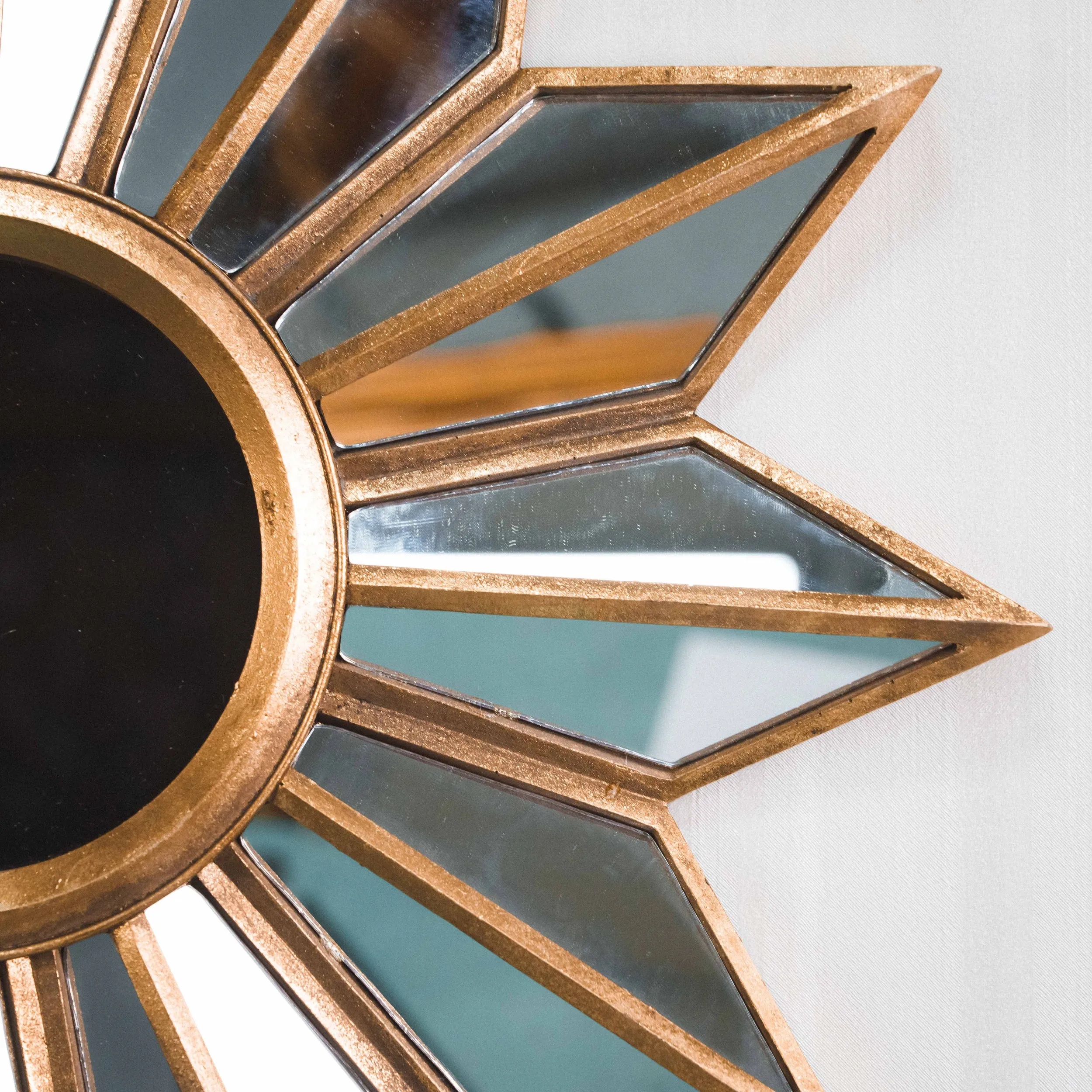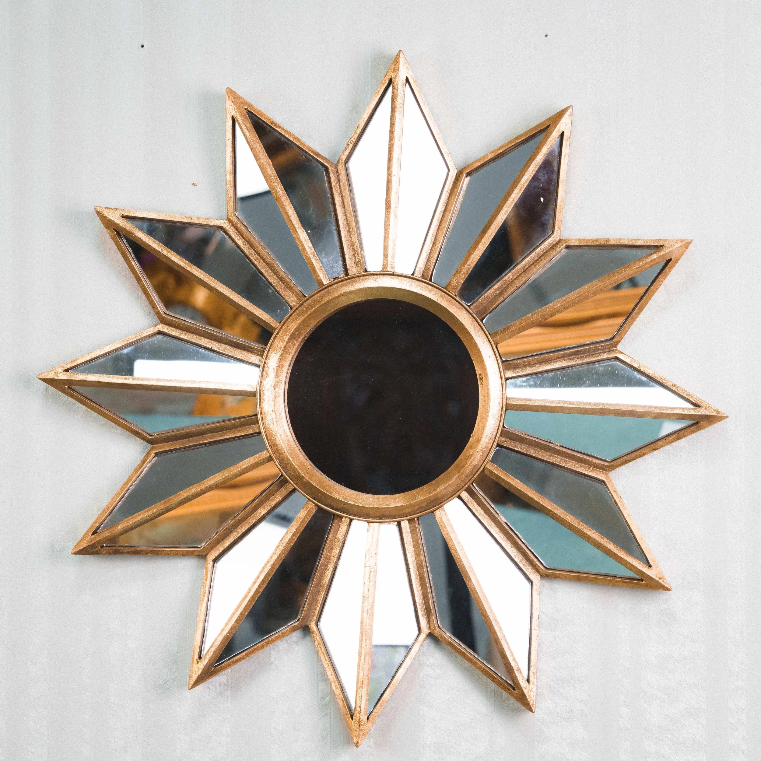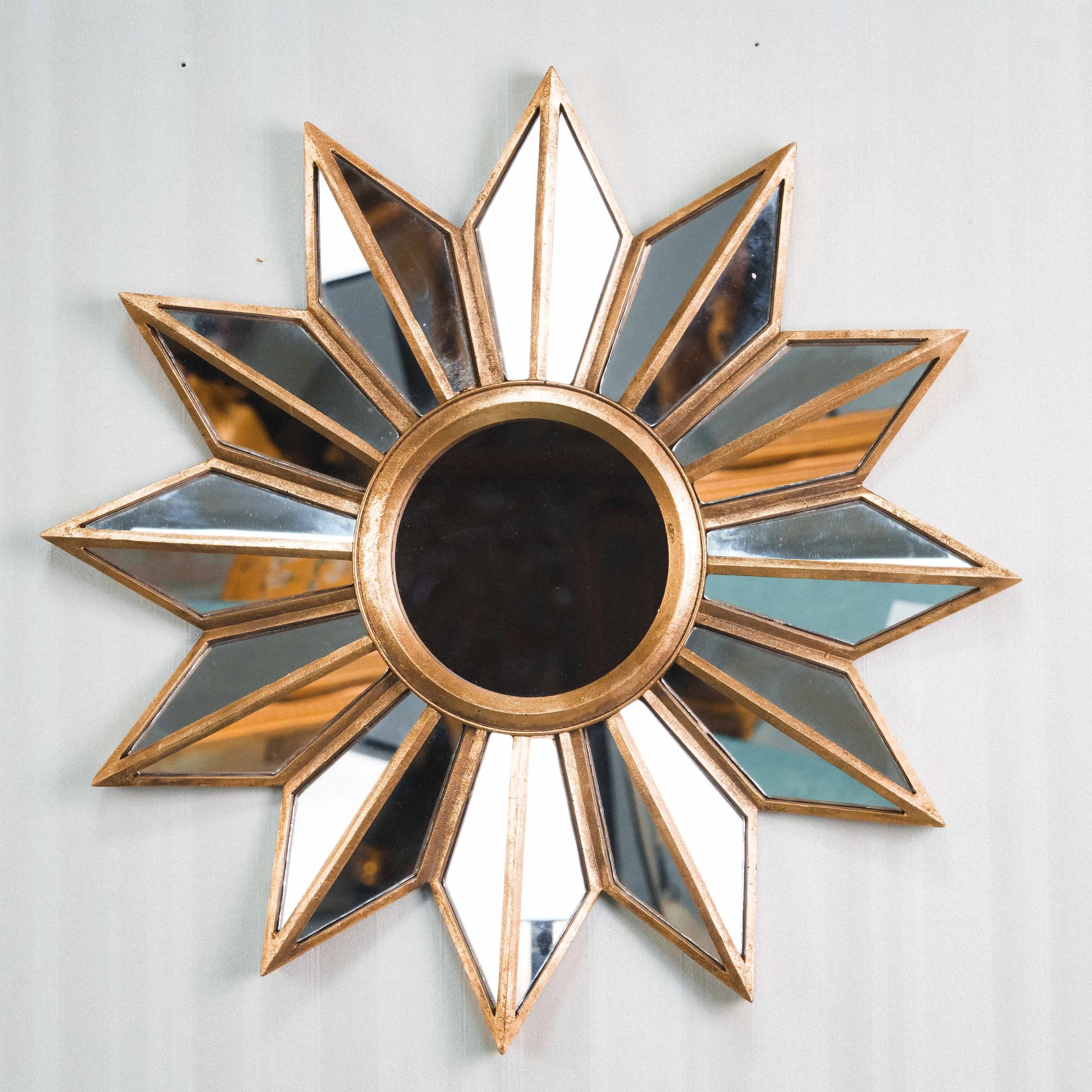 Элегантное настенное зеркало в форме сияющего солнца — стильный декоративный акцент, способный преобразить любое пространство. Центр композиции занимает круглое зеркало, окружённое лучами, выполненными из зеркальных граней разной формы. Каждая грань обрамлена тонкой рамкой тёплого золотистого оттенка, что создаёт игру света и подчеркивает выразительность формы.