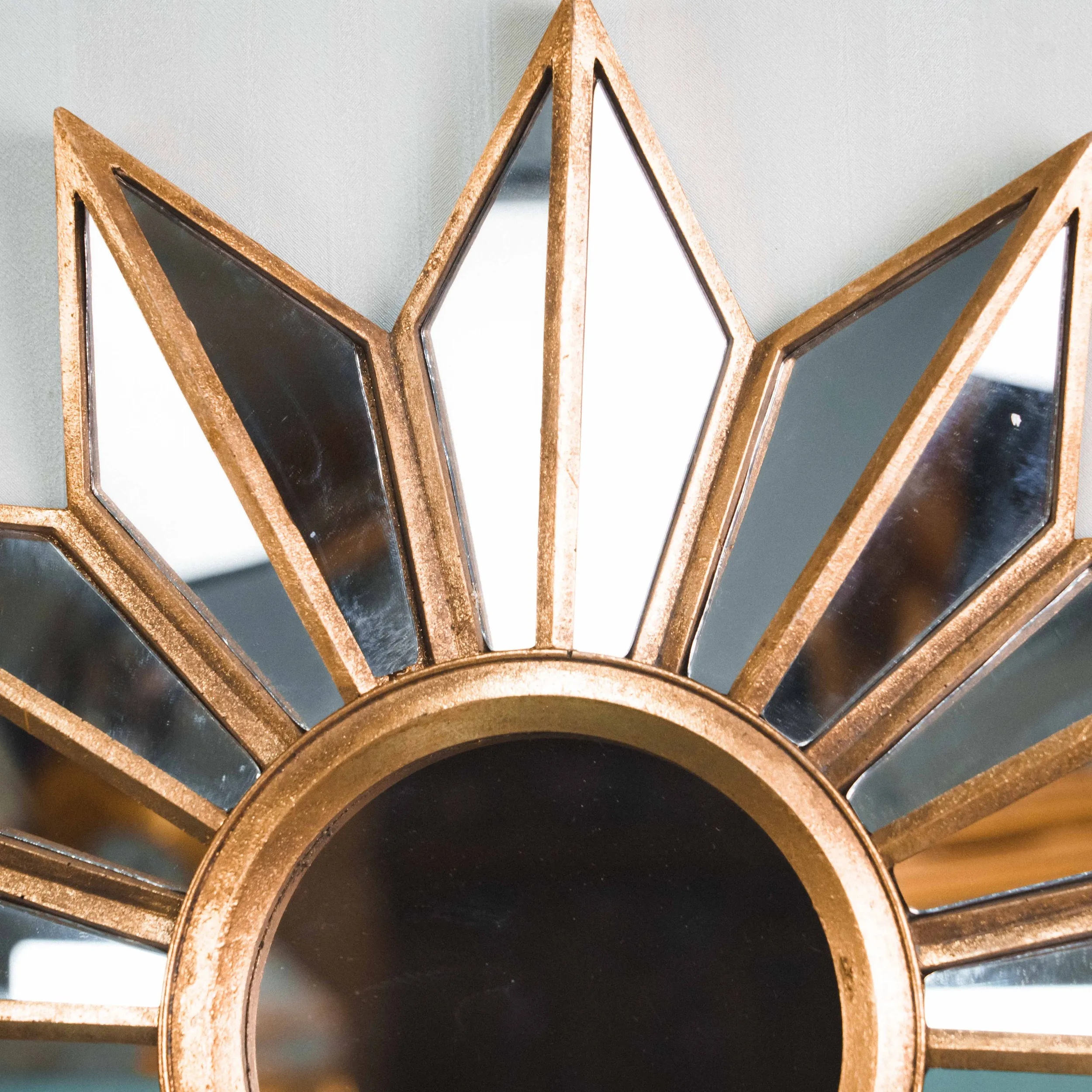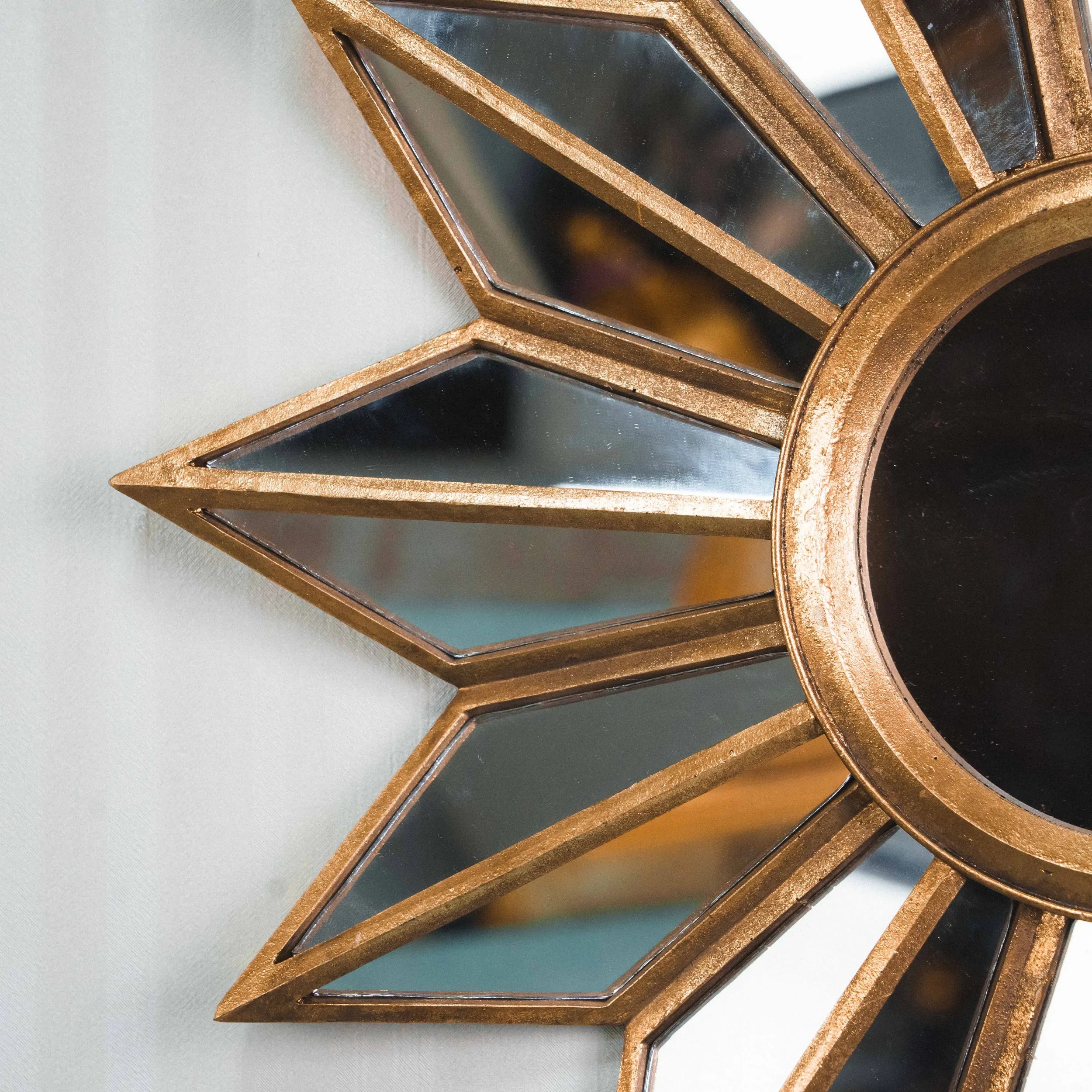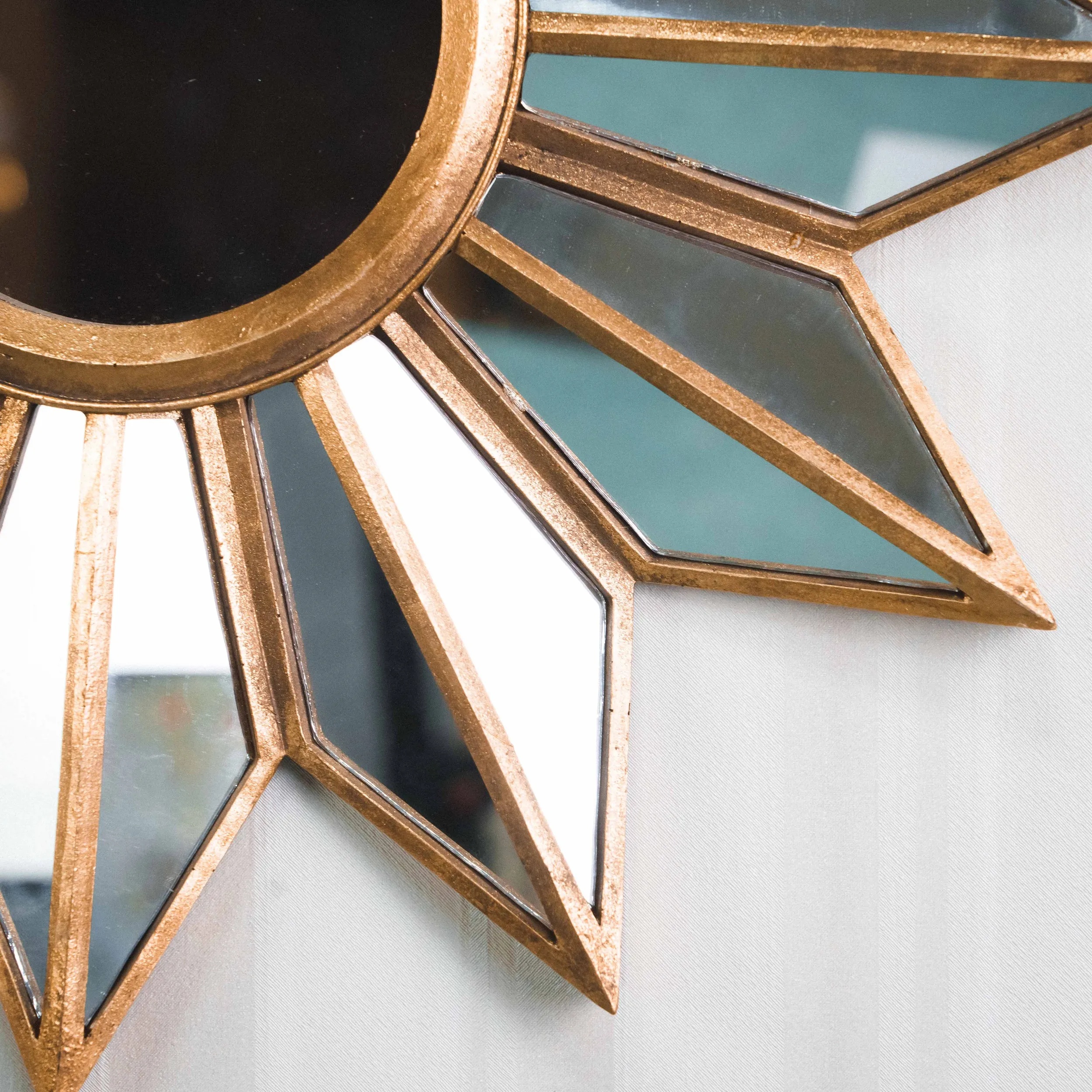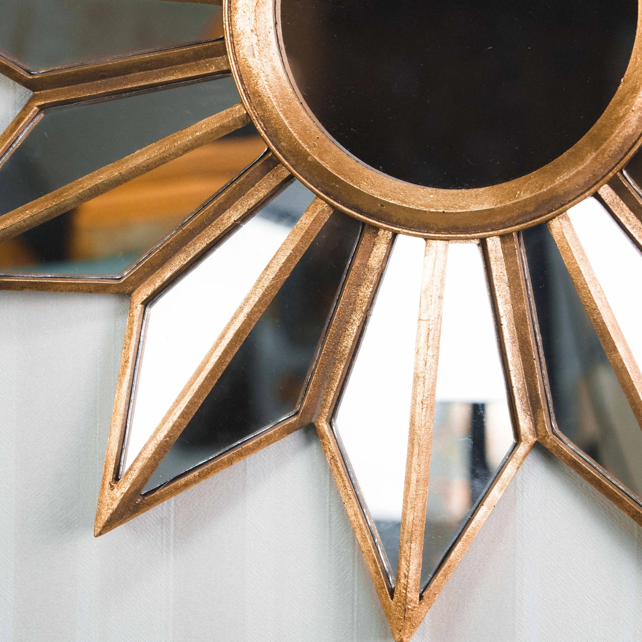 Элегантное настенное зеркало в форме сияющего солнца — стильный декоративный акцент, способный преобразить любое пространство. Центр композиции занимает круглое зеркало, окружённое лучами, выполненными из зеркальных граней разной формы. Каждая грань обрамлена тонкой рамкой тёплого золотистого оттенка, что создаёт игру света и подчеркивает выразительность формы.