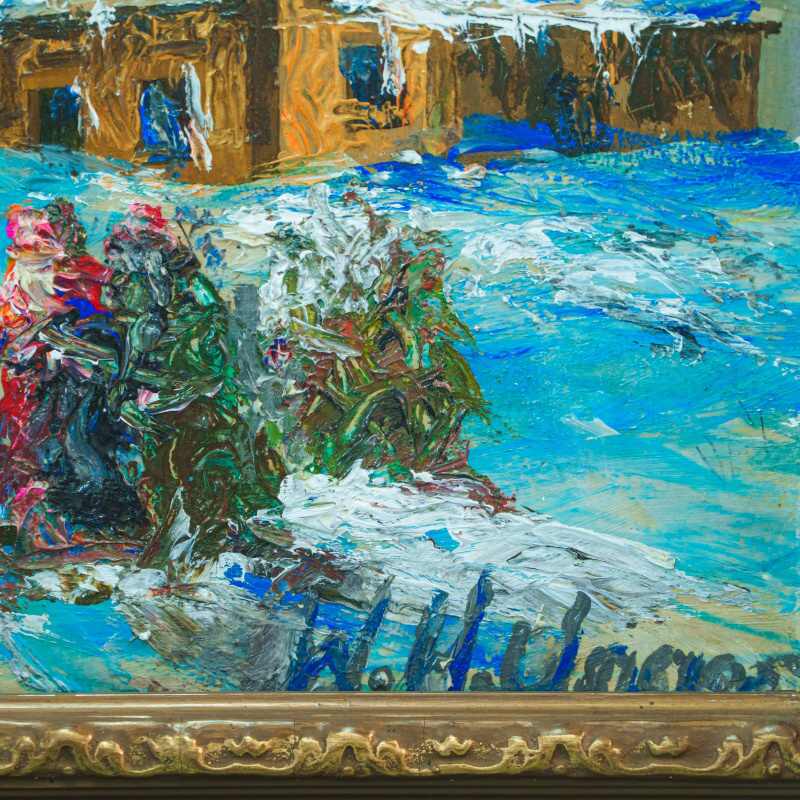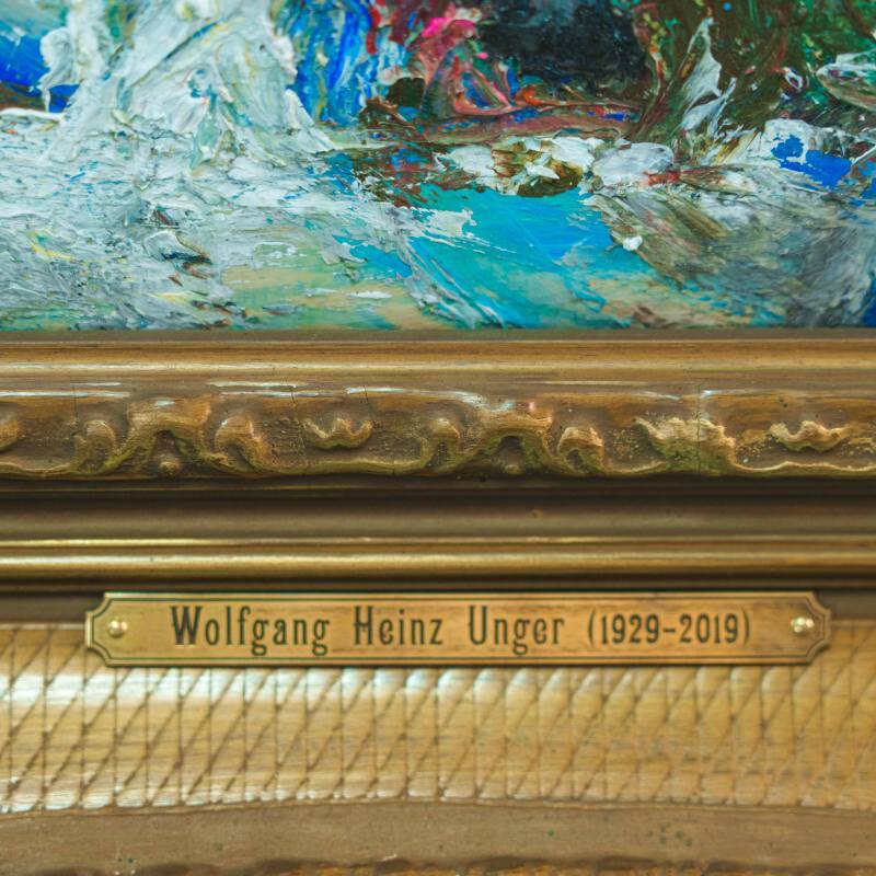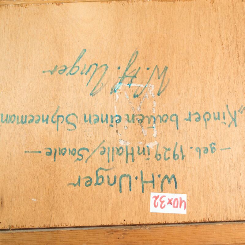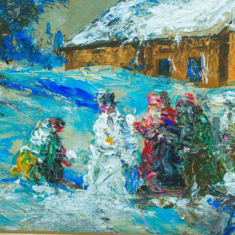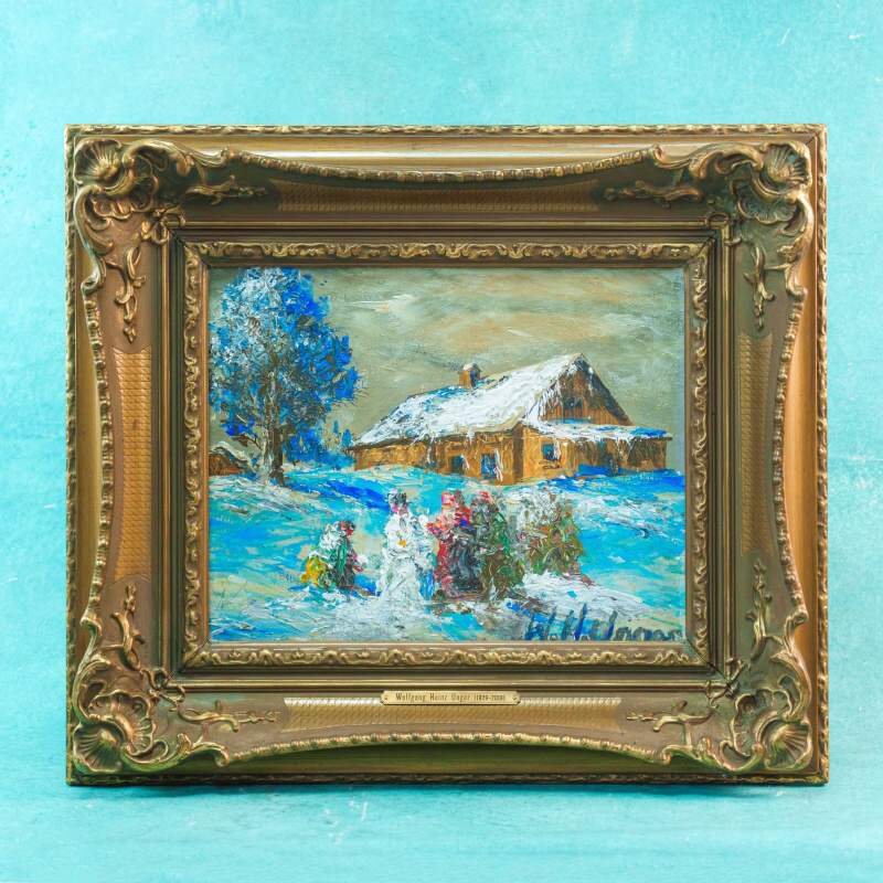 Представлено живописное произведение «Kinder bauen einen Schneemann» «Дети лепят снеговика» известного немецкого художника Wolfgang Heinz Unger. Авторская подпись, подтверждающая подлинность картины, находится в правом нижнем углу.