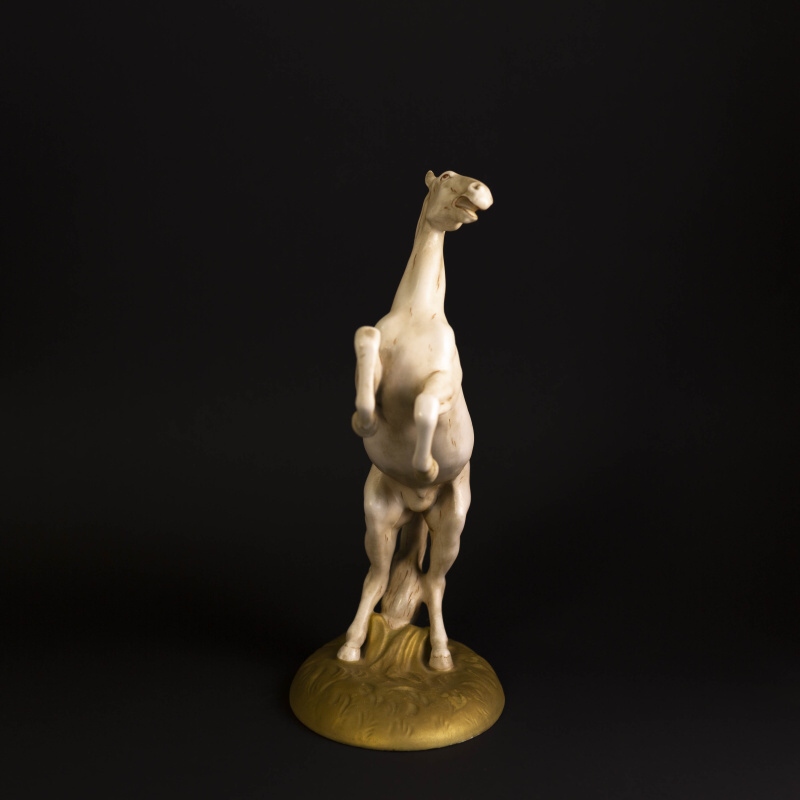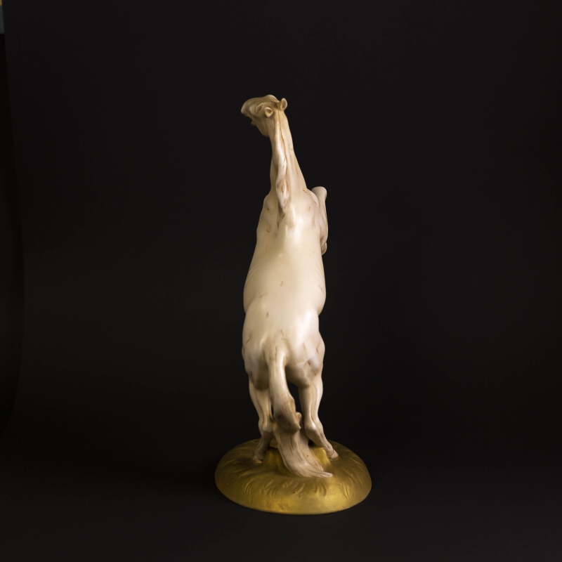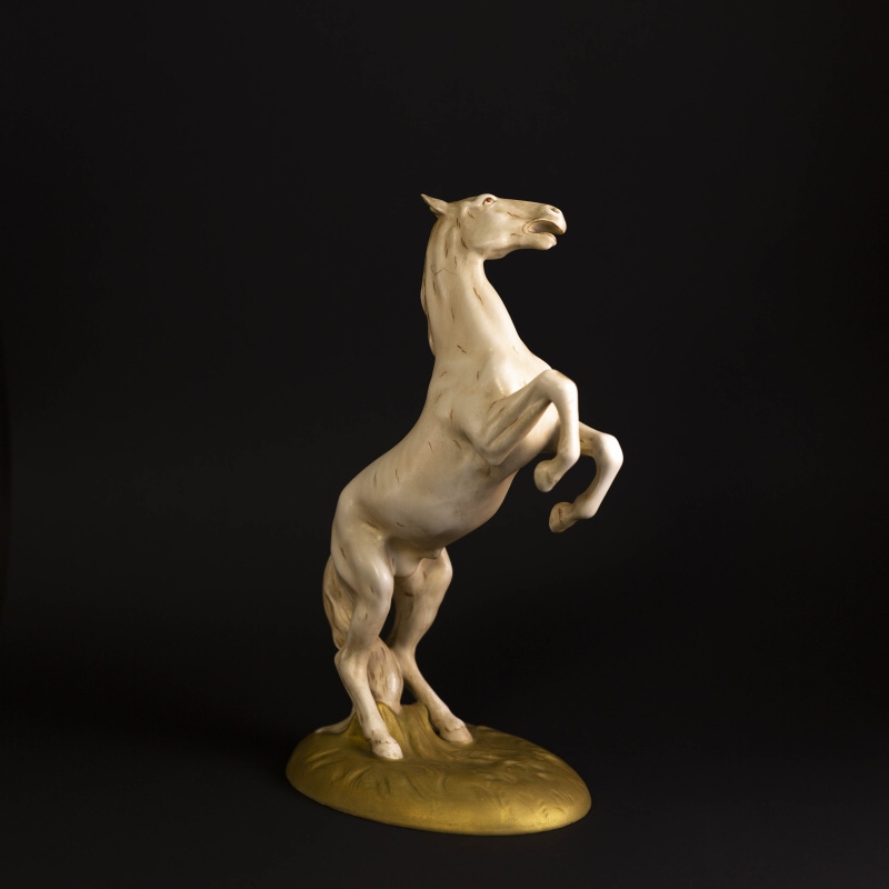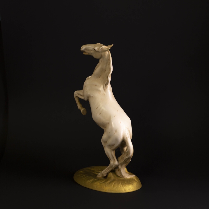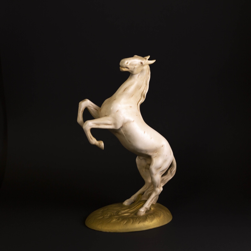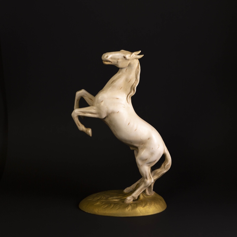 Прекрасная интерьерная композиция коня вставшего на дыбы. Конь — символический образ в искусстве: власть и совершенство, сила, стремительность, величественная красота, преданность. Эти благородные животные символизировали богатство и были важной составляющей не только жизни европейских, но и восточных народов. Многие люди черпали вдохновение во внешней красоте этих животных, но ощущали и нечто большее — стихию свободы, таящуюся под гривой. Фигура изготовлена на фарфоровой мануфактуре Royal Dux.