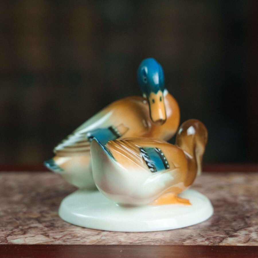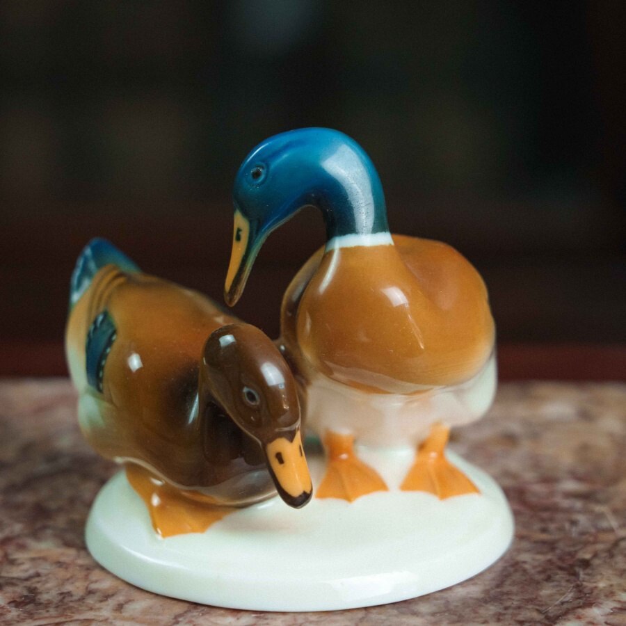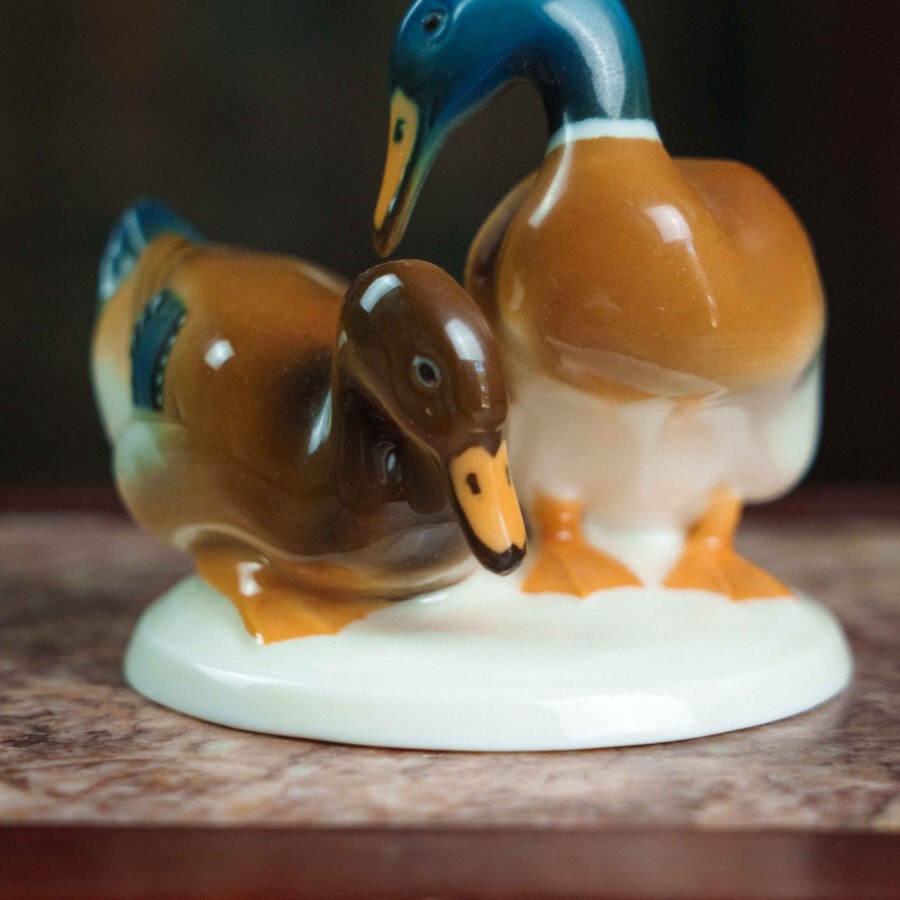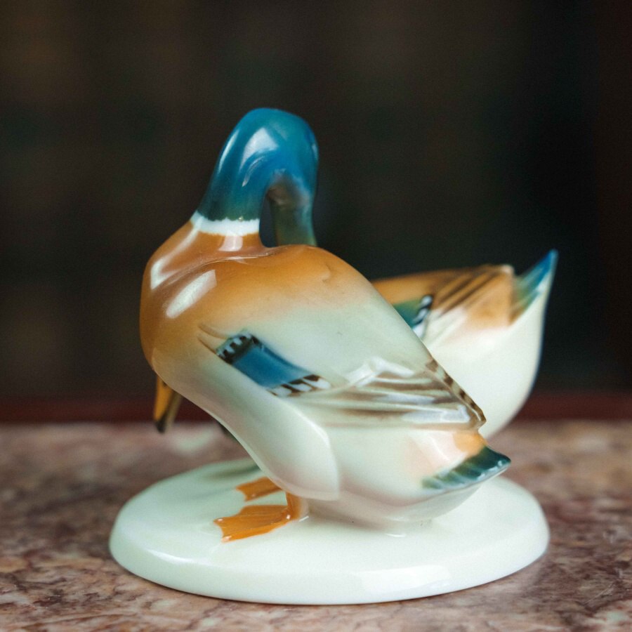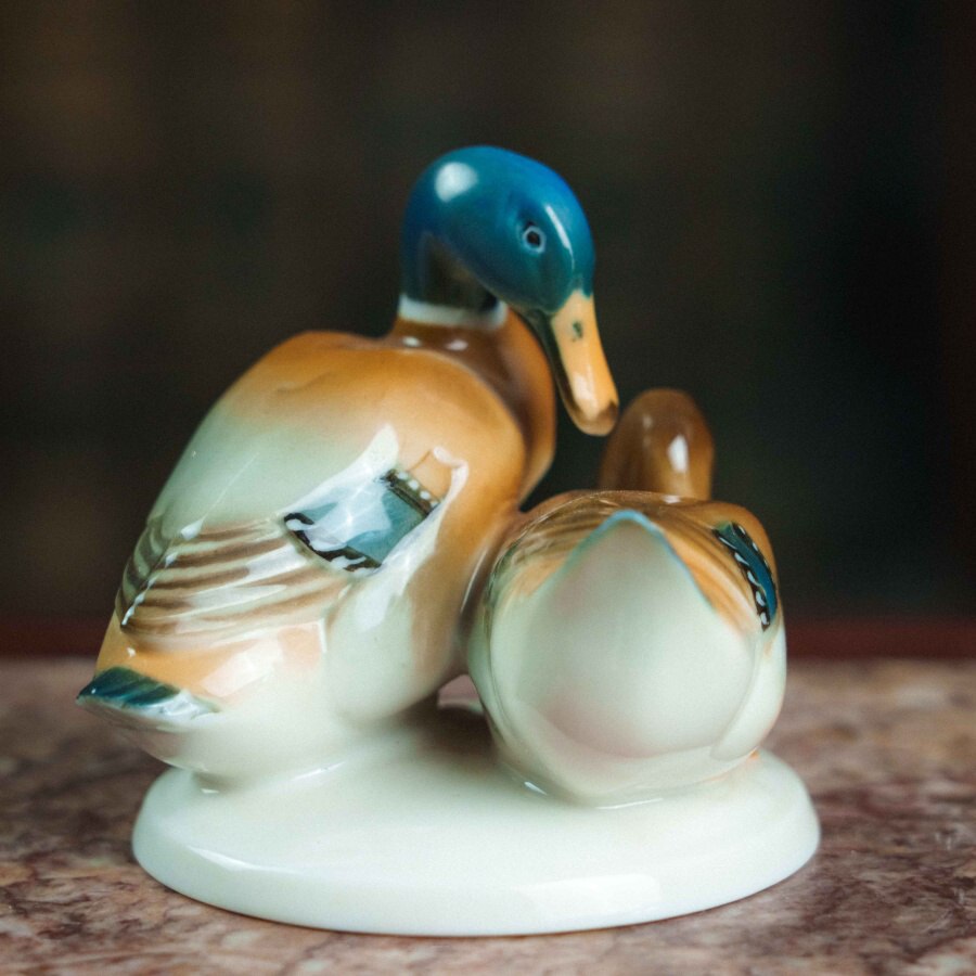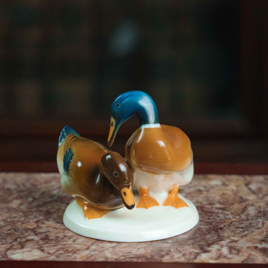 Фарфоровая фигурка «Уточки» работы немецкой мануфактуры Hutschenreuther выполнена в изящной и реалистичной манере, характерной для художественного отделения фабрики. На овальном основании представлена пара утки и селезня: самец с насыщенной синевато-зелёной головой и тёплой охристо-белой грудью, и самка с более спокойной коричневой окраской, оттеняющей его яркость. Тонкие переходы глазури создают мягкий живописный эффект, а детализированные перья с синими акцентами, выразительные глаза и изящные перепончатые лапки подчёркивают натуралистичность композиции.