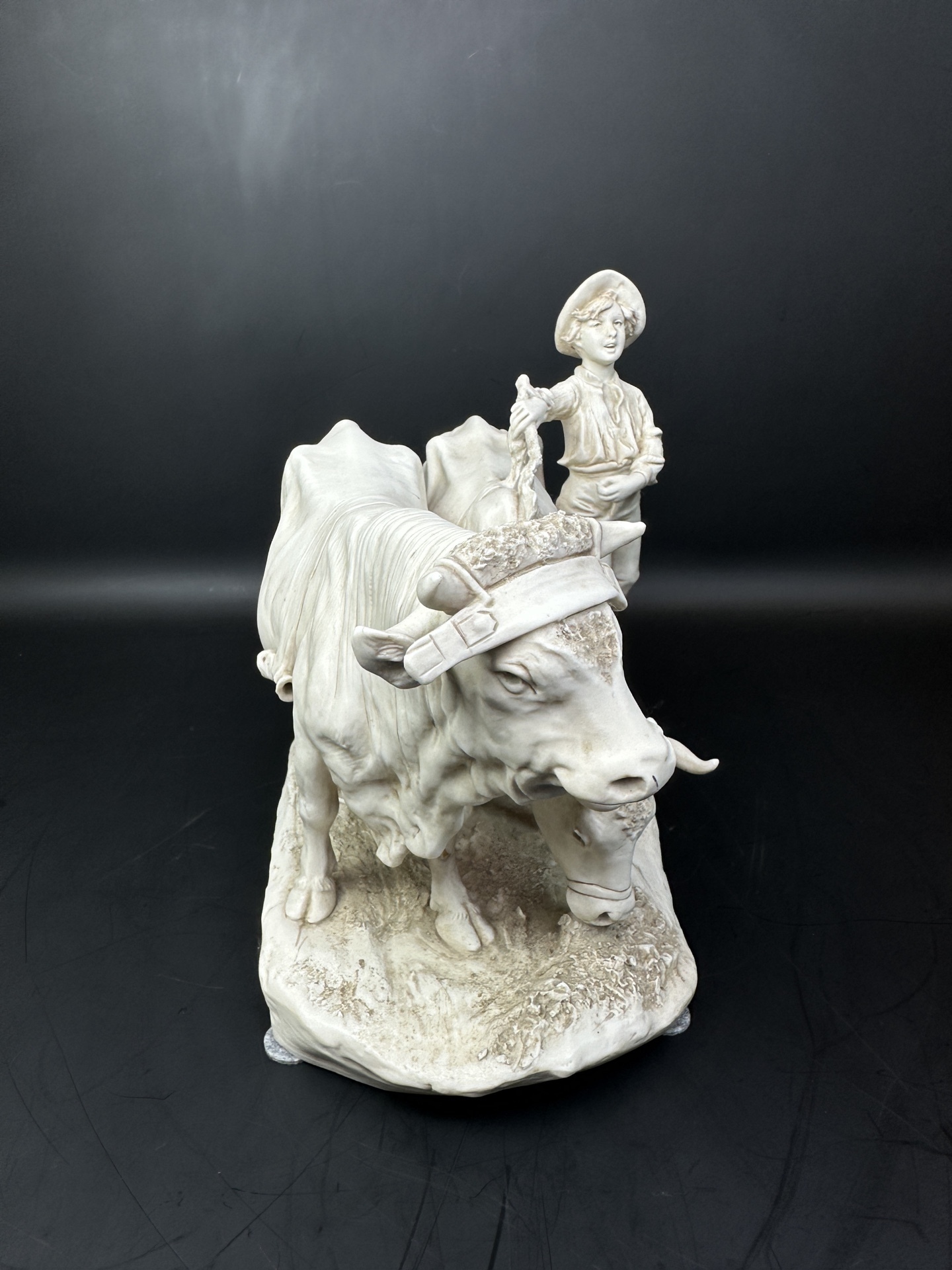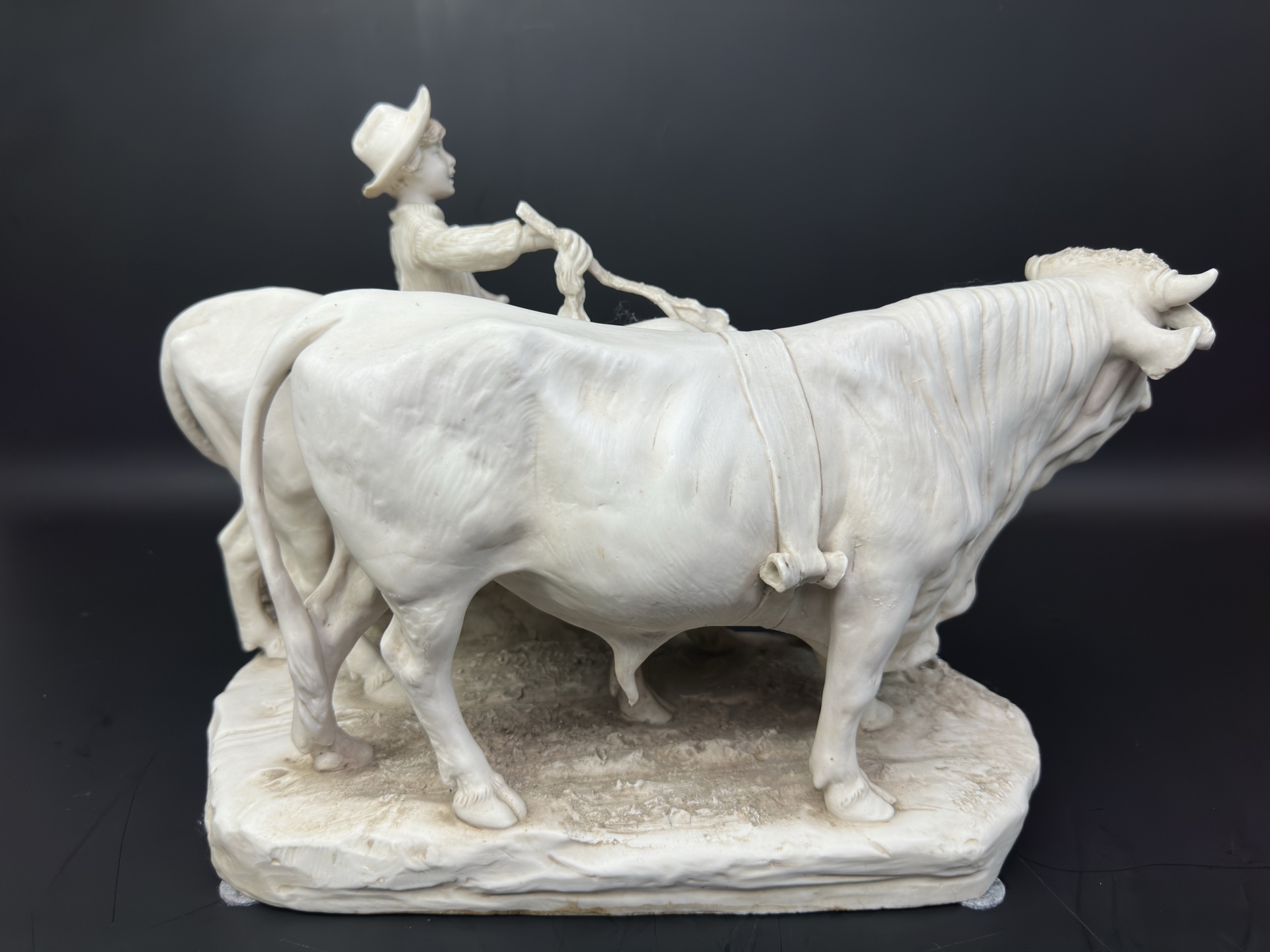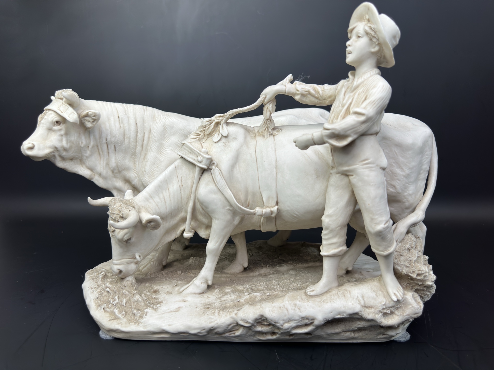 Это произведение искусства, выполненное из бисквитного фарфора, изображает трогательную сцену деревенской жизни: юный пастух в шляпе направляет двух коров.