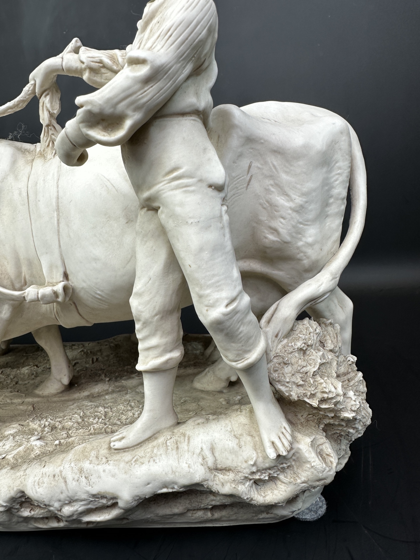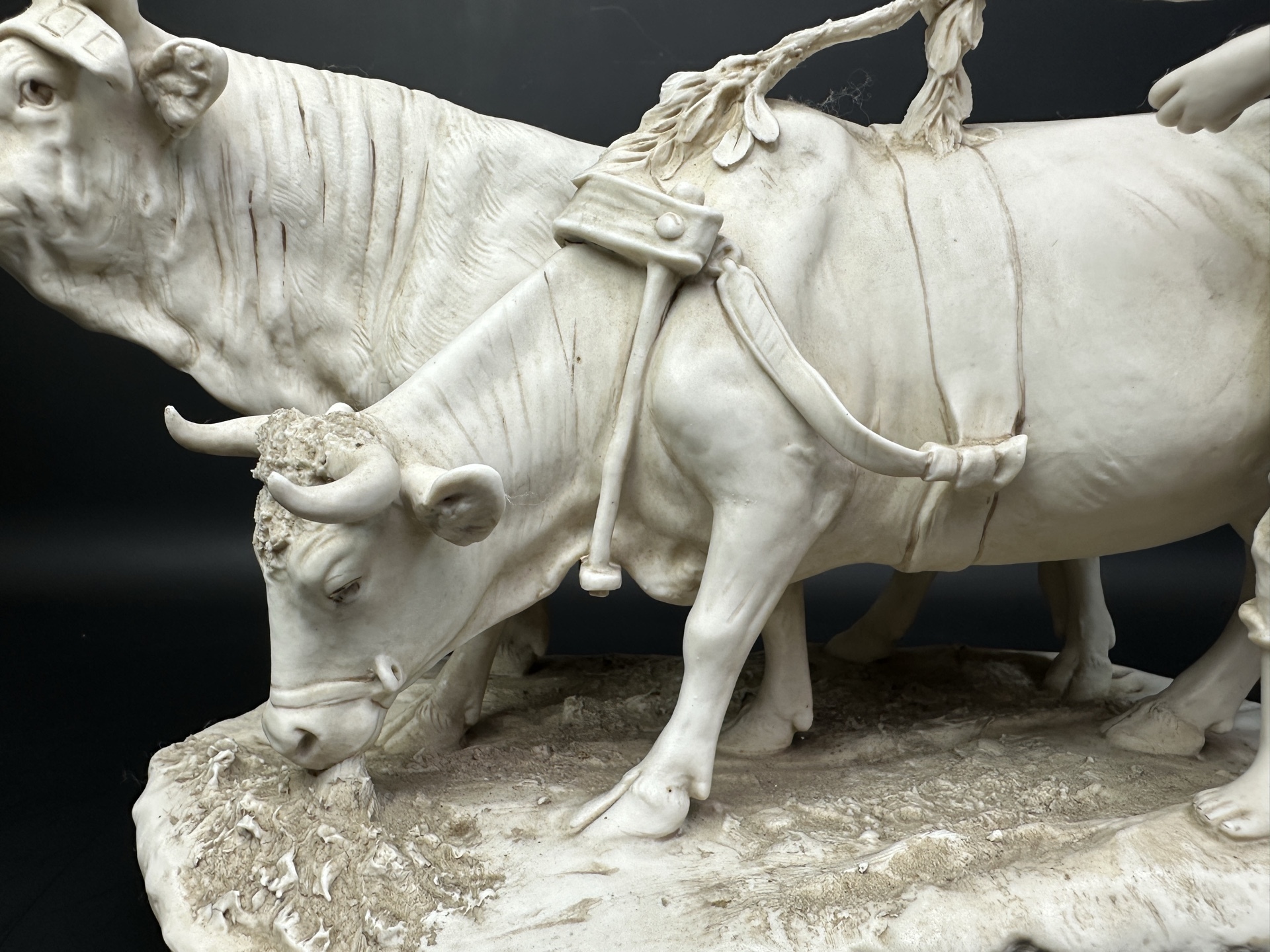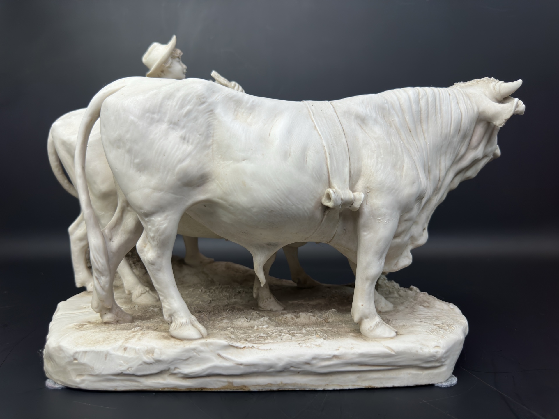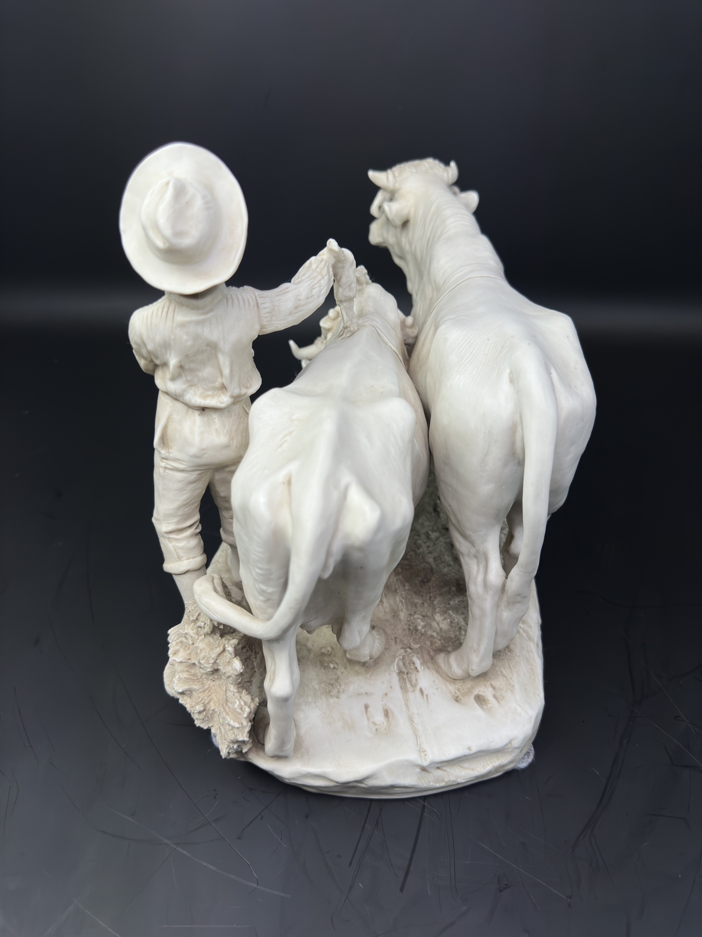 Это произведение искусства, выполненное из бисквитного фарфора, изображает трогательную сцену деревенской жизни: юный пастух в шляпе направляет двух коров.