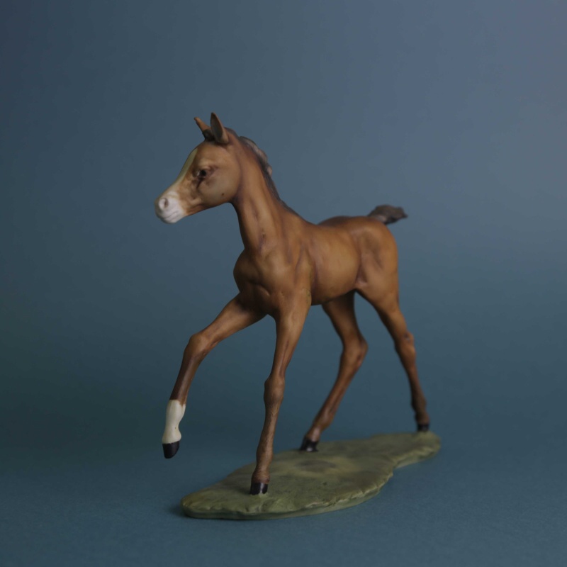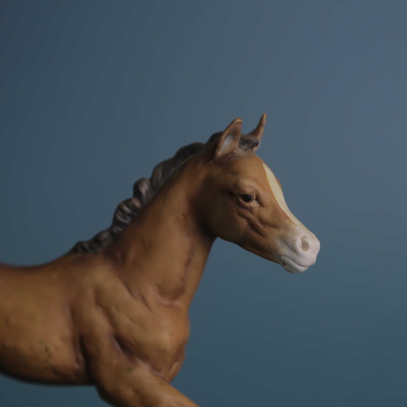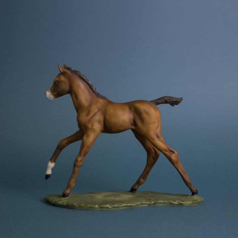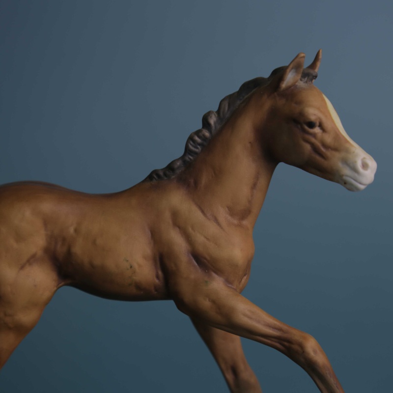 Прекрасная интерьерная композиция жеребенка, скачущего по лугу. Лошадь — символический образ в искусстве: власть и совершенство. Сила, стремительность, величественная красота, преданность. Эти благородные животные символизировали богатство и были важной составляющей не только жизни европейских, но и восточных народов. Многие люди черпали вдохновение во внешней красоте этих животных, но ощущали и нечто большее — стихию свободы, таящуюся под гривой. Фигура изготовлена на фарфоровой мануфактуре Al-Ka Kunst Kaiser во II половине XX века. Автором данной фигуры является Wolfgang Gawantka.