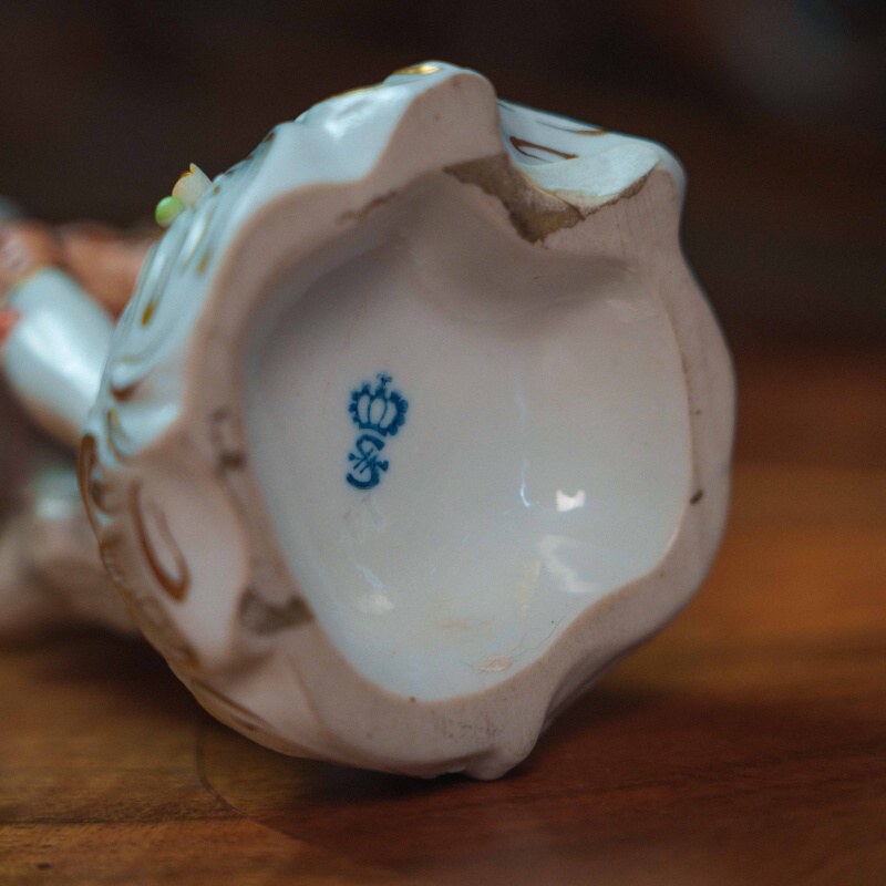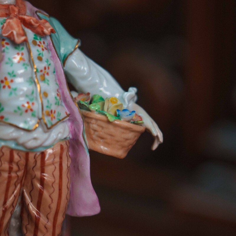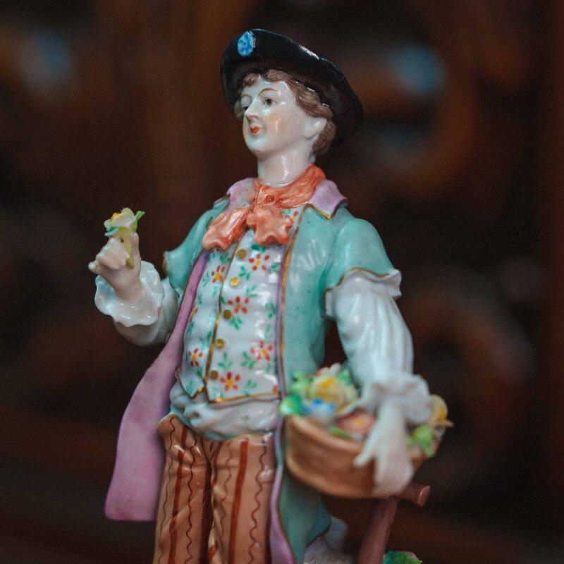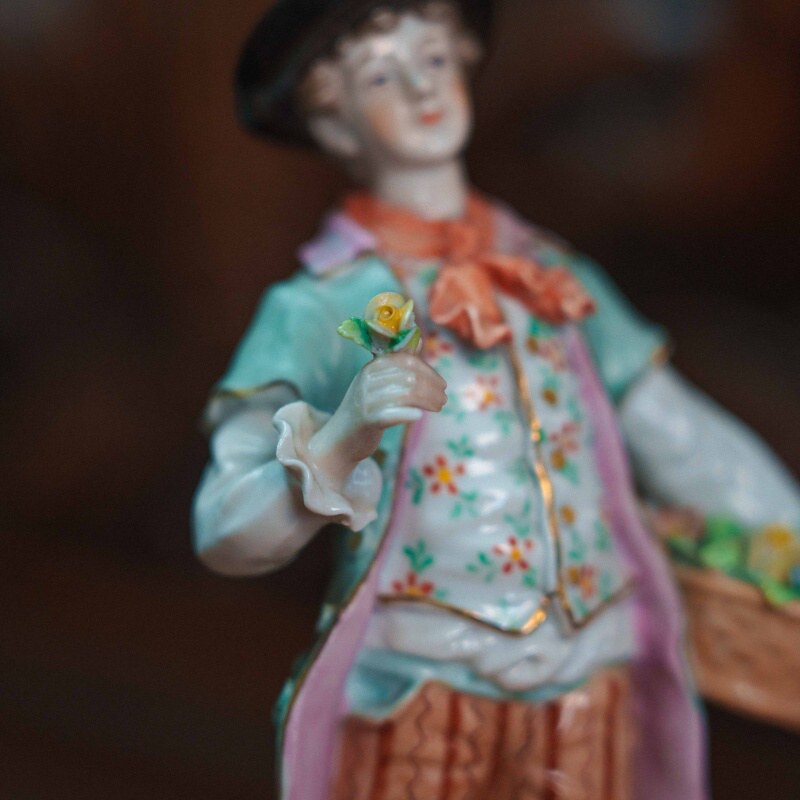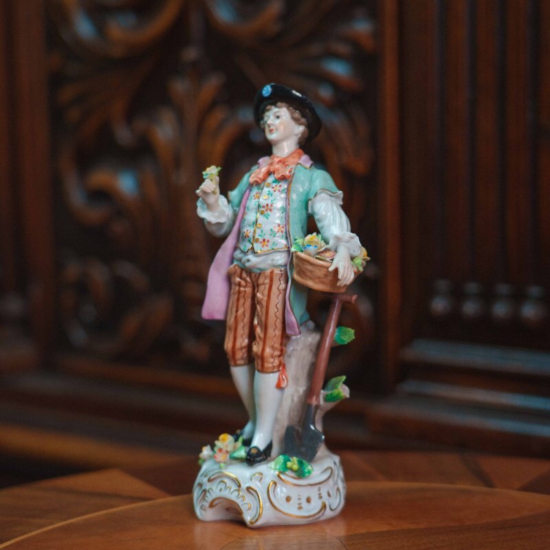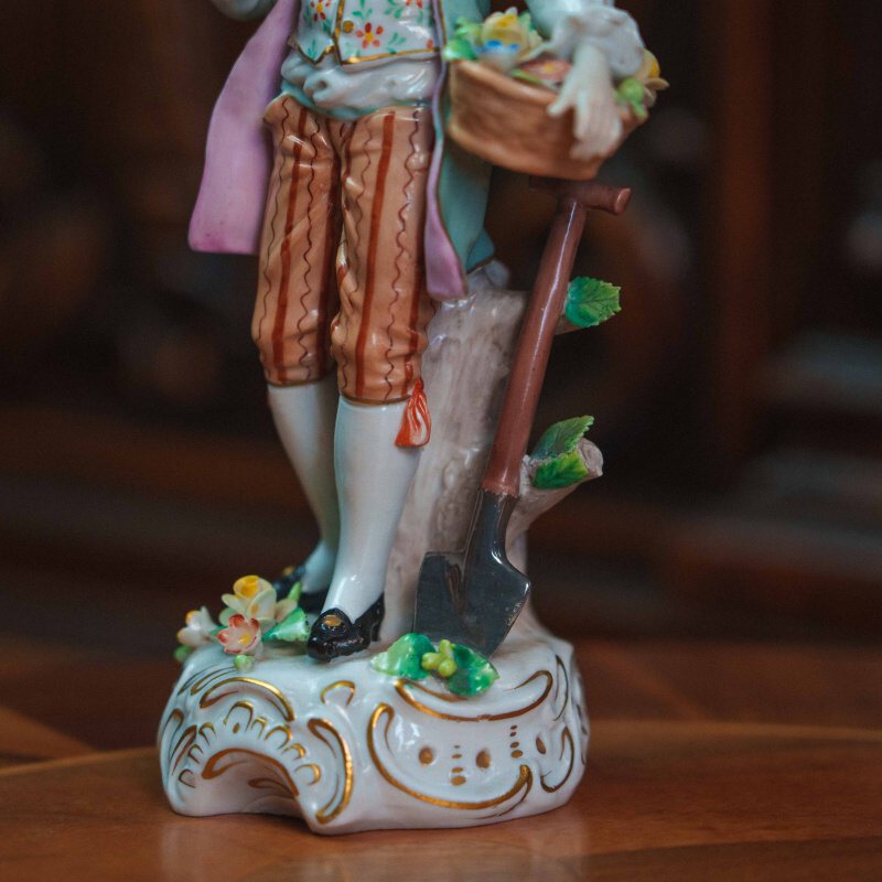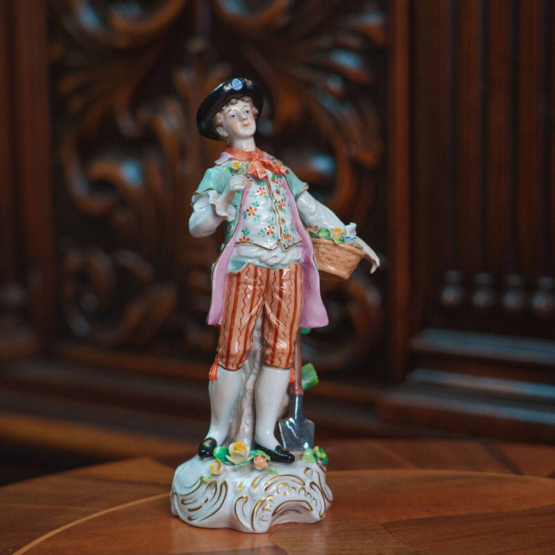 Изящная фарфоровая статуэтка, изображающая молодого кавалера с корзиной в парадном костюме. Юноша изображен с корзиной цветов в одной руке и цветком — в другой, рядом расположена лопата. Особое внимание уделено росписи: костюм украшен мелким цветочным орнаментом, сочетание пастельных оттенков (мятного, розового, кремового) создает легкое, декоративное звучание. Присутствуют деликатные золоченые акценты, подчеркивающие линии одежды и основание. Основание выполнено с рокайльным орнаментом и дополнено лепными цветами. На донышке присутствует клеймо мануфактуры Sitzendorf.