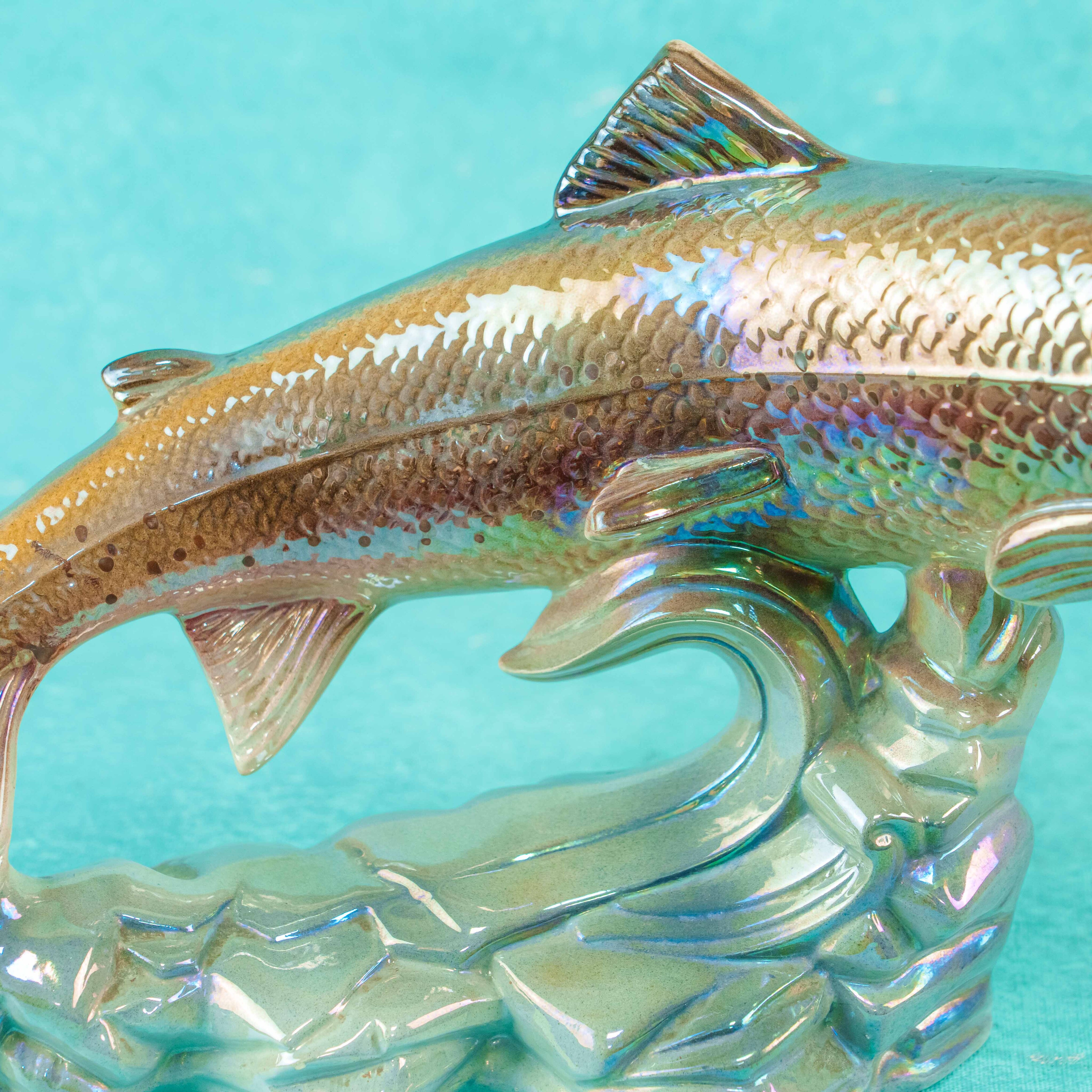 Декоративная фарфоровая статуэтка изображает радужную форель в динамичной позе, словно выпрыгивающую из воды. Образ решён с высокой степенью натуралистичности: тщательно проработаны форма тела, чешуя, плавники и характерный изгиб рыбы в движении.