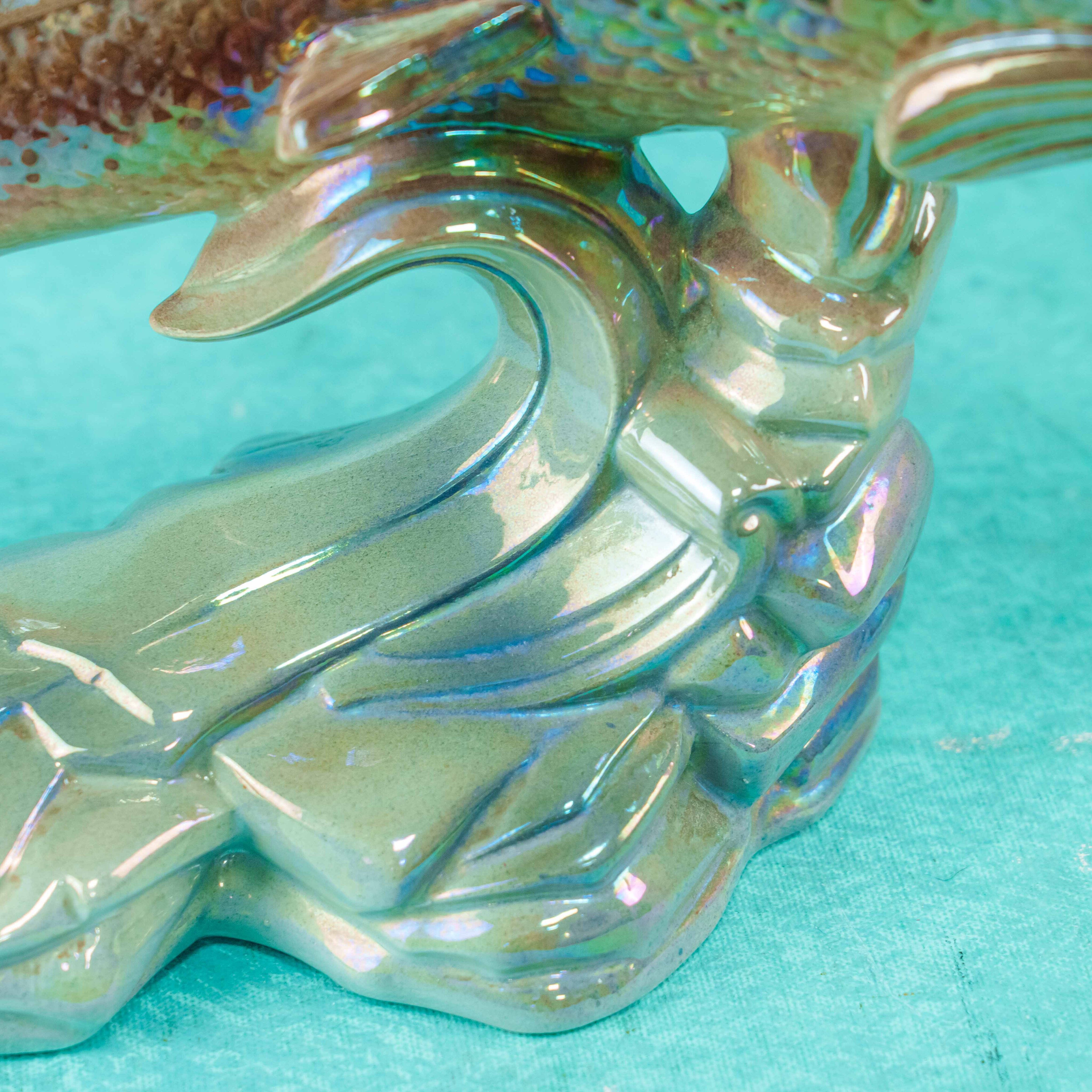 Поверхность покрыта эффектной люстровой глазурью с перламутровыми переливами, создающими игру оттенков — от золотисто-коричневых до голубых и розовато-фиолетовых. Этот приём подчёркивает живость образа и усиливает декоративное восприятие скульптуры.