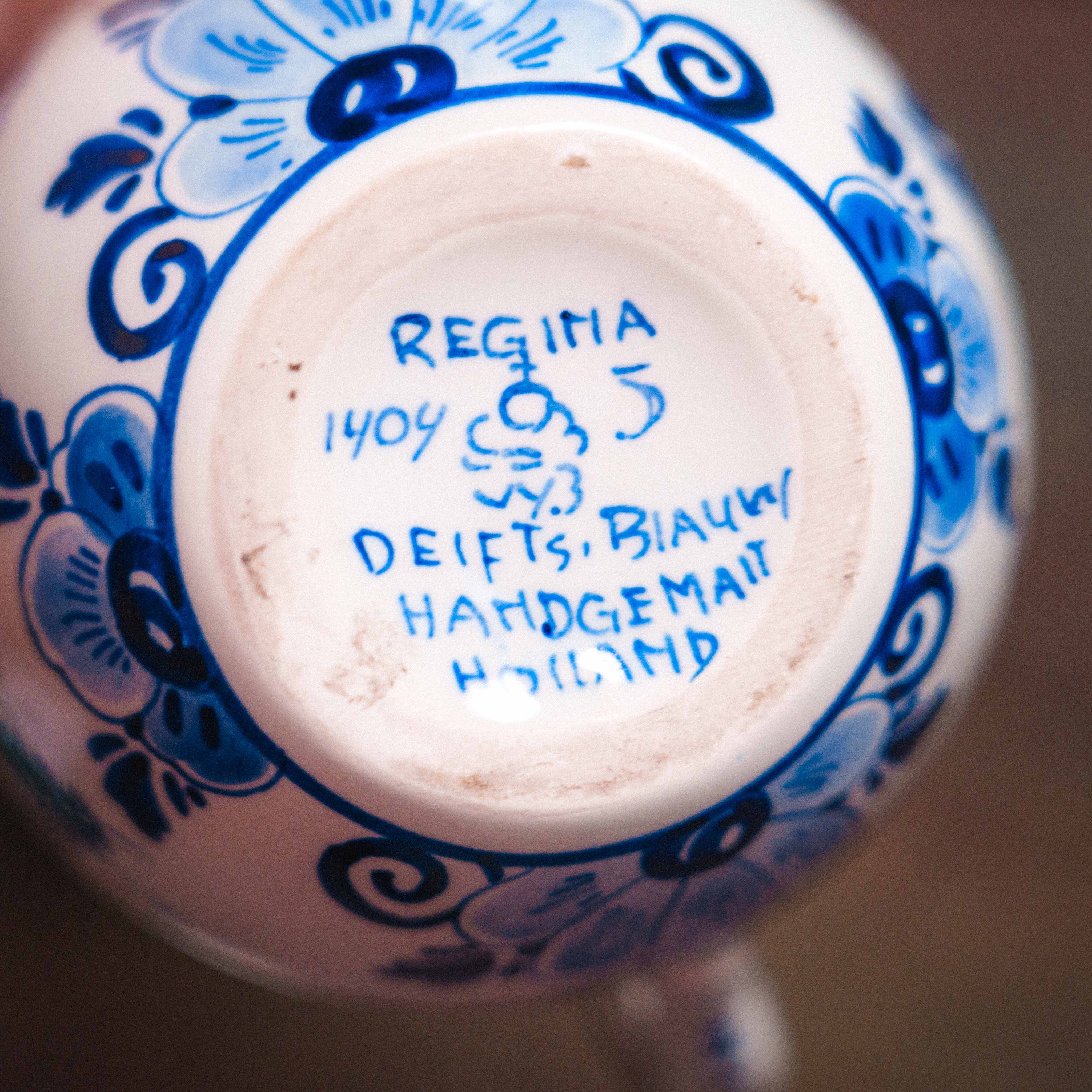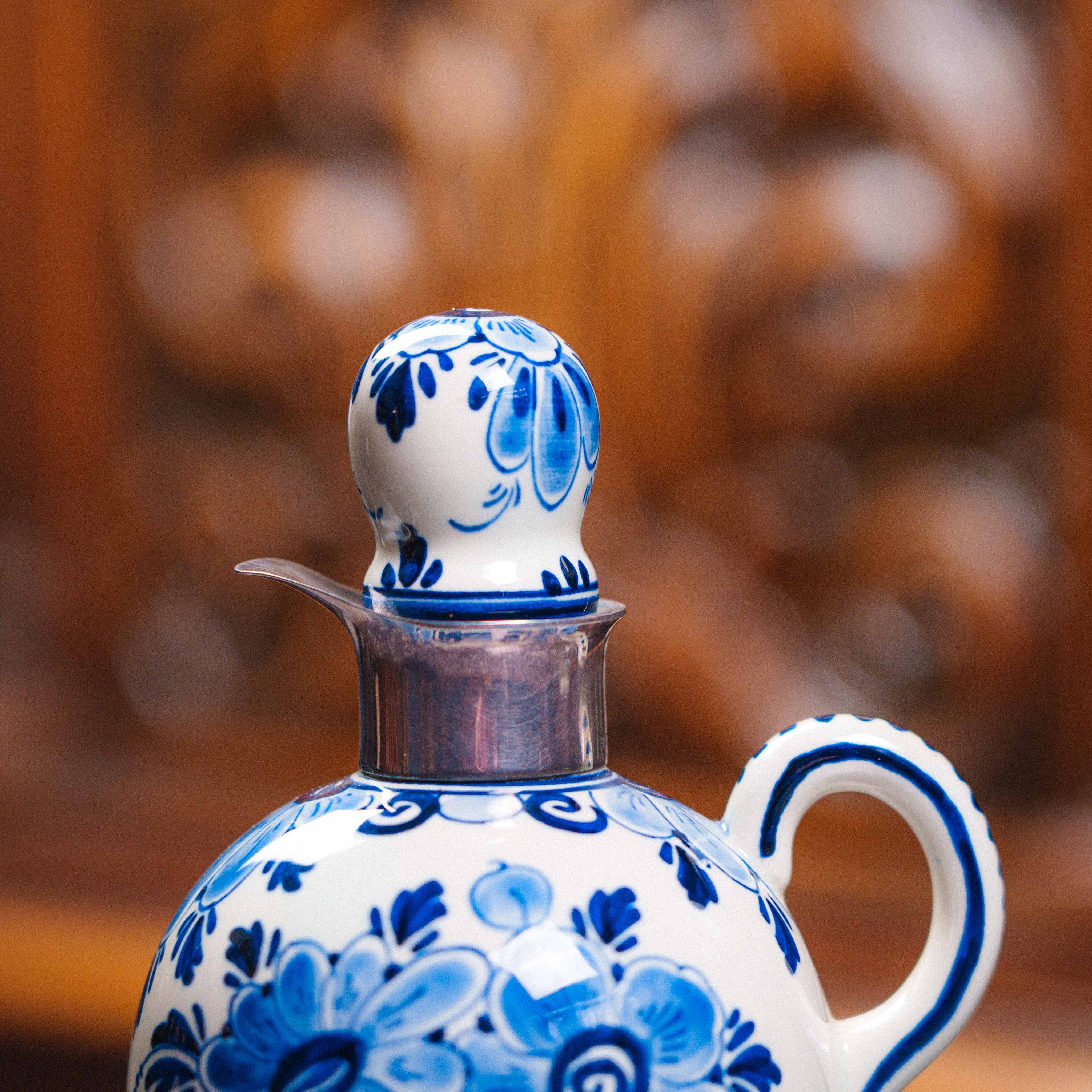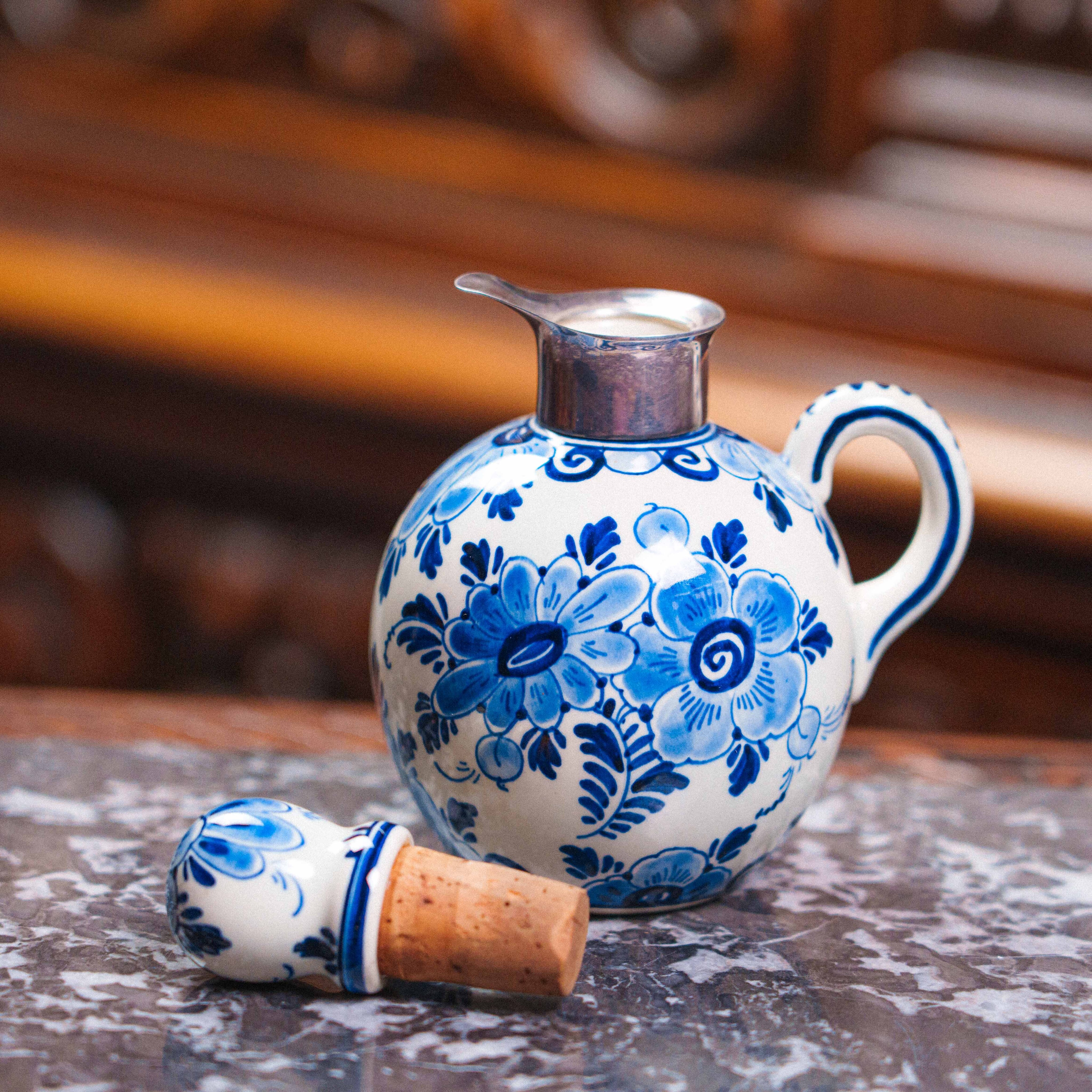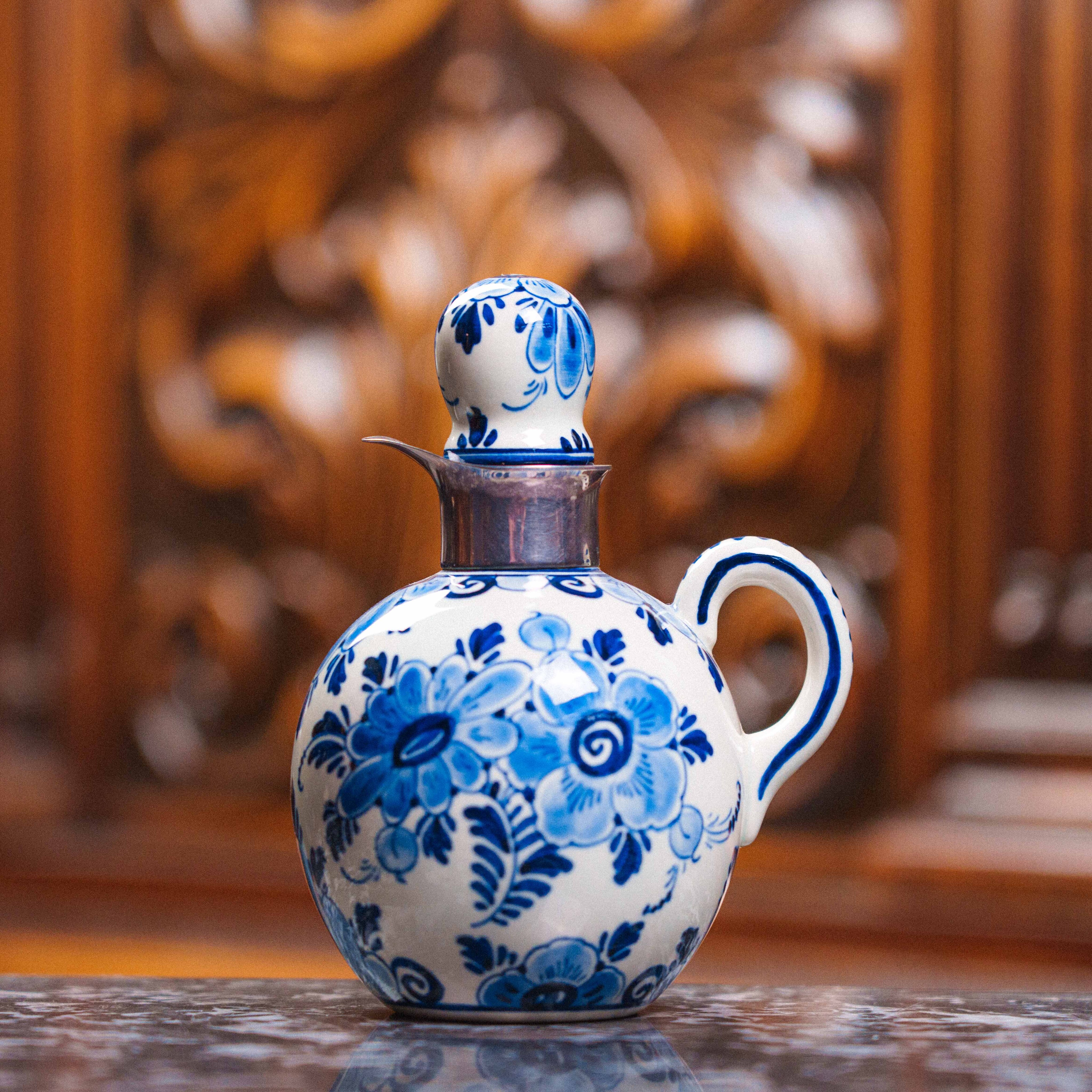Фарфоровый кувшинчик с кобальтовой росписью, выполненный в традициях голландской керамики Делфта. Круглое тулово украшено ручной росписью цветочного орнамента в характерной сине-белой гамме, создающей ощущение лёгкости и декоративной гармонии. Каждое движение кисти подчёркивает ремесленный характер изделия и его индивидуальность. Горловина оформлена ободком из серебра 835 пробы, который не только усиливает декоративную выразительность предмета, но и подчёркивает его статус и качество исполнения. Изящная форма ручки и пропорциональный силуэт делают кувшинчик особенно привлекательным для витринного или интерьерного размещения.