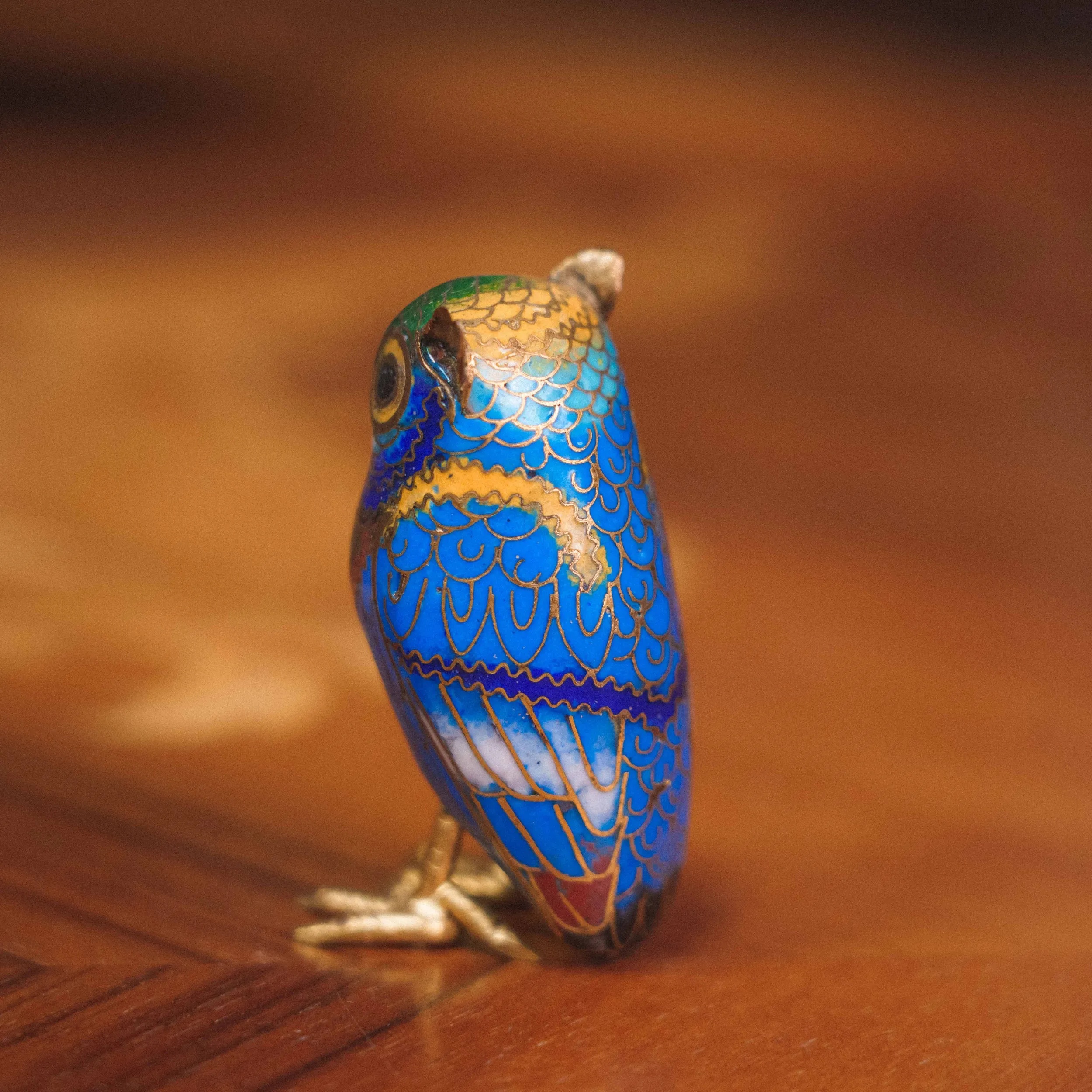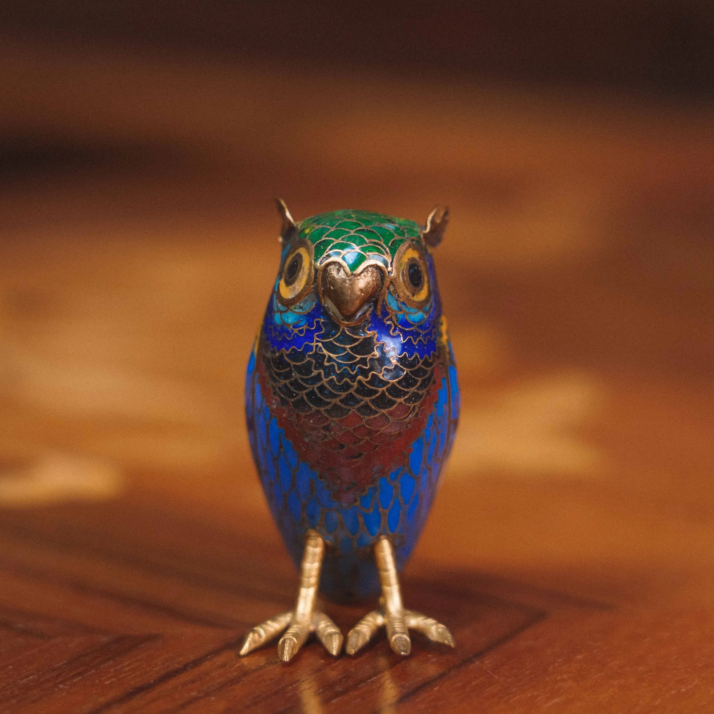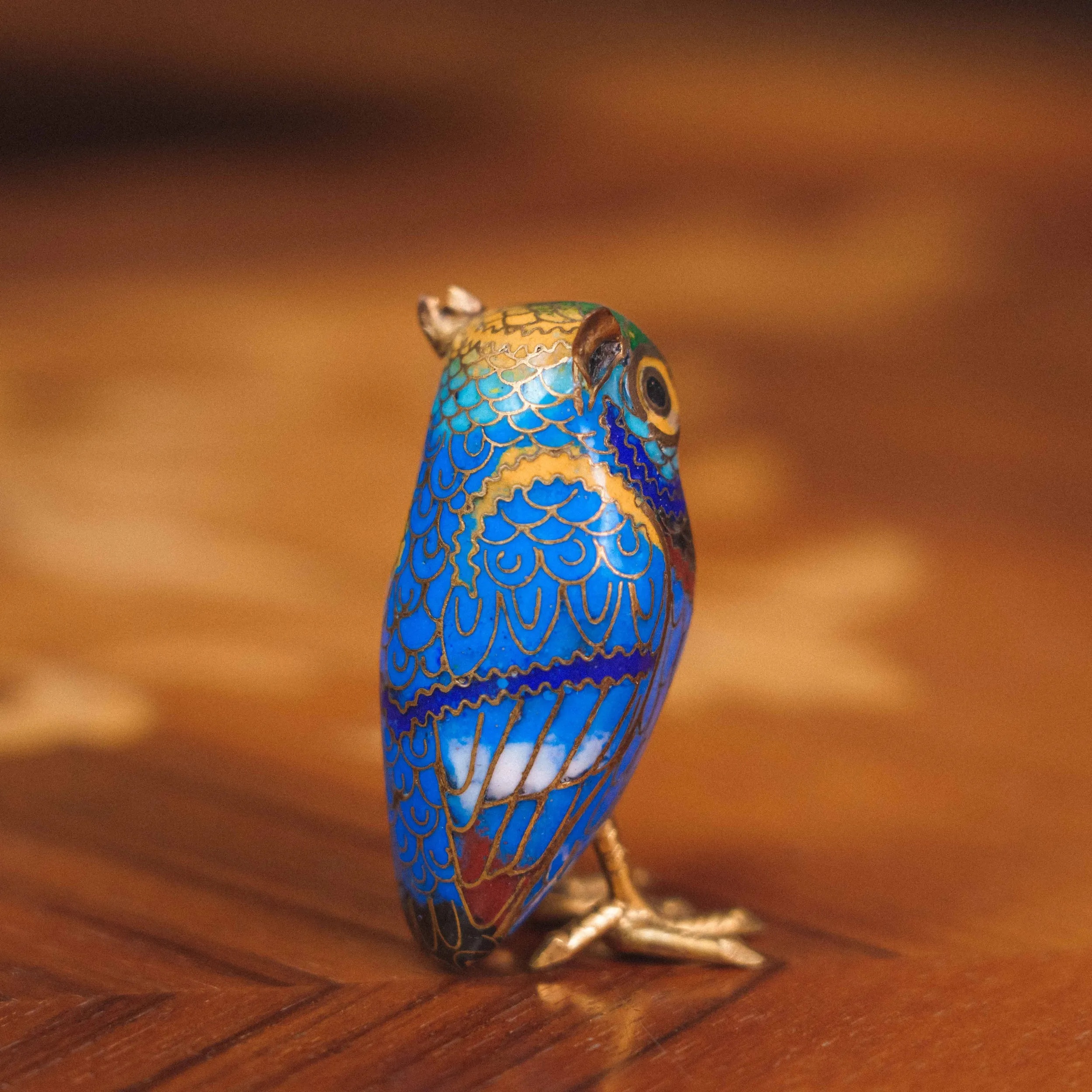 Изделие изготовлено из бронзы и украшено яркой перегородчатой эмалью в насыщенных синих, бирюзовых и красных оттенках. Тонкая ручная работа и ювелирная детализация придают фигурке выразительность и характер — совёнок выглядит живым и харизматичным.