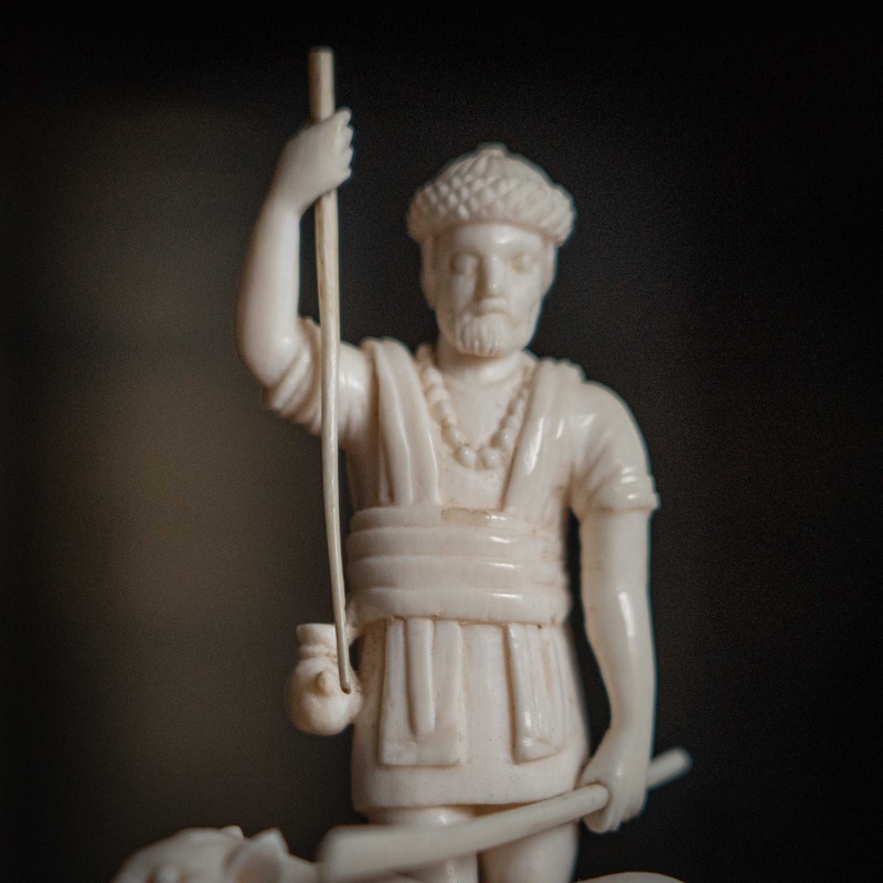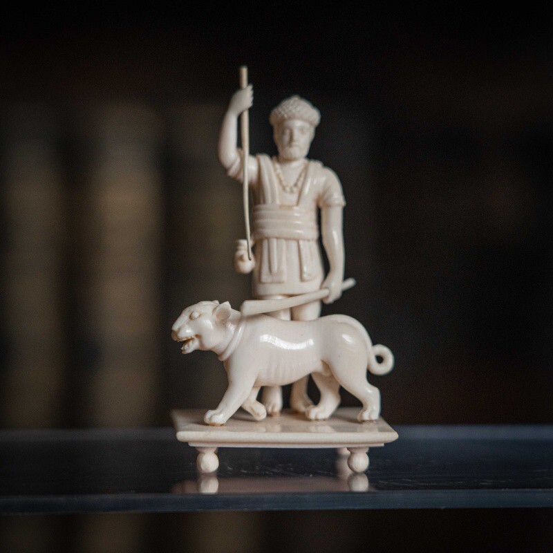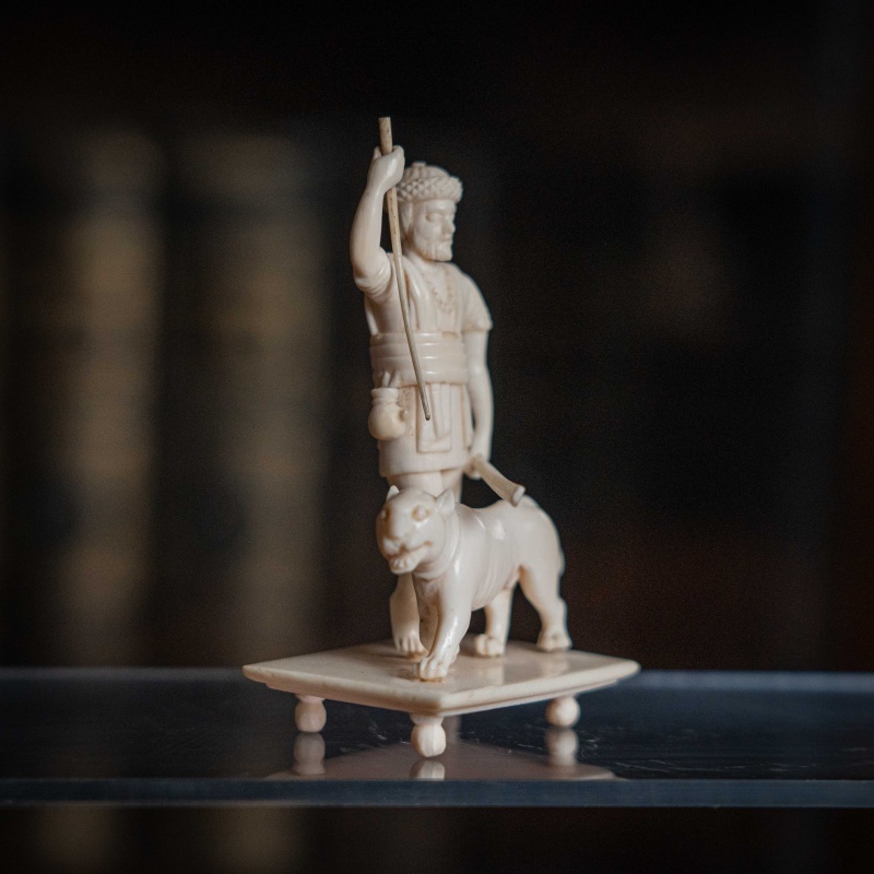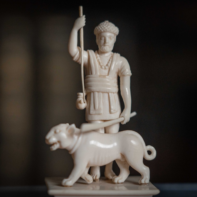 Французская резьба по кости, выполненная мастерами из города Дьеп (Dieppe) в XIX веке. Фигура с тигром с палкой и копьем в руке символизирует власть над дикой природой или триумф. Прямоугольное основание на четырех ножках-шариках — визитная карточка дьепских мастеров. Они специализировались на подобных кабинетных миниатюрах. Школа Дьепа: С XVII века французский Дьеп был главным центром резьбы по слоновой кости в Европе. Мастера создавали невероятно детализированные статуэтки королей, святых и жанровые сцены.