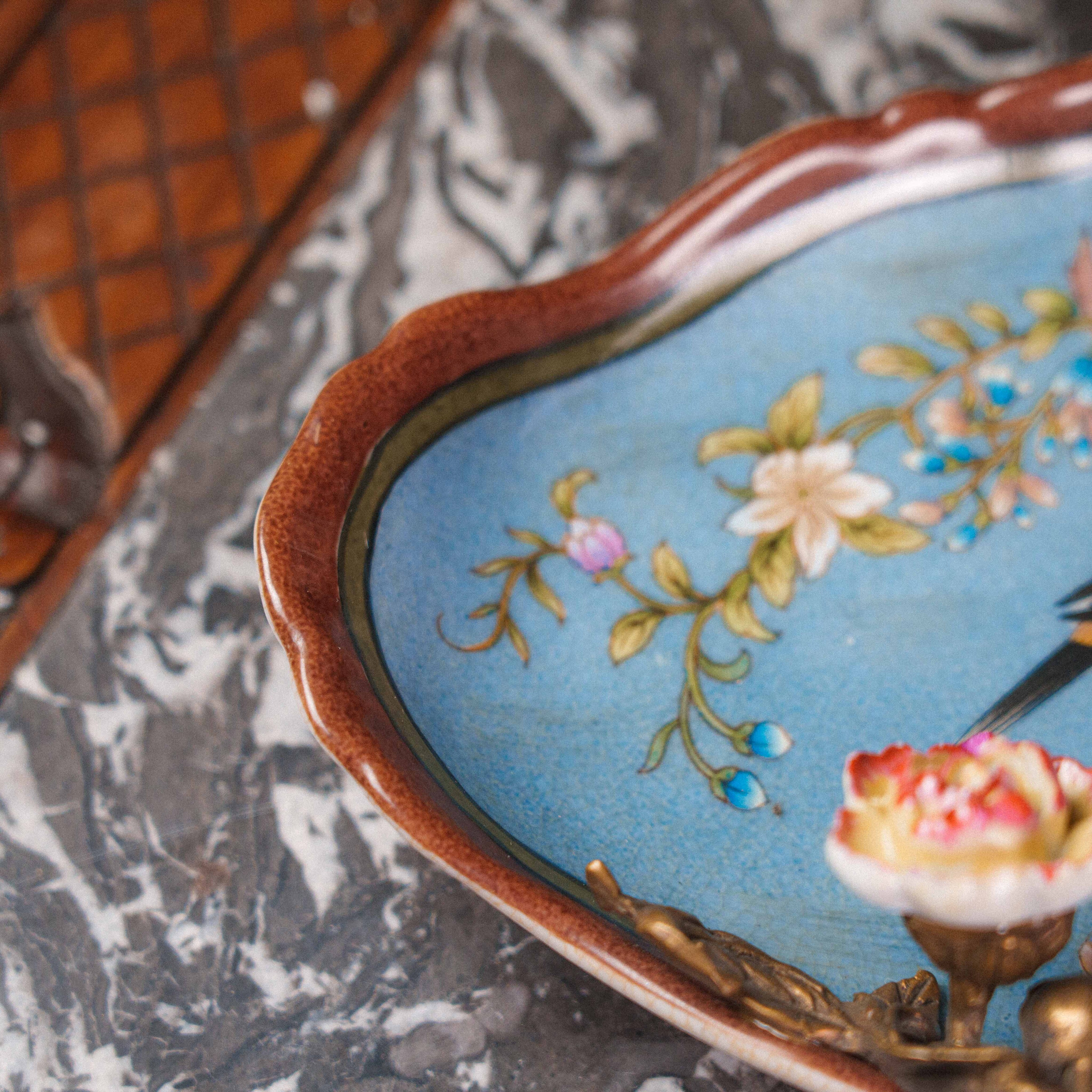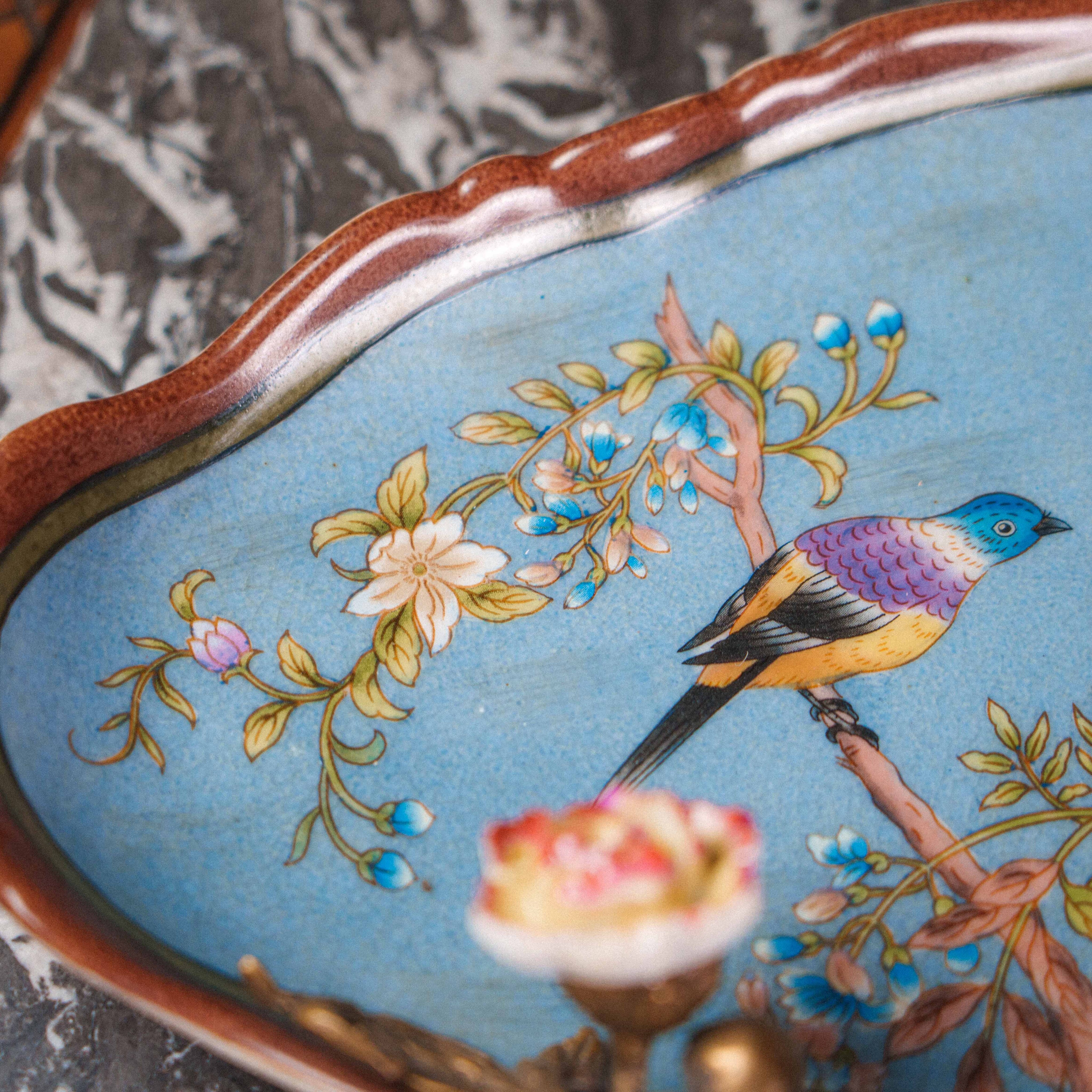 Изящная фруктовница в восточном стиле — предмет, в котором тонкость ручной росписи сочетается с поэтичной символикой природы. Фарфоровое блюдо небесно-голубого оттенка украшено живописными цветущими ветвями, птицами и хризантемами — символами радости, благополучия и долголетия. В центре композиции — объёмная декоративная ветвь из бронзы с утончёнными листьями и бутонами, на которой покоится фарфоровая цикада, воплощающая пробуждение и вечный цикл жизни. Каждая деталь продумана до мелочей: от плавных линий лепестков до лёгкого блеска позолоты, создающего игру света.